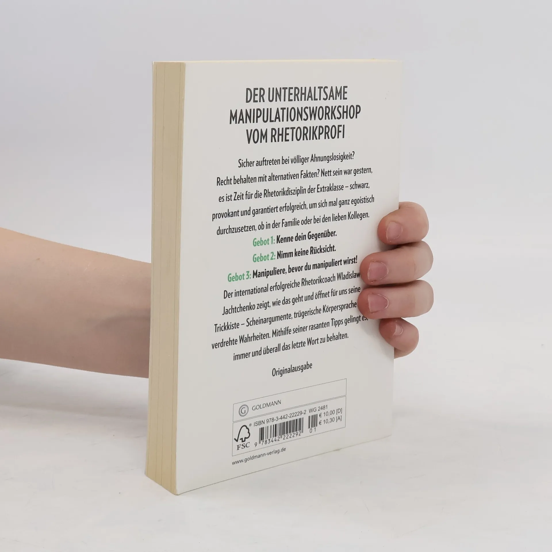 Der unterhaltsame Manipulationsworkshop vom Rhetorik-Profi. Sicher auftreten bei völliger Ahnungslosigkeit? Recht behalten mit alternativen Fakten? Nett sein war gestern, es ist Zeit für die Rhetorik-Disziplin der Extraklasse – schwarz, provokant und garantiert erfolgreich, um sich mal ganz egoistisch durchzusetzen, ob in Beruf oder Familie. Gebot 1: Kenne dein Publikum. Gebot 2: Nimm keine Rücksicht. Gebot 3: Manipuliere, bevor du manipuliert wirst! Der Rhetorik-Profi Wladislaw Jachtchenko zeigt, wie das geht und öffnet seine Trickkiste, gefüllt mit Scheinargumenten, trügerischer Körpersprache und verdrehten Wahrheiten. Mithilfe seiner Übungen gelingt es, immer und überall das letzte Wort zu haben.