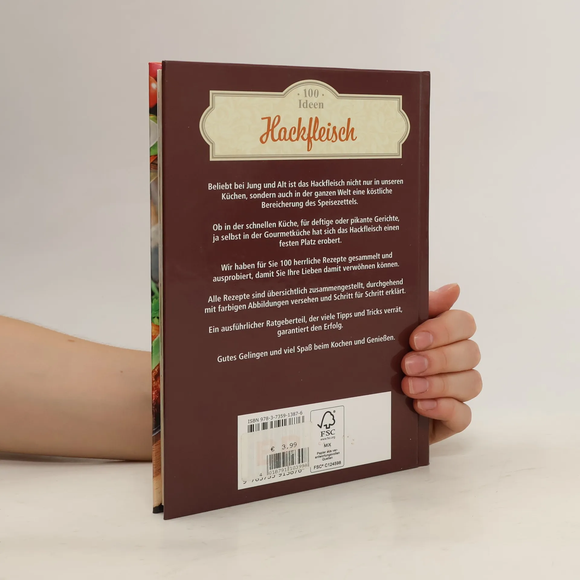 Beliebt bei Jung und Alt ist das Hackfleisch nicht nur in unseren Kuchen, sondern auch in der ganzen Welt eine kostliche Bereicherung des Speisezettels. OB in der schnellen Kuche, fur deftige oder pikante Gerichte, ja selbst in der Gourmet kuche hat sich das Hackfleisch einen festen Platz erobert. WIr haben fur Sie 100 herr liche Rezepte gesammelt und aus probiert, damit Sie Ihre Lieben damit ver wohnen konnen. ALle Rezepte sind ubersichtlich zusammengestellt, durchgehend mit farbigen Schritt erklart. EIn ausfuhrlicher Ratgeberteil, durchgehend mit farbigen