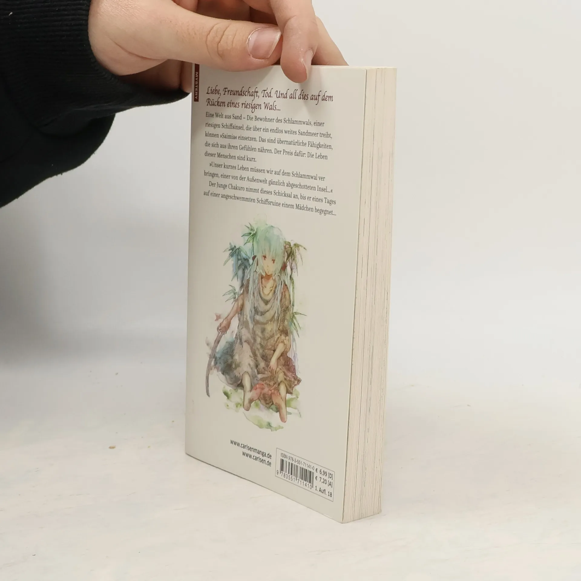 Komm mit in eine außergewöhnliche Welt, in der Liebe, Freundschaft und Tod dicht beeinander liegen... Eine Welt aus Sand – Die Bewohner des Schlammwals, einer riesigen Schiffsinsel, die über ein endlos weites Sandmeer treibt, können »Saimia« einsetzen. Das sind übernatürliche Fähigkeiten, die sich aus ihren Gefühlen nähren. Der Preis dafür: Die Leben dieser Menschen sind kurz. »Unser kurzes Leben müssen wir auf dem Schlammwal verbringen, einer von der Außenwelt gänzlich abgeschotteten Insel…« Der Junge Chakuro nimmt dieses Schicksal an, bis er eines Tages auf einer angeschwemmten Schiffsruine einem Mädchen begegnet… Perfekt für Fans von „The Promised Neverland“ und magischen Geschichten voller Geheimnisse und Fantasie! Weitere Informationen: - Abgeschlossen in 23 Bänden - Anime-Adaption auf Netflix - Empfohlen für Leser*innen ab 12 Jahren - Detailreiche, wunderschöne Zeichnungen