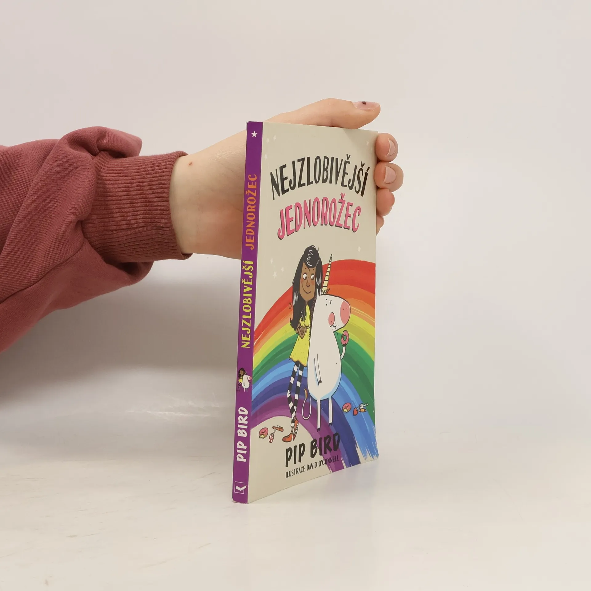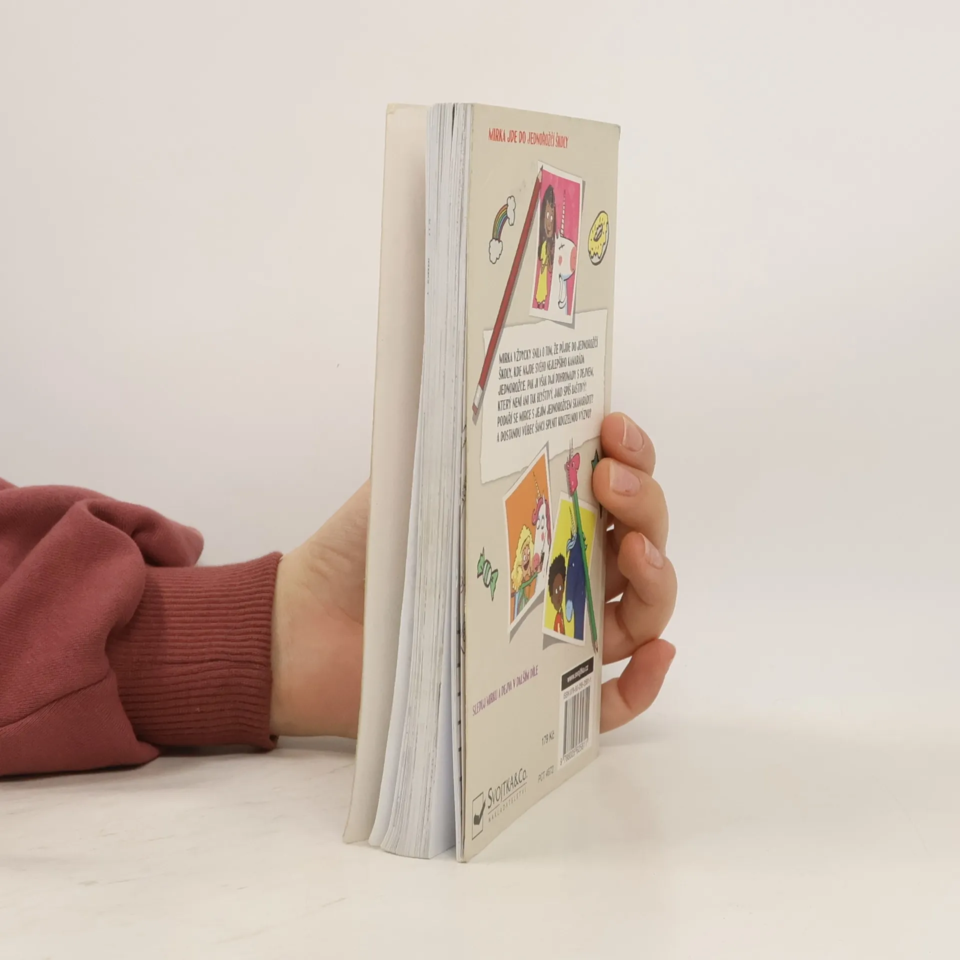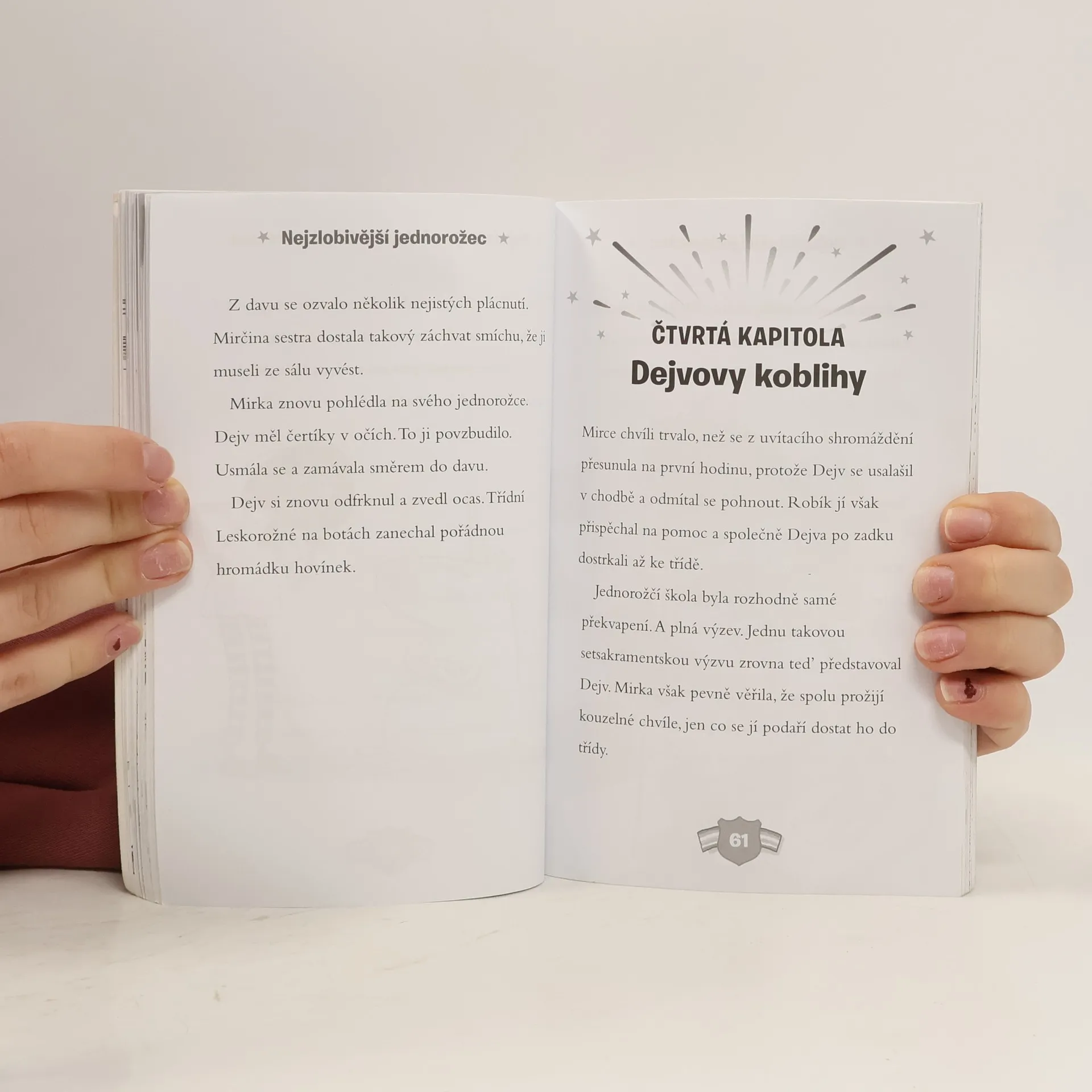 - Kam se jednorožec nikdy neschová? - Za roh. Mirka Duhajská je docela obyčejná holka, na kterou ale čeká neobyčejné dobrodružství. Dostala totiž pozvánku na Jednorožčí školu! Mirku toho rána, kdy otevřela zvací obálku, zaplavil pocit ohromného vzrušení odjakživa totiž snila o vlastním jednorožci. Když nadešel ten den a Mirka proletěla kouzelnou branou na parkovišti u zábavního parku a dopadla na přistávací stoh, byla rozhodnutá, že tohle bude nejbáječnější období v jejím životě. Jednorožčí škola s věžičkami a hodinovou věží tak trochu připomínala zámek a hned vedle stály stáje pro jednorožce. Mirka byla plná očekávání z toho, jakého jednorožce jí přidělí. Těšila se na svého nového jednorožčího kamaráda tak moc, až to bylo skoro k nevydržení. A pak se to stalo: na kouzelném svitku se objevilo jméno jejího jednorožčího parťáka: Dejv. Mirka nemohla uvěřit vlastním očím, když do sálu vpochodoval ten nejmenší a nejzavalitější jednorožec, jakého si dokážete představit. Mirka jen zírala. Měl trochu pupek a namísto hřívy spíš slámu, která trčela na všechny strany. Nerudně se mračil a ani trochu se netřpytil. Dokáže se Mirka spřátelit s tímto podivným jednorožcem? Jak je možné, že ji už od prvního dne ve škole provázejí jen samé problémy? Její nový parťák jí totiž pobyt v Jednorožčí škole vůbec neusnadňuje. Mirku tak čeká množství výzev, kterým se bude muset postavit čelem.