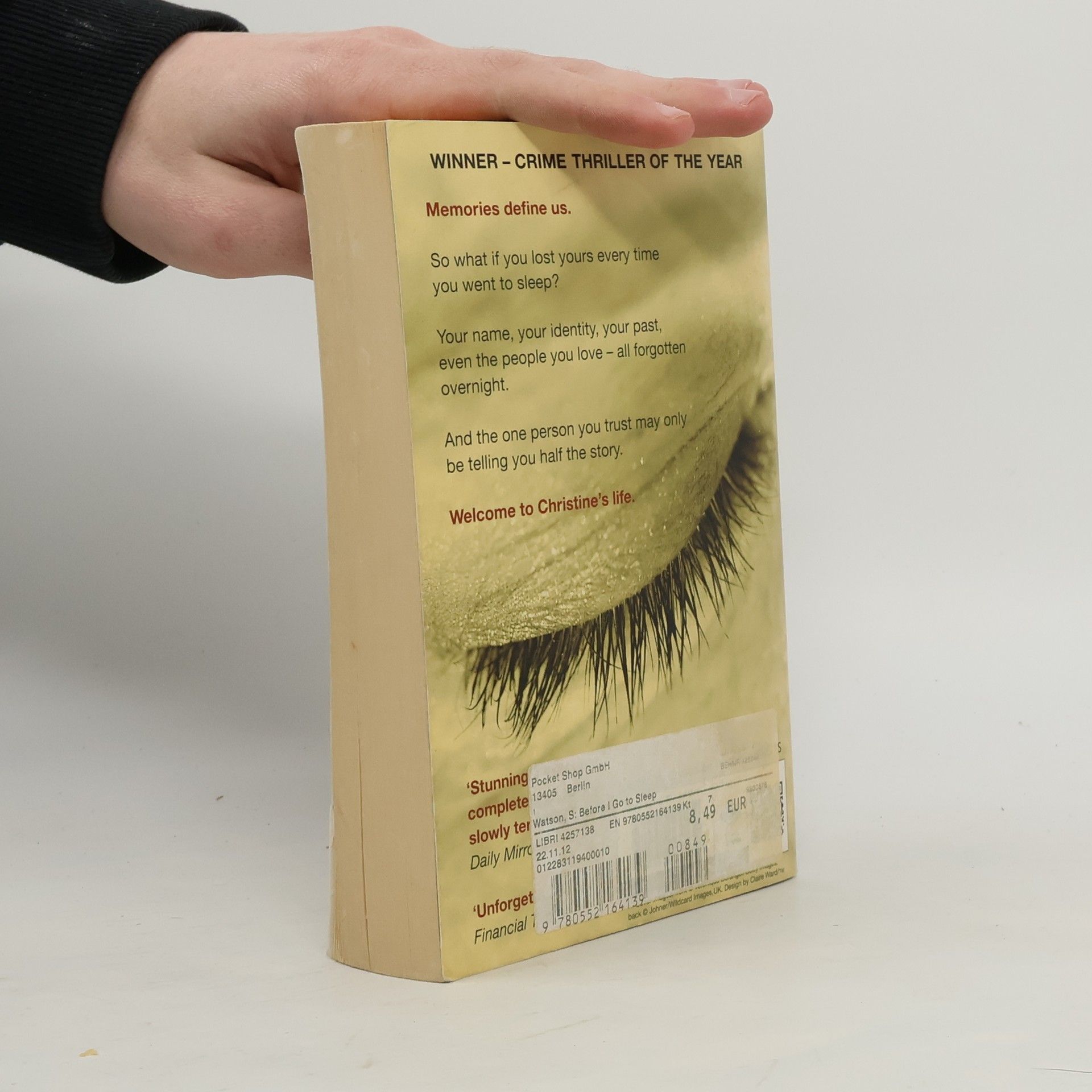 Discover the haunting and deeply chilling debut thriller which has now sold more than six million copies worldwide. Memories define us. So what if you lost yours every time you went to sleep? Your name, your identity, your past, even the people you love - all forgotten overnight. And the one person you trust may only be telling you half the story. Welcome to Christine's life. ______________ PRAISE FOR BEFORE I GO TO SLEEP: 'A cracking good thriller' Lionel Shriver 'Thrillers seldom come much better than this. Loved it' Joanne Harris 'So high-concept, so ambitious and so structurally brilliant' Sophie Hannah 'A deeply unsettling debut that asks the most terrifying question - what do you have left when you lose yourself?' Val McDermid 'I loved it from start to finish' Mo Hayder 'Brilliant in its pacing, profound in its central question, suspenseful on every page' Anita Shreve 'Quite simply the best debut novel I've ever read' Tess Gerritsen
