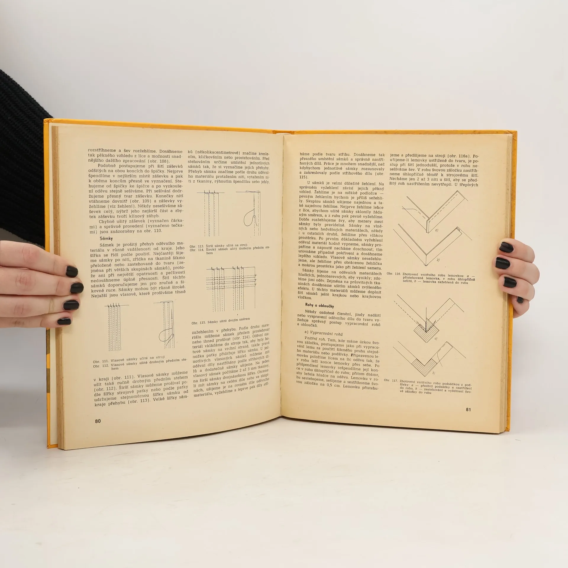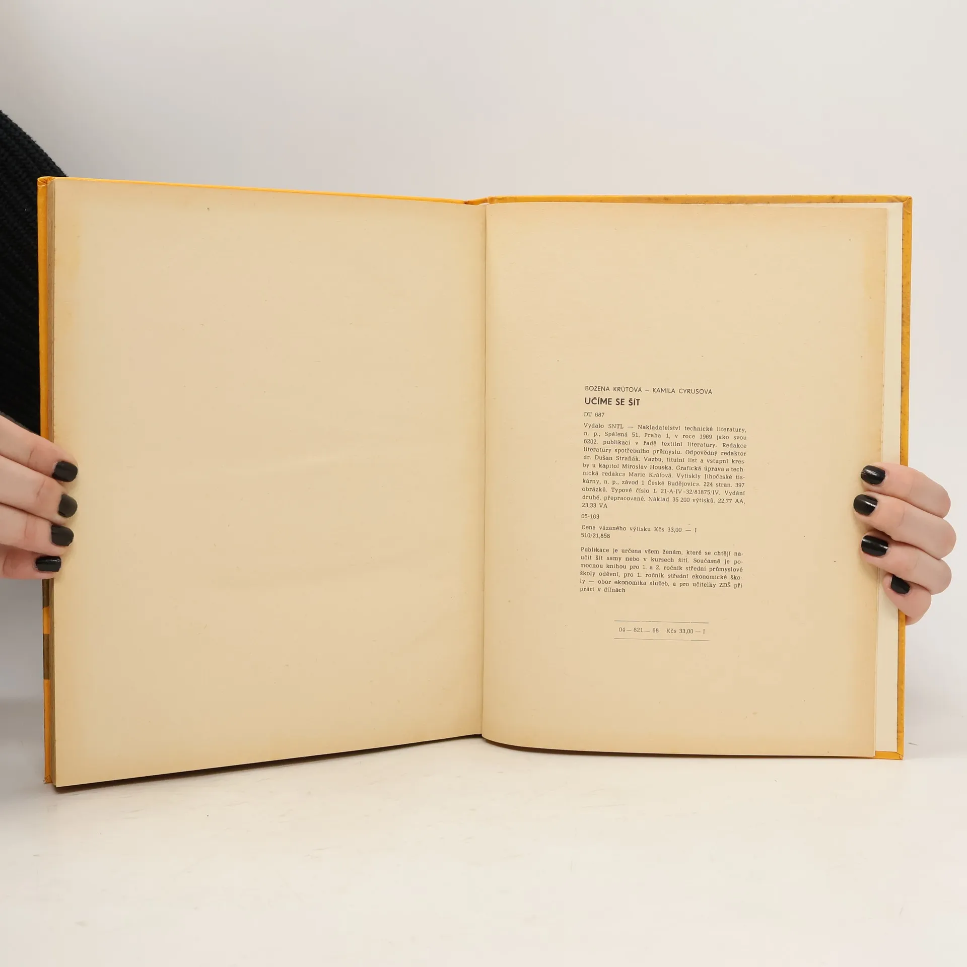 Pomocná kniha pro 1. a 2. roč. prům. školy oděvní v Praze a pro učitelky prací v domácnosti na všeobec. vzdělávacích školách. Podrobný popis jednotlivých pracovních postupů při zhotovování oděvů až ke konečné úpravě hotového výrobku s názornými obrázky. Úvodní kapitoly jsou věnovány nejrůznějším krejčovským pomůckám, seřizování i údržbě šicího stroje a zhotovování základních střihů.
