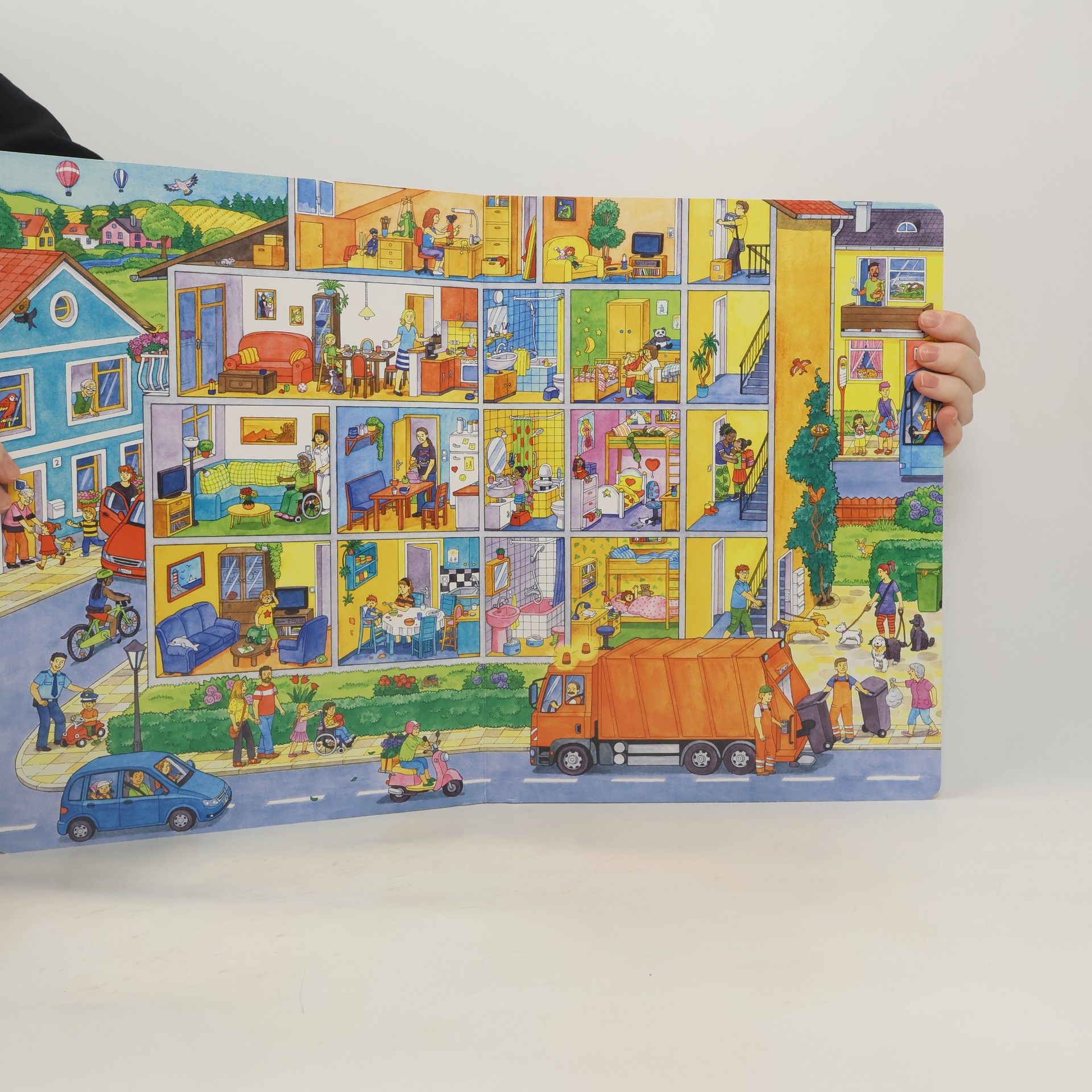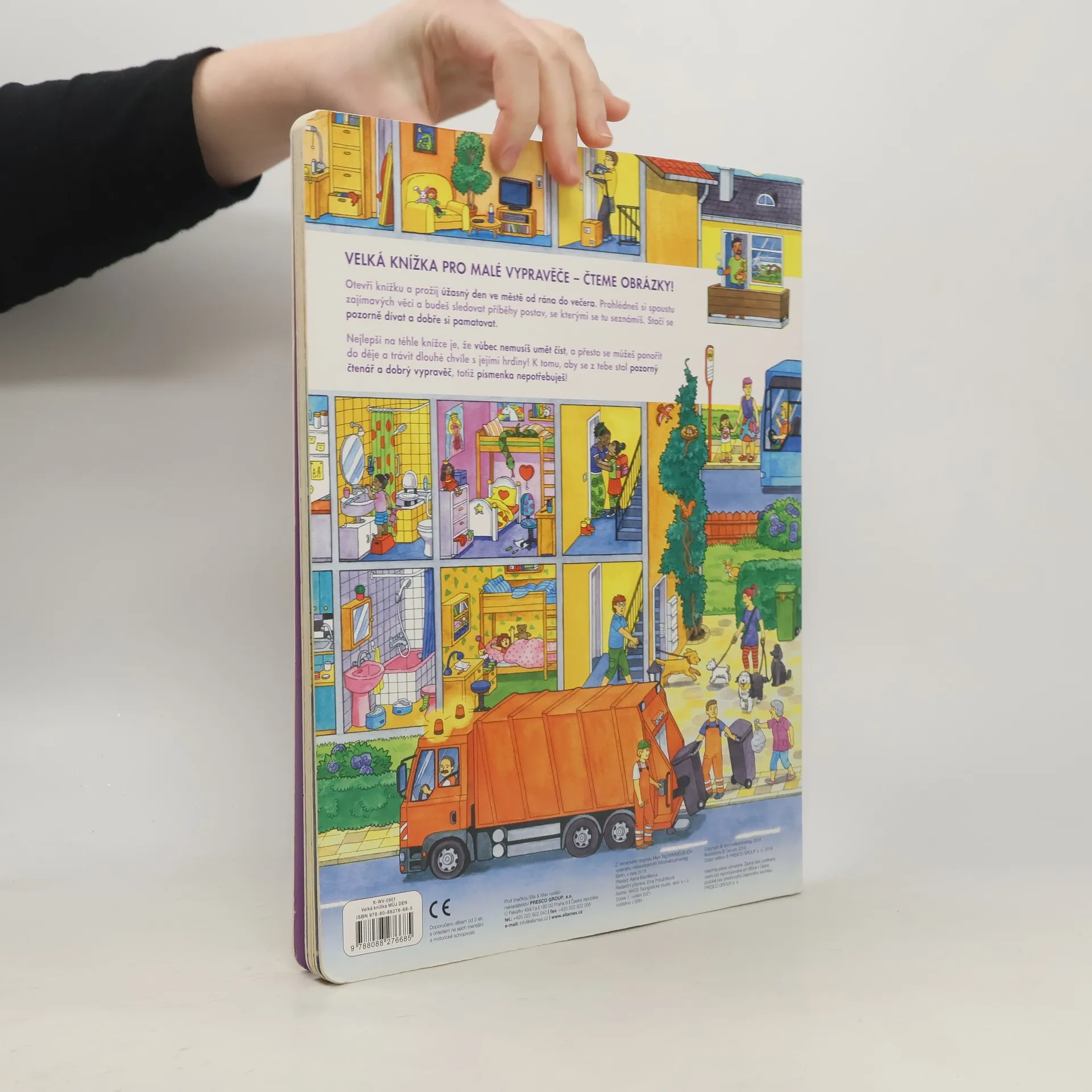 Velká knížka pro malé vypravěče - čteme obrázky! Otevři knížku a prožij úžasný den ve městě od rána do večera. Prohlédneš si spoustu zajímavých věcí a budeš sledovat příběhy postav, se kterými se tu seznámíš. Stačí se pozorně dívat a dobře si pamatovat. Nejlepší na téhle knížce je, že vůbec nemusíš umět číst, a přesto se můžeš ponořit do děje a trávit dlouhé chvíle s jejími hrdiny! K tomu, aby se z tebe stal pozorný čtenář a dobrý vypravěč, totiž písmenka nepotřebuješ!