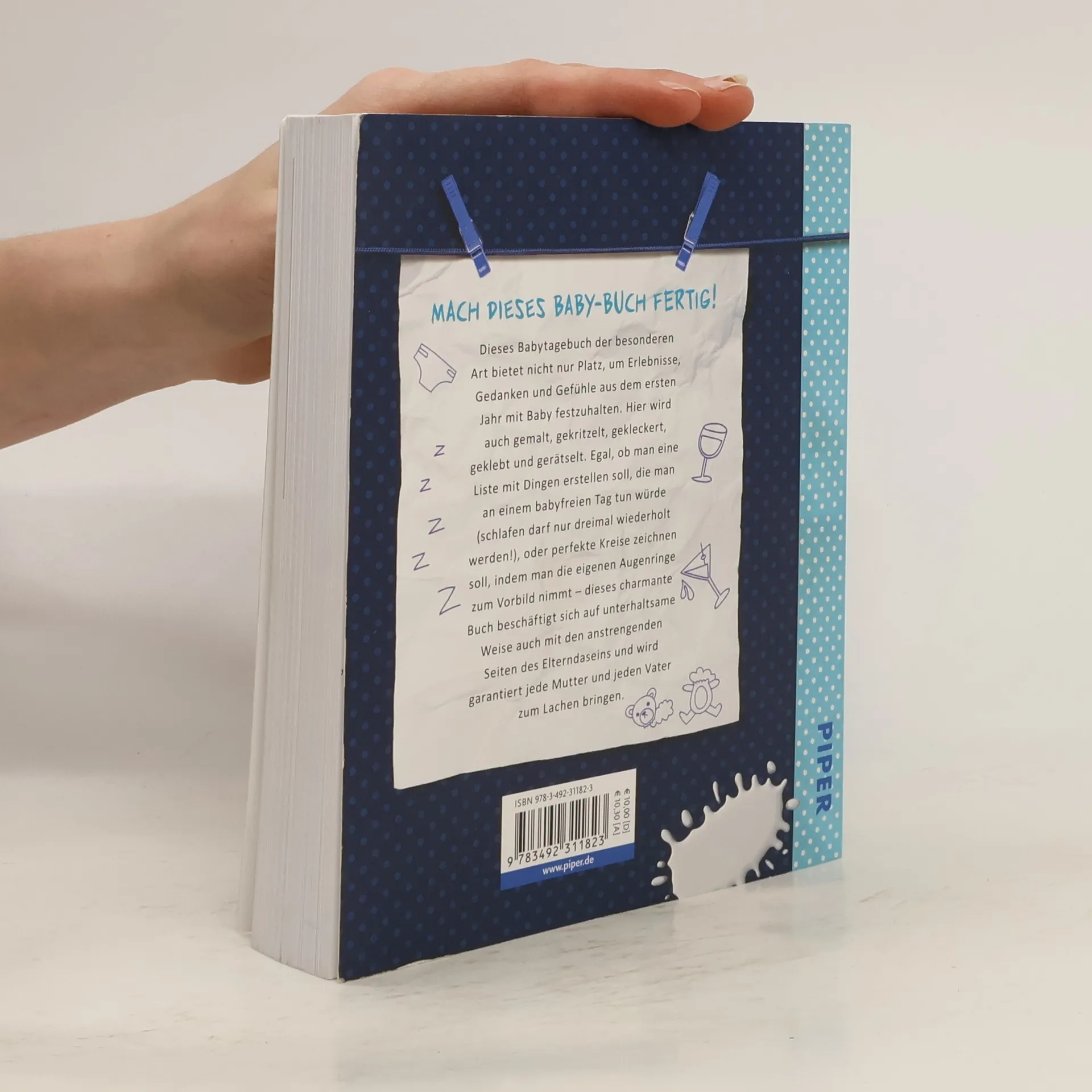 Mach dieses Baby-Buch fertig! Dieses Babytagebuch der besonderen Art bietet nicht nur Platz, um Erlebnisse, Gedanken und Gefühle aus dem ersten Jahr mit Baby festzuhalten. Hier wird auch gemalt, gekritzelt, gekleckert, geklebt und gerätselt. Egal, ob man eine Liste mit Dingen erstellen soll, die man an einem babyfreien Tag tun würde (schlafen darf nur dreimal wiederholt werden!), oder perfekte Kreise zeichnen soll, indem man die eigenen Augenringe zum Vorbild nimmt – dieses charmante Buch beschäftigt sich auf unterhaltsame Weise auch mit den anstrengenden Seiten des Elterndaseins und wird garantiert jede Mutter zum Lachen bringen.