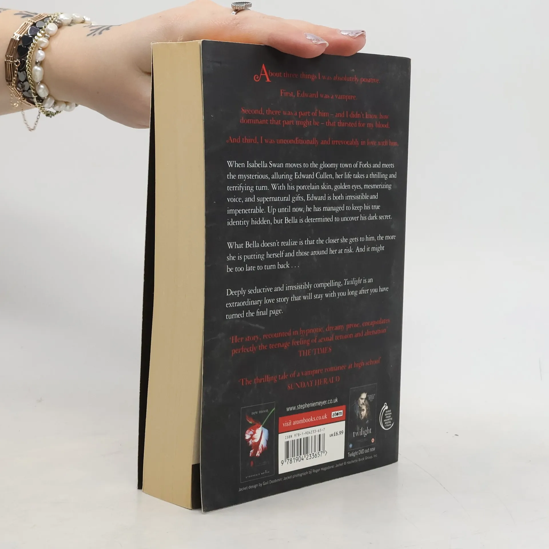 When Isabella Swan moves to the gloomy town of Forks and meets the mysterious, alluring Edward Cullen, her life takes a thrilling and terrifying turn. With his porcelain skin, golden eyes, mesmerizing voice, and supernatural gifts, Edward is both irresistible and impenetrable. Up until now, he has managed to keep his true identity hidden, but Bella is determined to uncover his dark secret. What Bella doesn't realize is that the closer she gets to him, the more she is putting herself and those around her at risk. And it might be too late to turn back ... --back cover