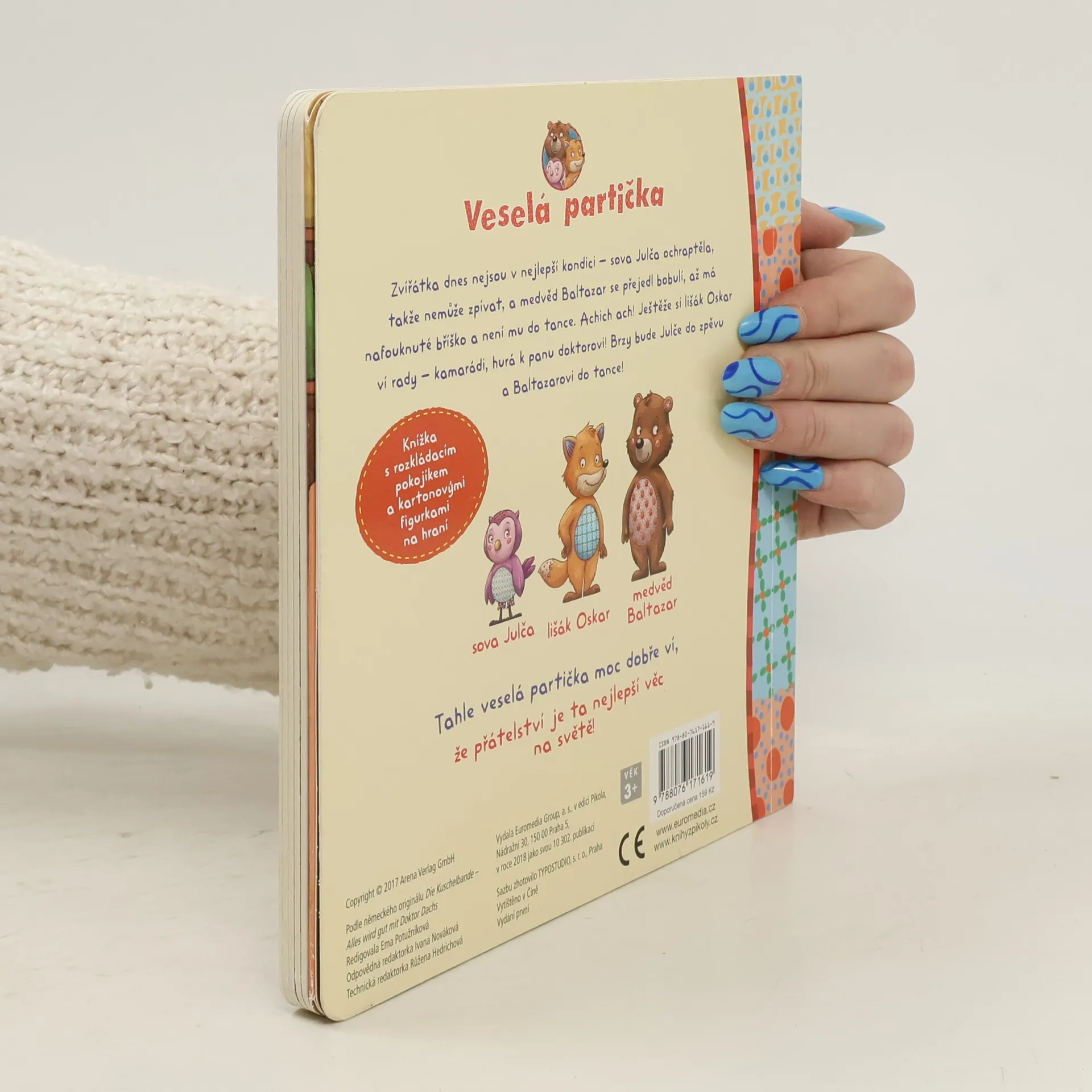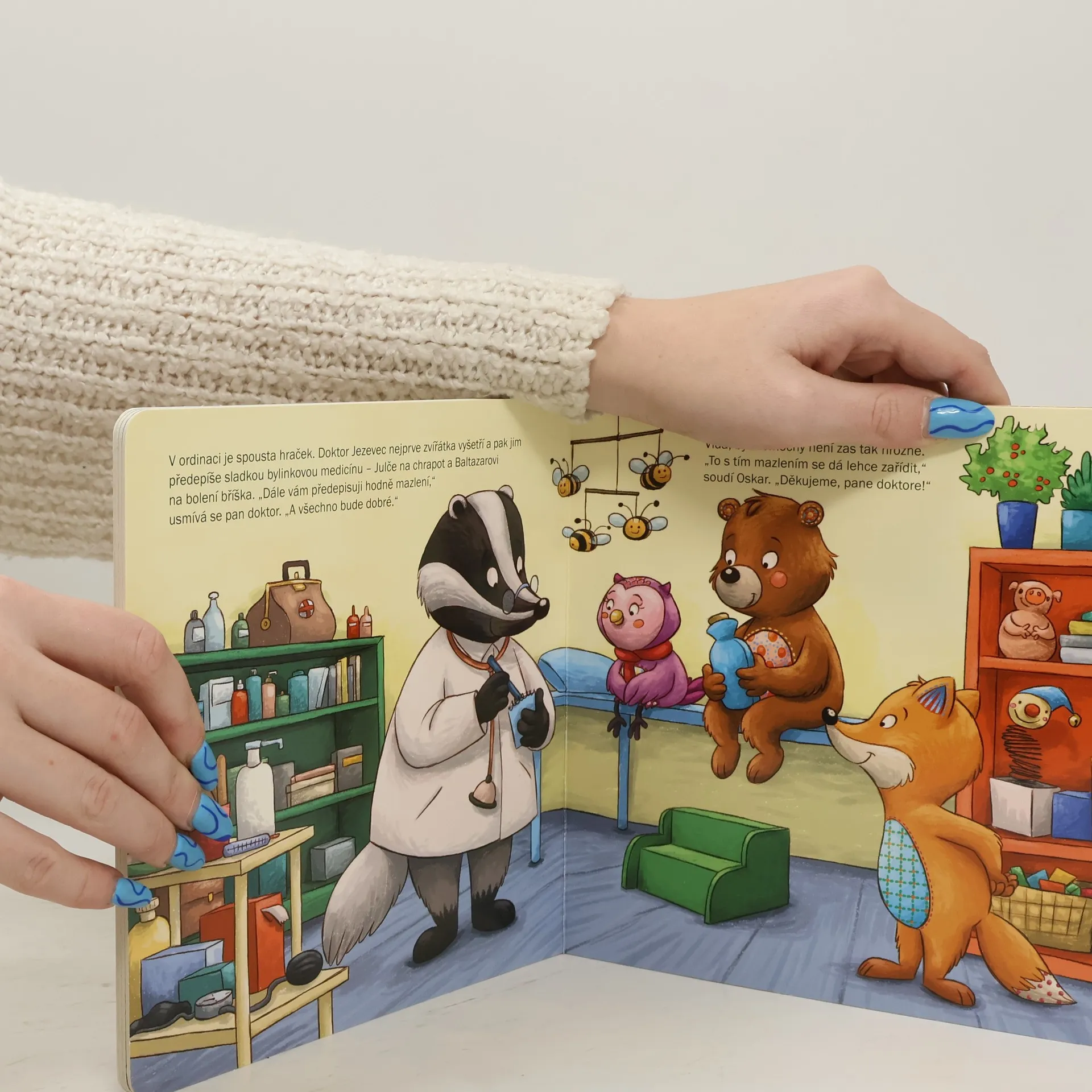 Kamarádi sova Julča, medvěd Baltazar a lišák Oskar dnes nejsou v kondici: Julča ochraptěla, takže nemůže zpívat, a medvěd se přejedl bobulí, takže mu není do tance. Achich ach! Ještěže lišák Oskar si ví rady – kamarádi, hurá k panu doktorovi! Brzy bude Julče zase do zpěvu a Baltazarovi do tance! -Půvabná knížka s rozkládacím pokojíkem a kartonovými figurkami na hraní potěší všechny nejmenší děti.