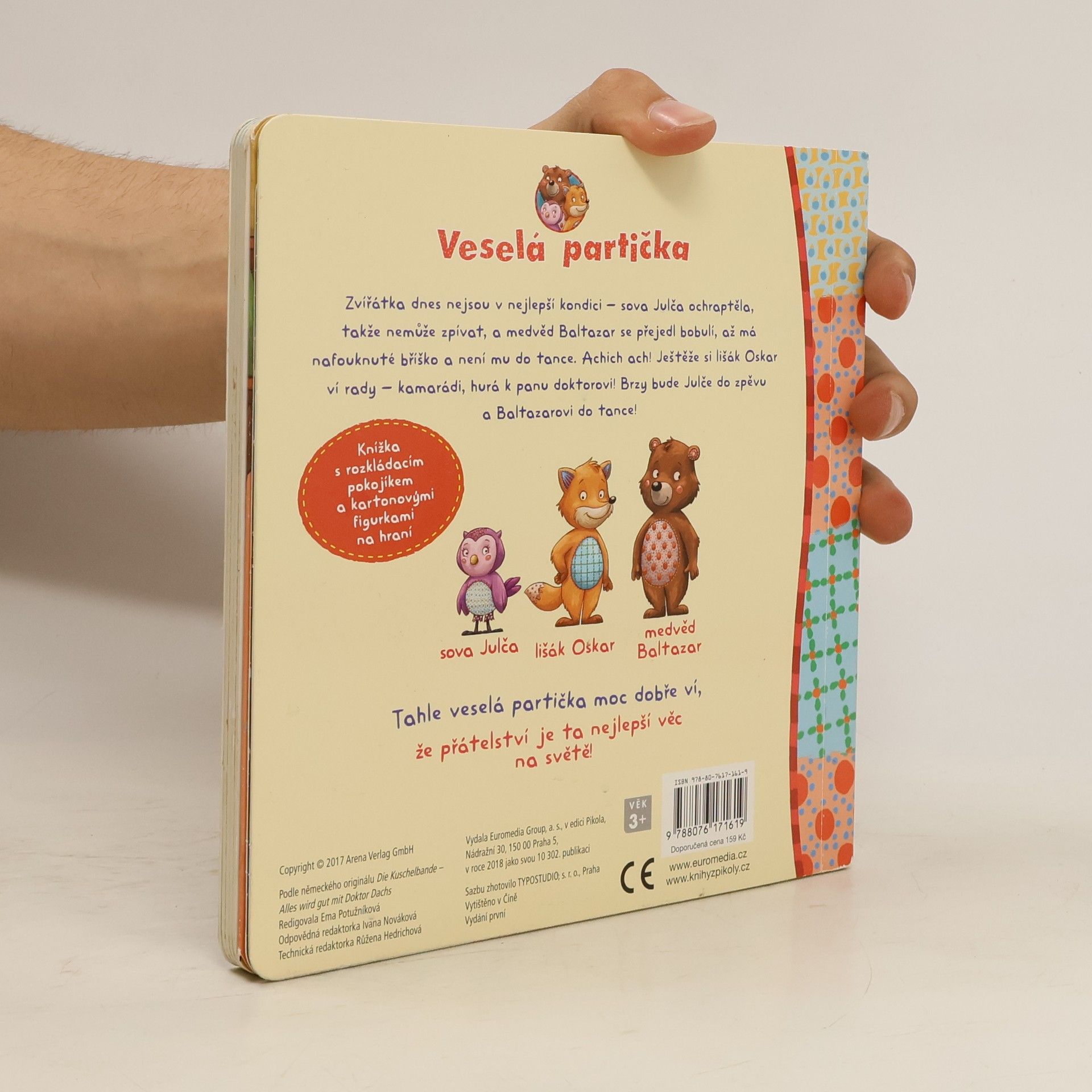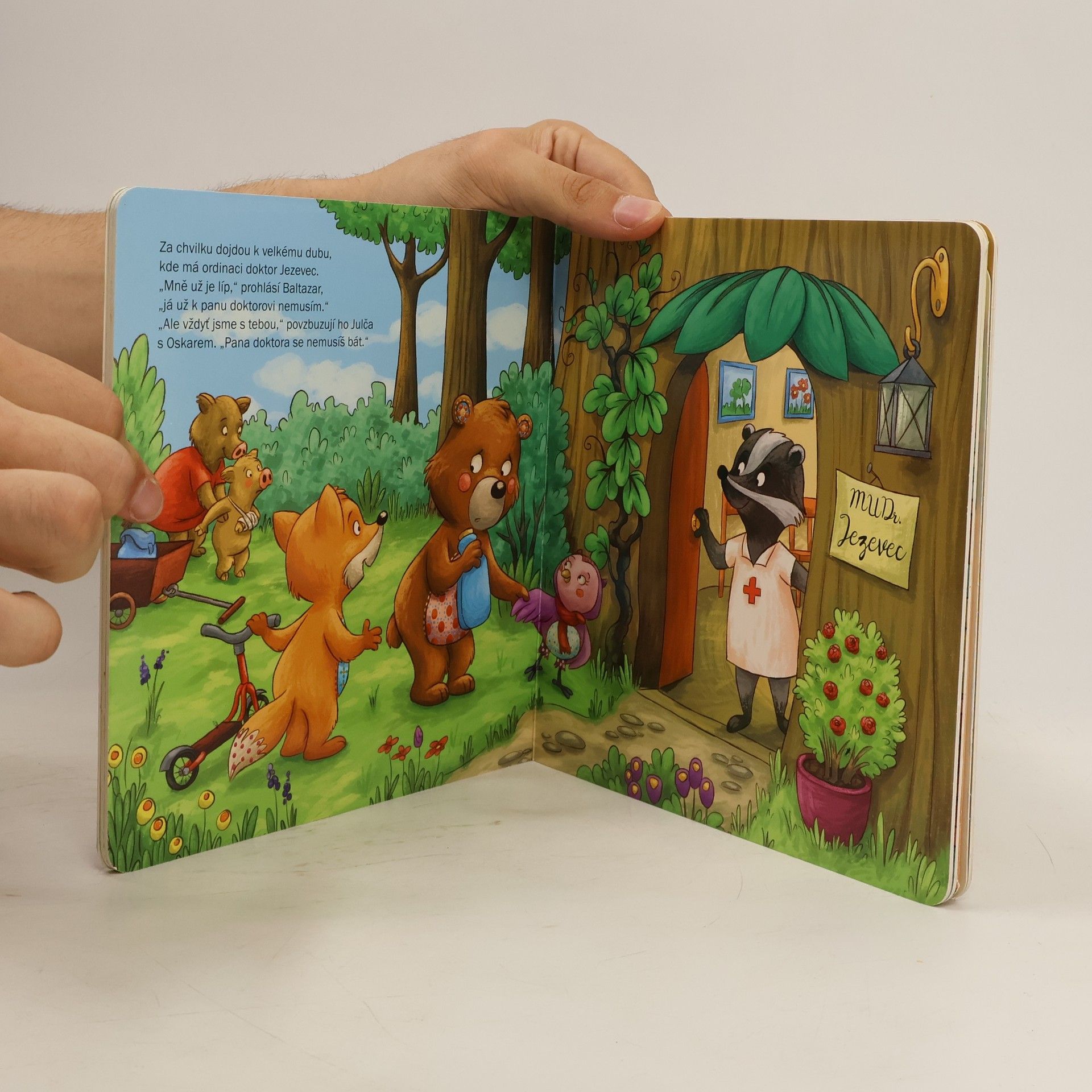 Kamarádi sova Julča, medvěd Baltazar a lišák Oskar dnes nejsou v kondici: Julča ochraptěla, takže nemůže zpívat, a medvěd se přejedl bobulí, takže mu není do tance. Achich ach! Ještěže lišák Oskar si ví rady – kamarádi, hurá k panu doktorovi! Brzy bude Julče zase do zpěvu a Baltazarovi do tance! -Půvabná knížka s rozkládacím pokojíkem a kartonovými figurkami na hraní potěší všechny nejmenší děti.
