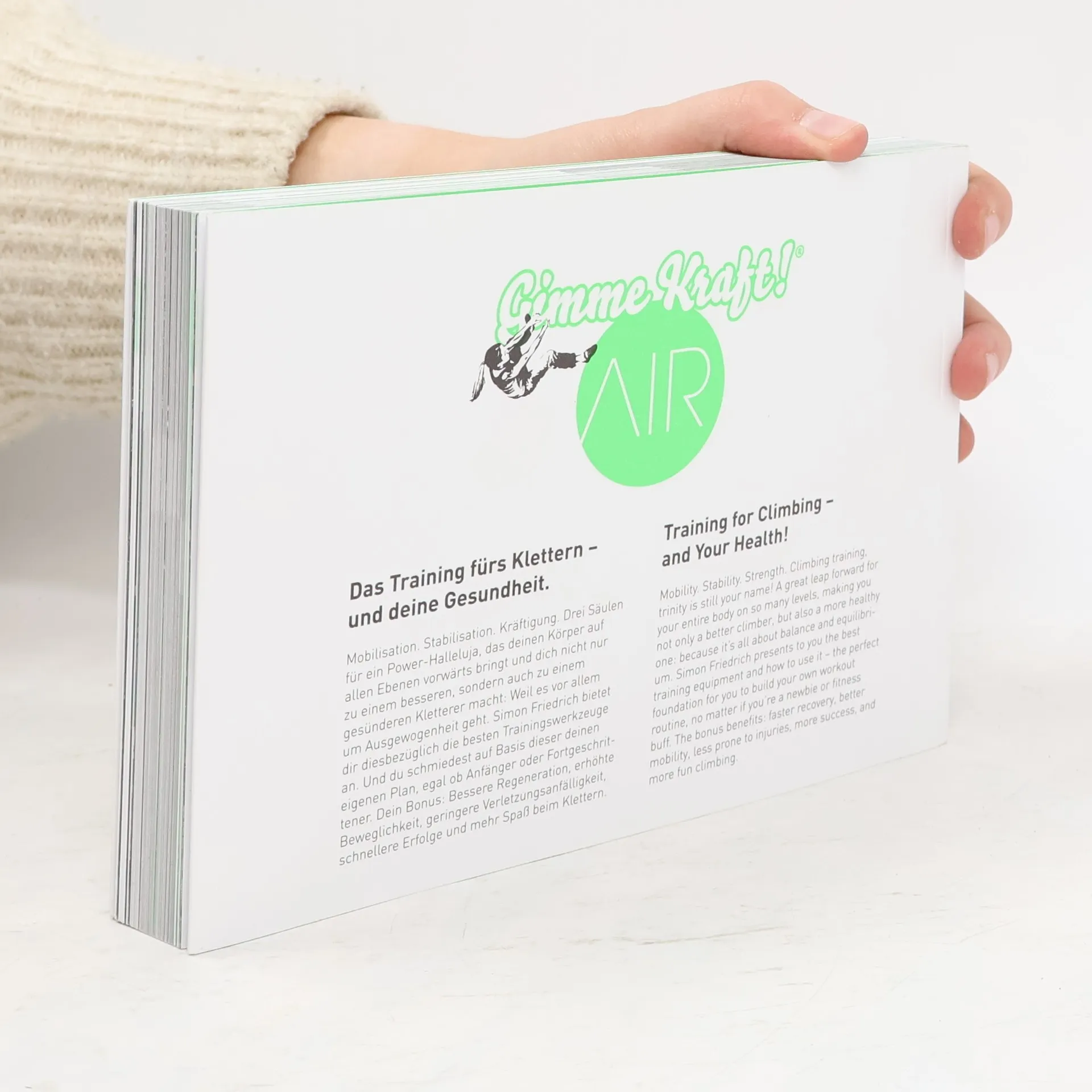 Klettere besser, fühle Dich besser. Klettertraining trifft Gesundheit! MOBILISATION. STABILISATON. KRÄFTIGUNG. Drei Säulen für ein Power-Halleluja, das Deinen Körper auf allen Ebenen vorwärts bringt und Dich nicht nur zu einem besseren, sondern auch zu einem gesünderen Kletterer macht: Weil es vor allem um Ausgewogenheit geht. Simon Friedrich, unser Physiotherapeut, bietet Dir diesbezüglich die besten Trainingswerkzeuge an. Und Du schmiedest auf dieser Basis Deinen eigenen Plan, egal ob Anfänger oder Fortgeschrittener. Dein Bonus: Bessere Regeneration, erhöhte Beweglichkeit, geringere Verletzungsanfälligkeit, schnellere Erfolge und mehr Spaß beim Klettern. Alle Details hier: www. gimmekraft. com