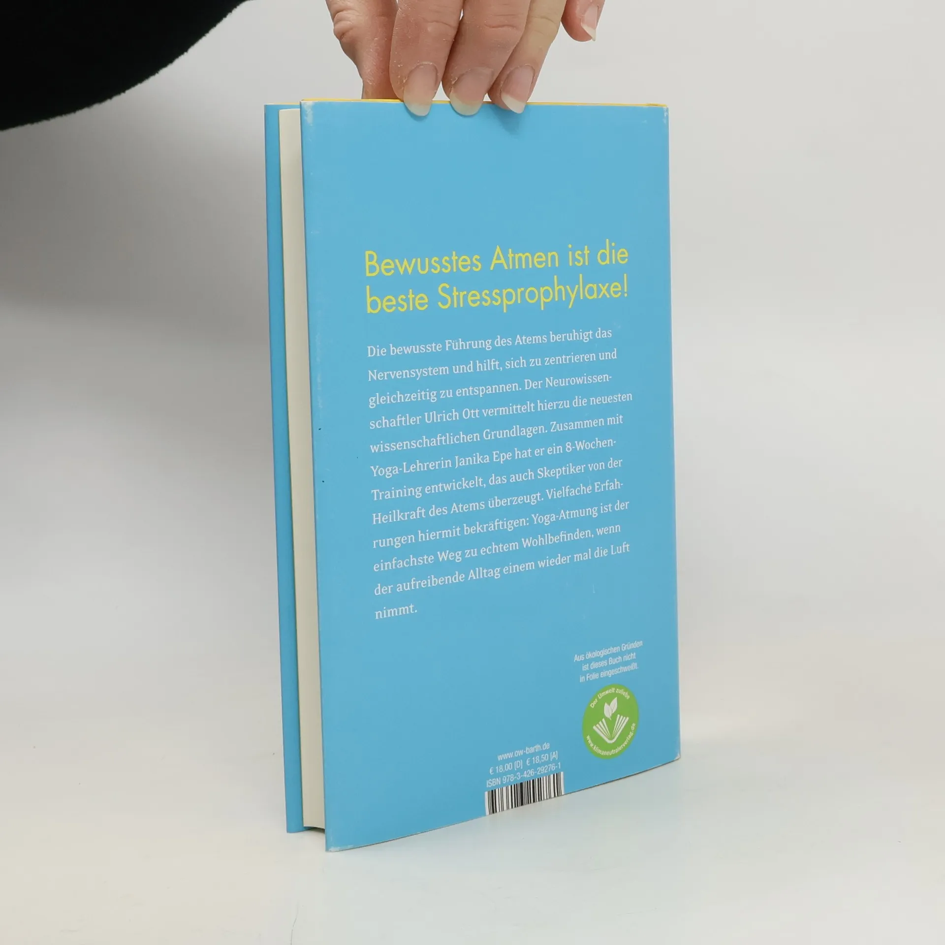 Bewusstes Atmen ist eine hervorragende Stressprophylaxe! Mit den wissenschaftlich erprobten Übungen dieses Ratgebers kann man sein Wohlbefinden deutlich steigern. Die Neurowissenschaftler Ulrich Ott und Janika Epe zeigen, dass eine gezielte und regelmäßige Atem-Praxis nachhaltig das Wohlbefinden fördert. Die Lenkung, Vertiefung und Verlangsamung des Atems führt nachweislich zu einer Beruhigung des Nervensystems und hilft der Psyche, sich zu zentrieren und gleichzeitig zu entspannen. Mit ihrem einfachen und effizienten 8-Wochen-Training kann jeder sofort einsteigen und sich danach selbst Übungen auswählen, die er weiter in seinen Alltag einbindet. Basierend auf Kernübungen der Atem-Praxis des Yoga (Pranayama) wie zum Beispiel der Yoga-Vollatmung oder der wechselseitigen Nasenatmung geben die beiden Forscher und Yoga-Lehrer eine fundierte und präzise Technik an die Hand. Mit Hilfe dieser Atem-Techniken kann man mindestens einmal täglich in ein tiefes Wohlbefinden eintauchen, das die Gesundheit nachhaltig fördert und zu einer steigenden Lebensqualität beiträgt. Ein 8-Wochen-Training mit anschaulichen Fotoillustrationen plus eigener Webseite mit Protokollbögen zum Trainingsablauf, Audio-Dateien für die Atemführung und Video-Anleitungen.