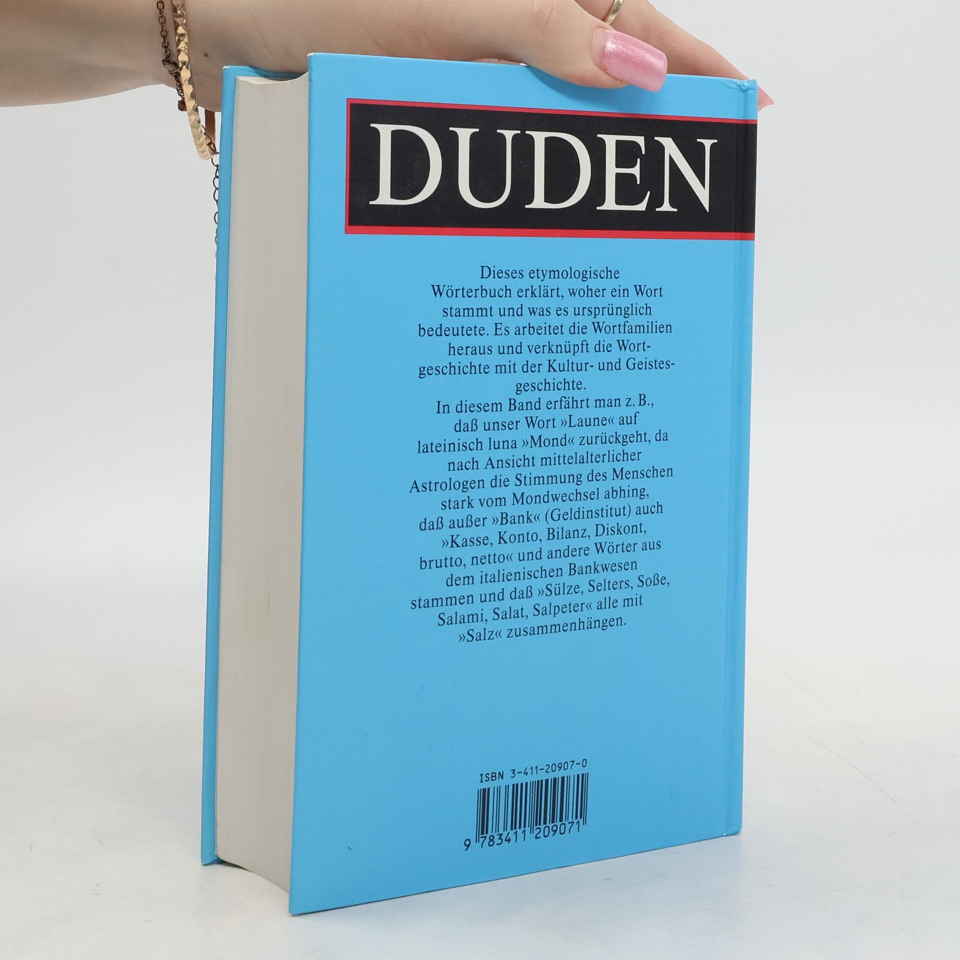 La quatrième de couverture indique : "Dieses etymologische Wörterbuch erklärt, woher ein Wort stammt und was es ursprünglich bedeutete. Es arbeitet die Wortfamilien heraus und verknüpft die Wortgeschichte mit der Kultur- und Geistesgeschichte. In diesem Band erfährt man z. B., dass unser Wort " Laune" auf lateinisch luna "Mond' zurückgeht, da nach Ansicht mittelalterlicher Astrologen die Stimmung des Menschen stark vom Mondwechsel abhing, dass ausser "Bank" (Geldinstitut) auch "Kasse, Konto, Bilanz, Diskoont, brutto, netto" und andere Wörter aus dem italienischen Bankwesen stammen und dass "Sülze, Selters, Sosse, Salami, Salat, Salpeter" alle mit "Salz" zusammenhängen."
