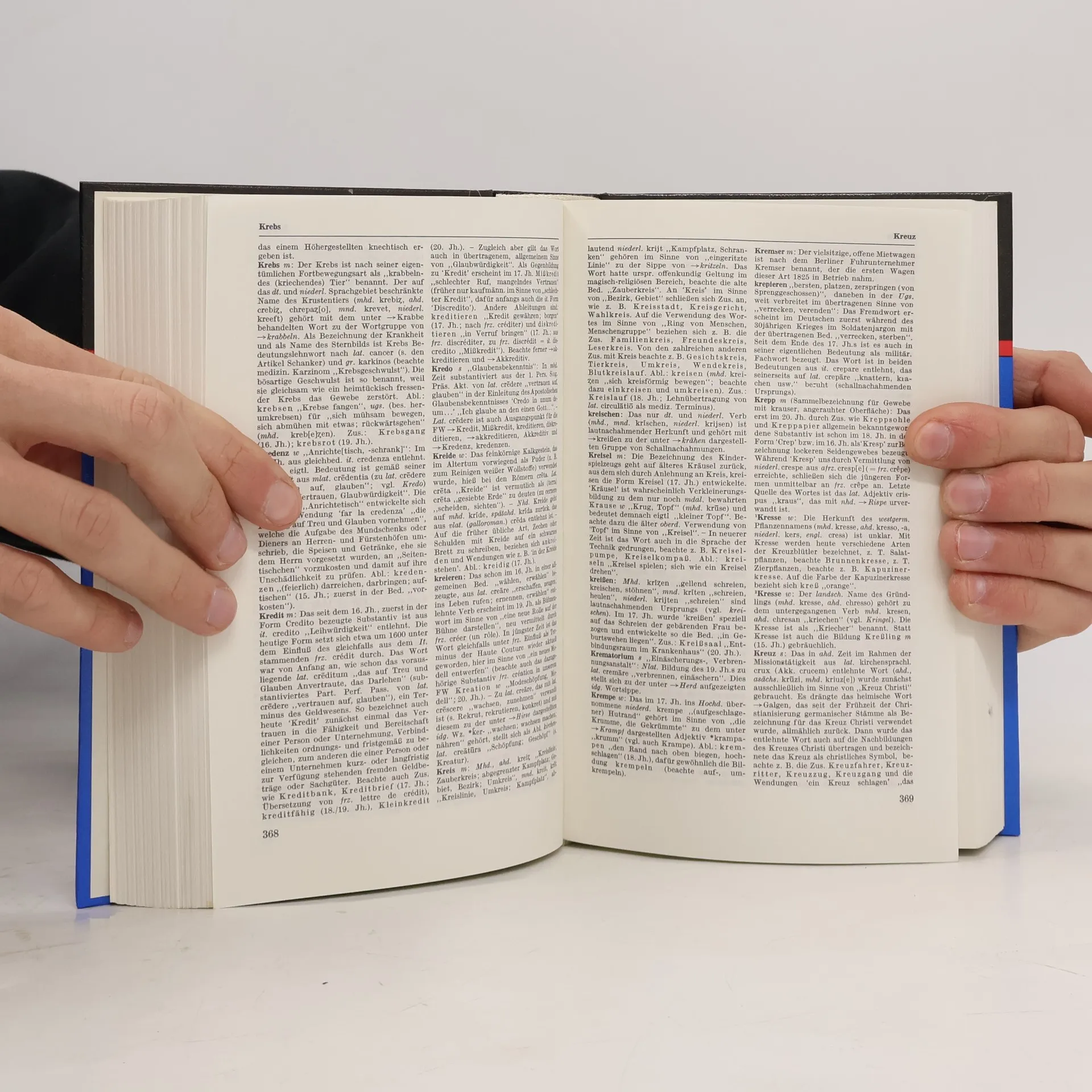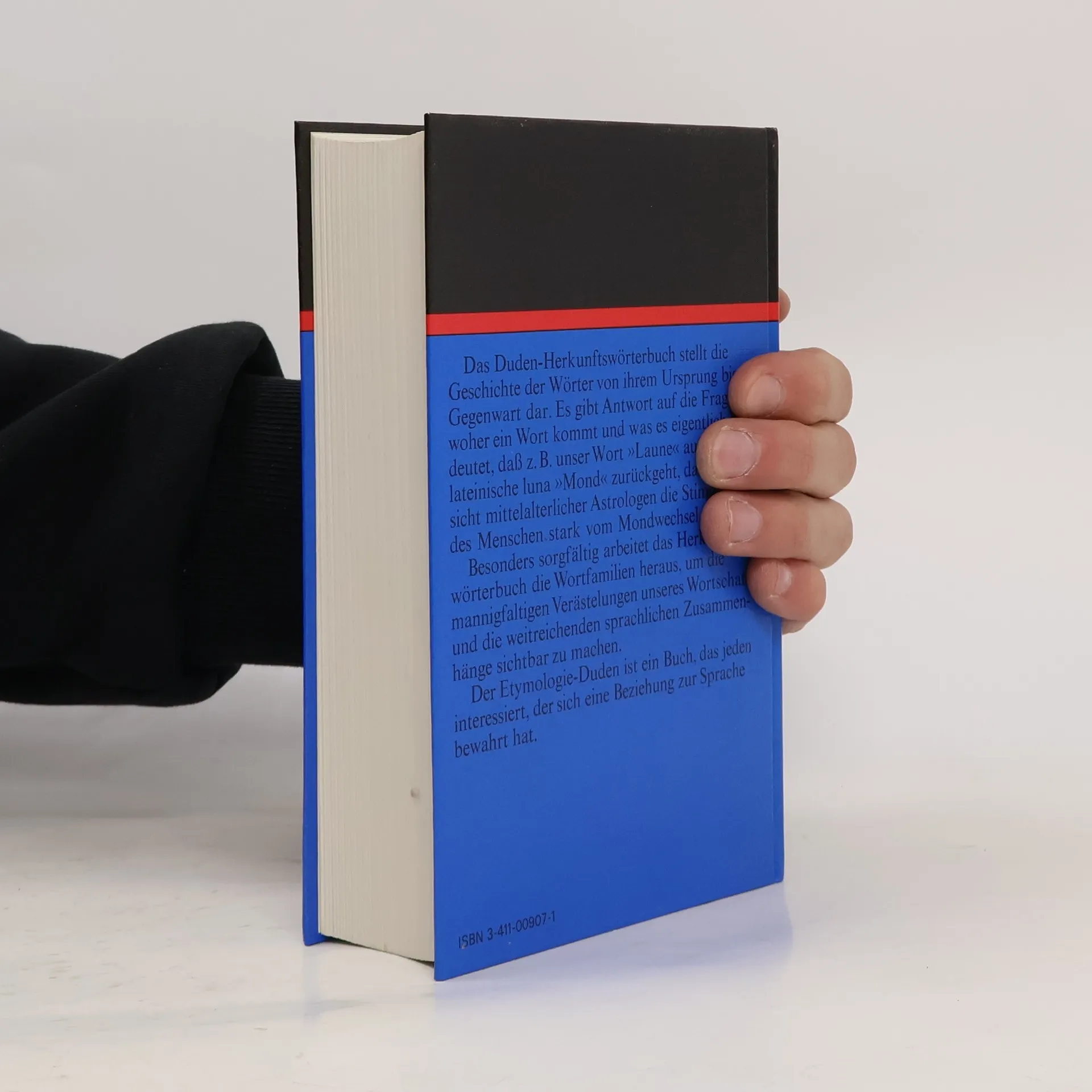 La quatrième de couverture indique : "Dieses etymologische Wörterbuch erklärt, woher ein Wort stammt und was es ursprünglich bedeutete. Es arbeitet die Wortfamilien heraus und verknüpft die Wortgeschichte mit der Kultur- und Geistesgeschichte. In diesem Band erfährt man z. B., dass unser Wort " Laune" auf lateinisch luna "Mond' zurückgeht, da nach Ansicht mittelalterlicher Astrologen die Stimmung des Menschen stark vom Mondwechsel abhing, dass ausser "Bank" (Geldinstitut) auch "Kasse, Konto, Bilanz, Diskoont, brutto, netto" und andere Wörter aus dem italienischen Bankwesen stammen und dass "Sülze, Selters, Sosse, Salami, Salat, Salpeter" alle mit "Salz" zusammenhängen."