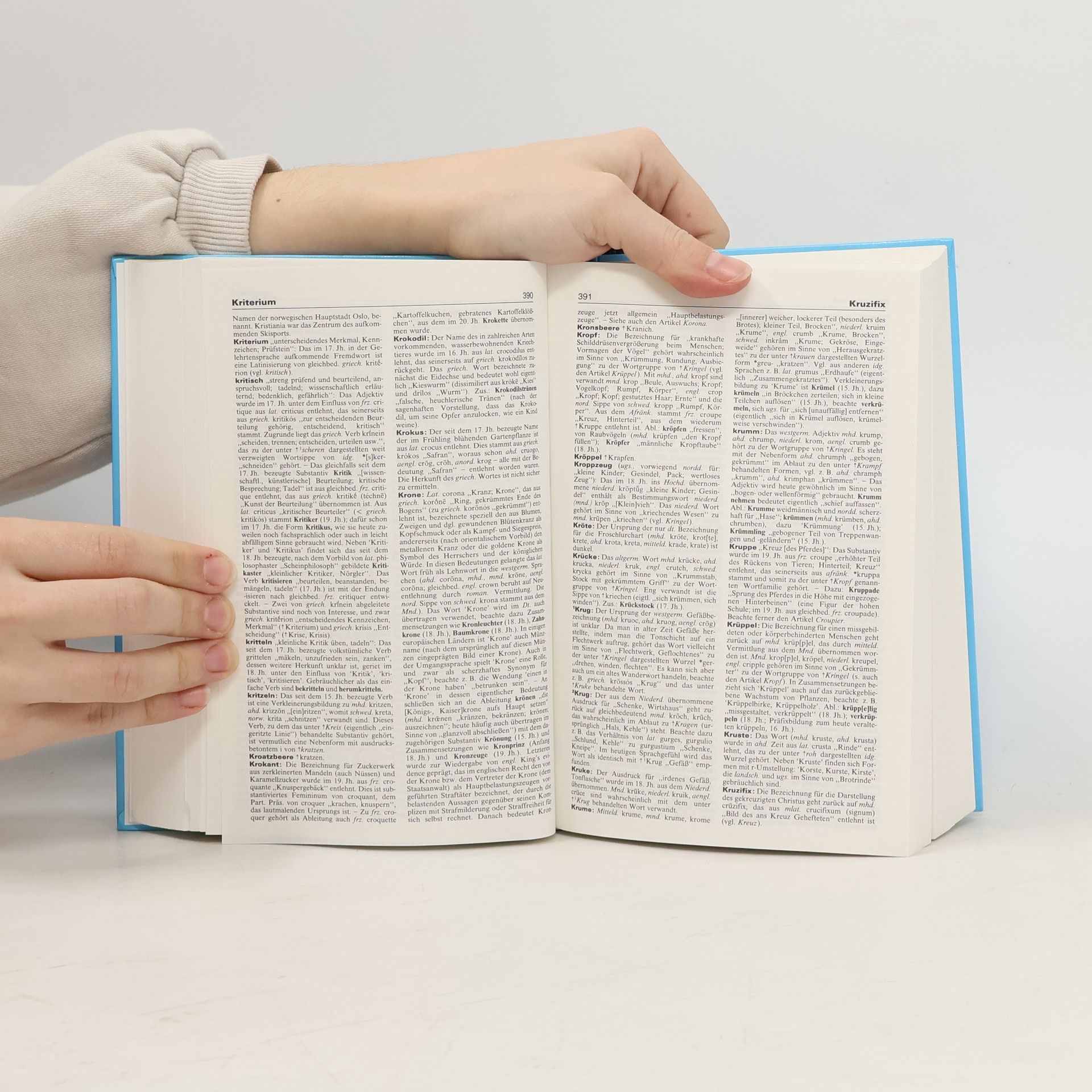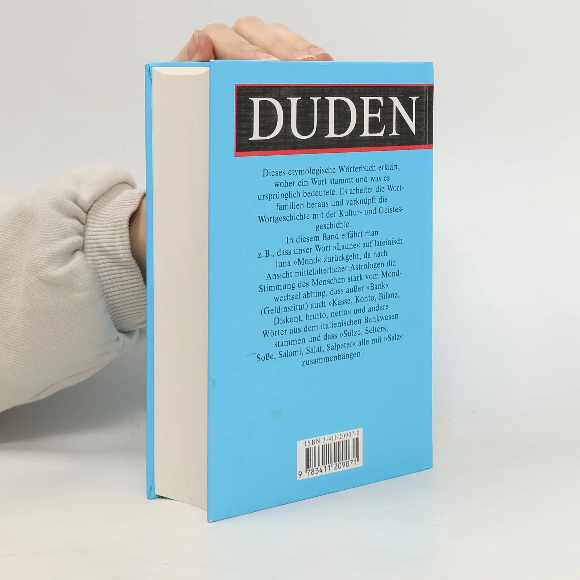La quatrième de couverture indique : "Dieses etymologische Wörterbuch erklärt, woher ein Wort stammt und was es ursprünglich bedeutete. Es arbeitet die Wortfamilien heraus und verknüpft die Wortgeschichte mit der Kultur- und Geistesgeschichte. In diesem Band erfährt man z. B., dass unser Wort " Laune" auf lateinisch luna "Mond' zurückgeht, da nach Ansicht mittelalterlicher Astrologen die Stimmung des Menschen stark vom Mondwechsel abhing, dass ausser "Bank" (Geldinstitut) auch "Kasse, Konto, Bilanz, Diskoont, brutto, netto" und andere Wörter aus dem italienischen Bankwesen stammen und dass "Sülze, Selters, Sosse, Salami, Salat, Salpeter" alle mit "Salz" zusammenhängen."