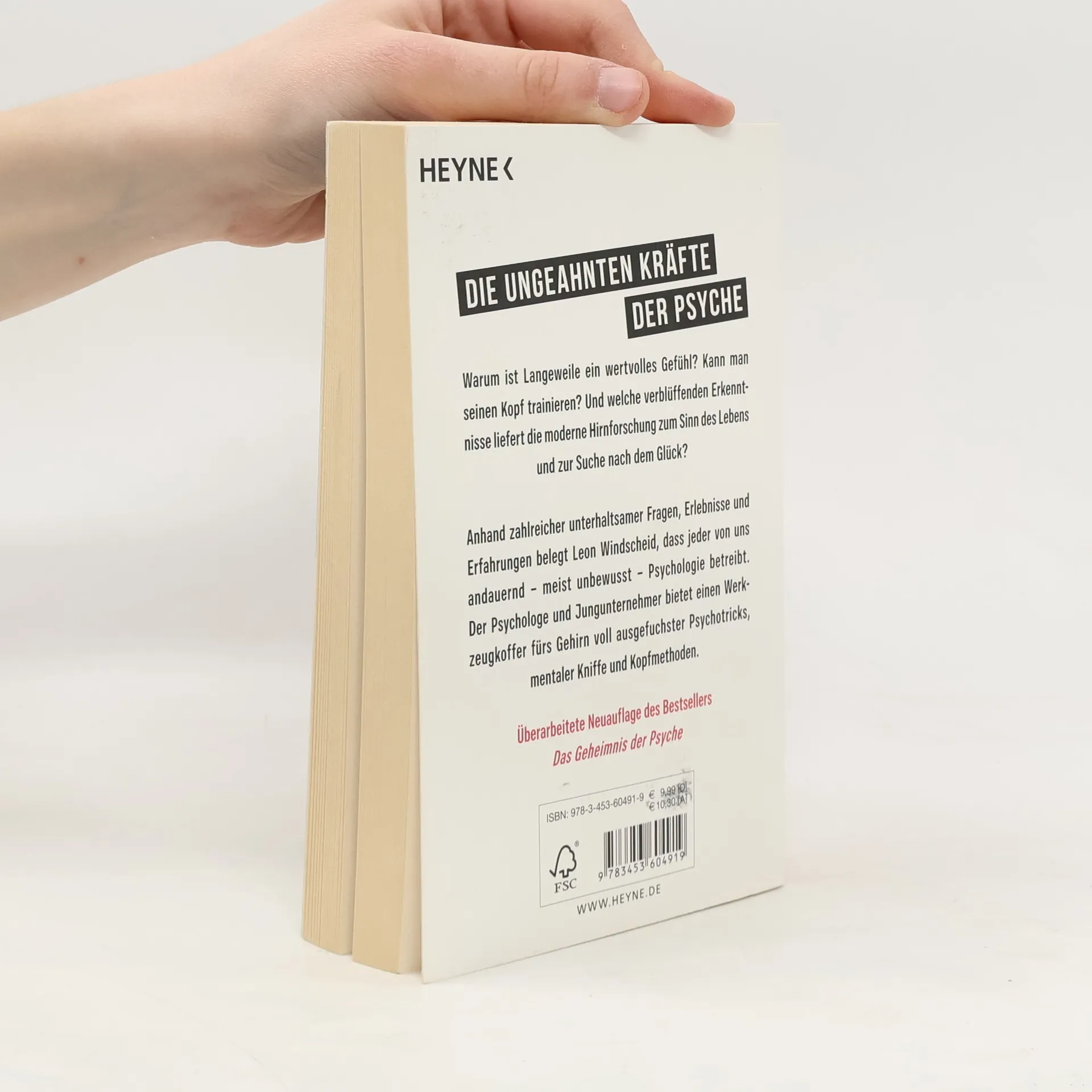 Alltagspsychologie unterhaltsam und zum Staunen lehrreich Überarbeitete Taschenbuchausgabe des Buches „Das Geheimnis der Psyche“ Wie viel Ötzi steckt noch in uns? Kann man seinen Kopf trainieren? Und welche verblüffenden Erkenntnisse liefert die moderne Hirnforschung zum Sinn des Lebens und zur Suche nach dem Glück? All diesen und vielen weiteren hochspannend beantworteten Fragen widmet sich Leon Windscheid in „Hey Hirn!“ – und macht damit die ungeahnten Kräfte der Psyche erlebbar. Windscheids Mission ist es, seine Begeisterung für die Psychologie mit den Lesern zu teilen und ihnen einen Zugang zu den Wundern ihrer eigenen Psyche zu schaffen.