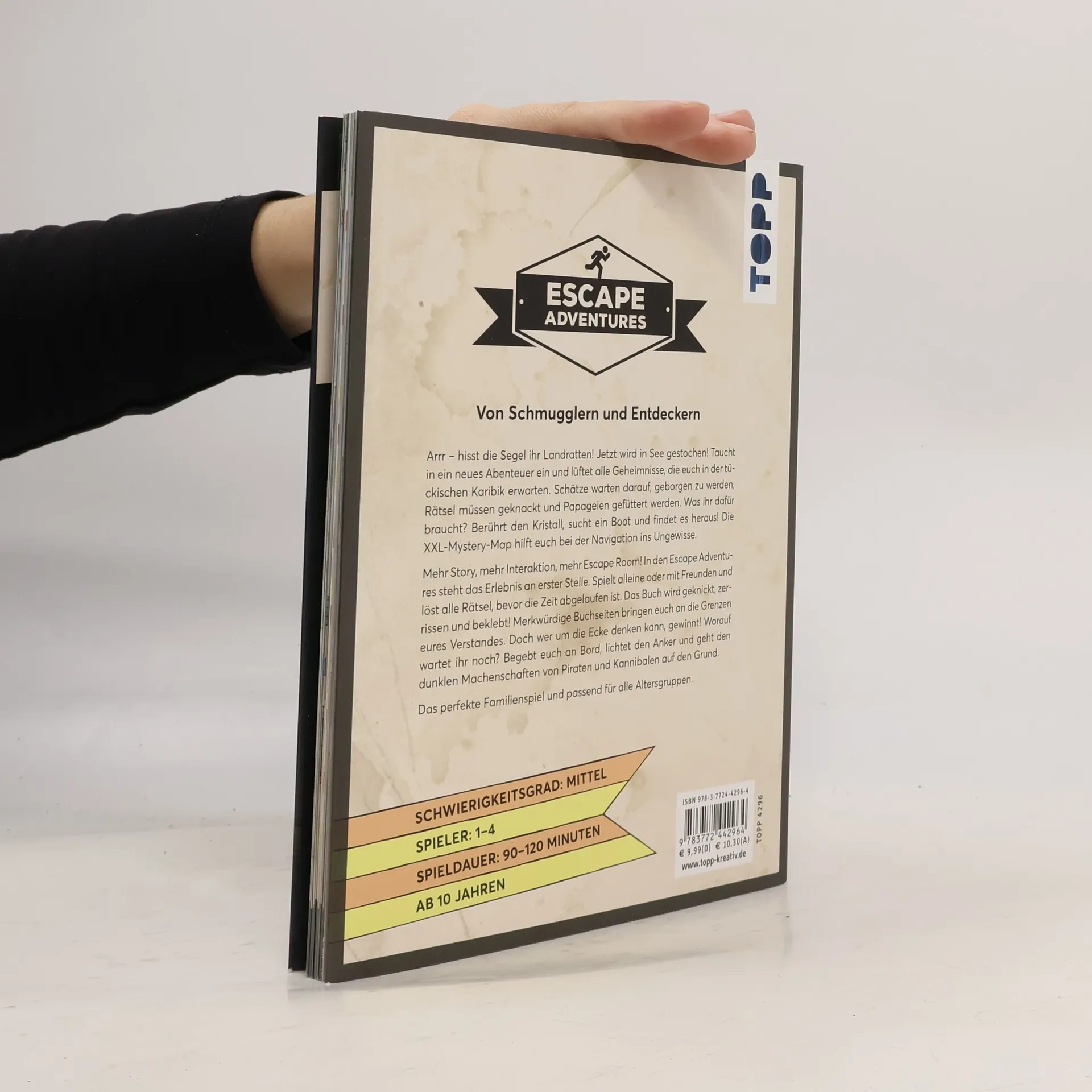Der Escape Room für Zuhause! Jetzt wird in See gestochen! Findet ein Boot, hisst die Segel und erkundet die Karibik. Aber nehmt euch vor den Piraten in acht, haltet im Dschungel nach den Kannibalen Ausschau und bergt alle Schätze, bevor die Zeit abgelaufen ist. Vor euch liegen üble Gefahren, tückische Rätsel und zahlreiche Geheimnisse. Worauf wartet ihr noch? Lichtet den Anker und lüftet das Mysterium! Mehr Story, mehr Interaktion, mehr Escape Room! In den Escape Adventures steht das Erlebnis an erster Stelle. Spielt alleine oder mit Freunden und löst alle Rätsel, bevor die Zeit abgelaufen ist. Schafft ihr es in 60 Minuten, 90 Minuten oder 120 Minuten? Seht genau hin und seid nicht zu hastig, dann wird das Spiel das Highlight eures nächsten Spieleabends! Und alle, die den Exit nicht selbständig finden können, müssen nicht verzagen, denn Hinweise und Lösungen bringen euch auch in kniffligen Situationen Schritt für Schritt voran. Ihr werdet auf merkwürdige Buchseiten stoßen, das Buch zerschneiden und bekleben und euer Boot auf der XXL-Mystery-Map durch die wilde See navigieren. Setzt eure Augenklappe auf und holt euren Hut, das Abenteuer beginnt! Das perfekte Familienspiel und passend für alle Altersgruppen. Schwierigkeitsgrad: Mittel Spieler: 1–4 Spieldauer: 90–120 Minuten Ab 10 Jahren