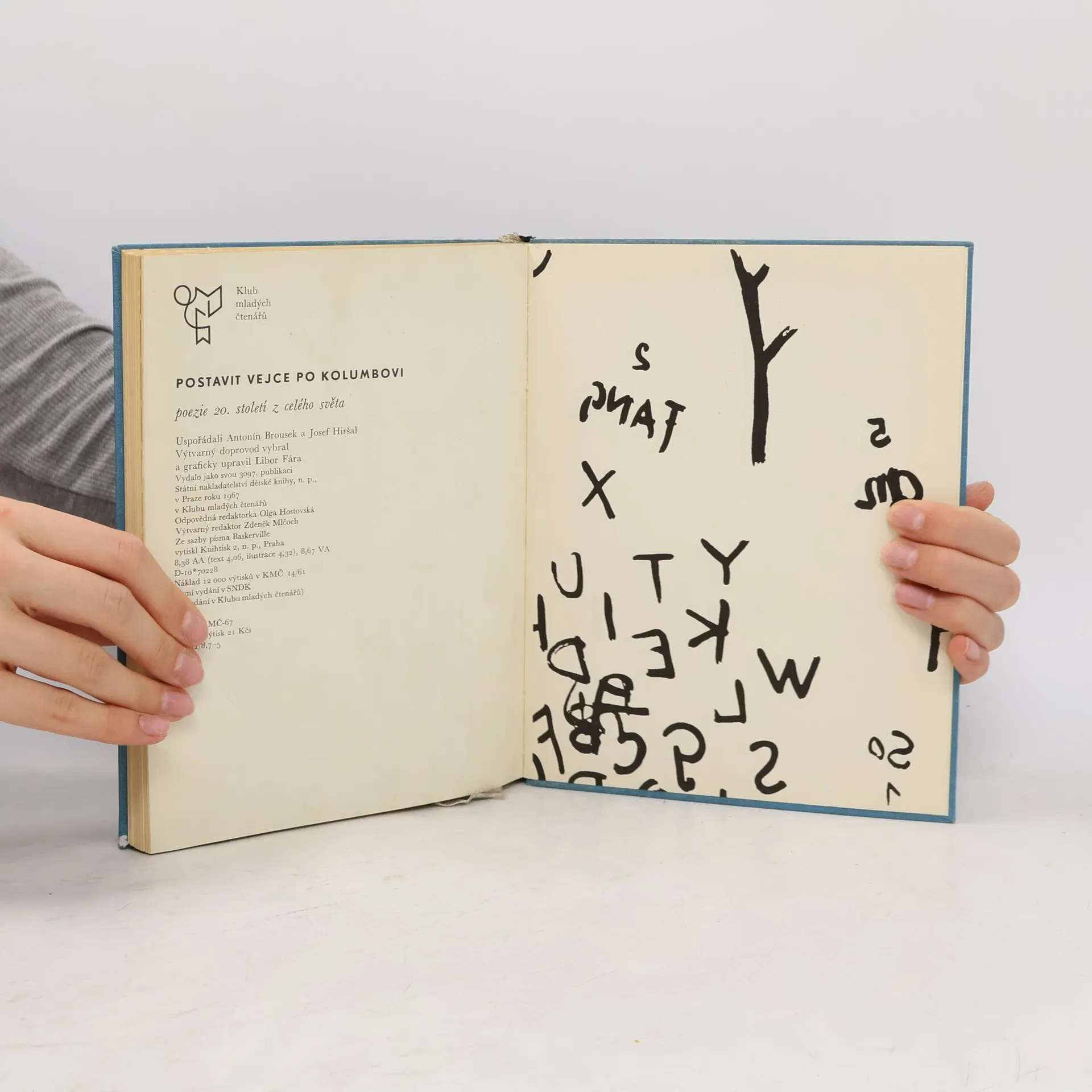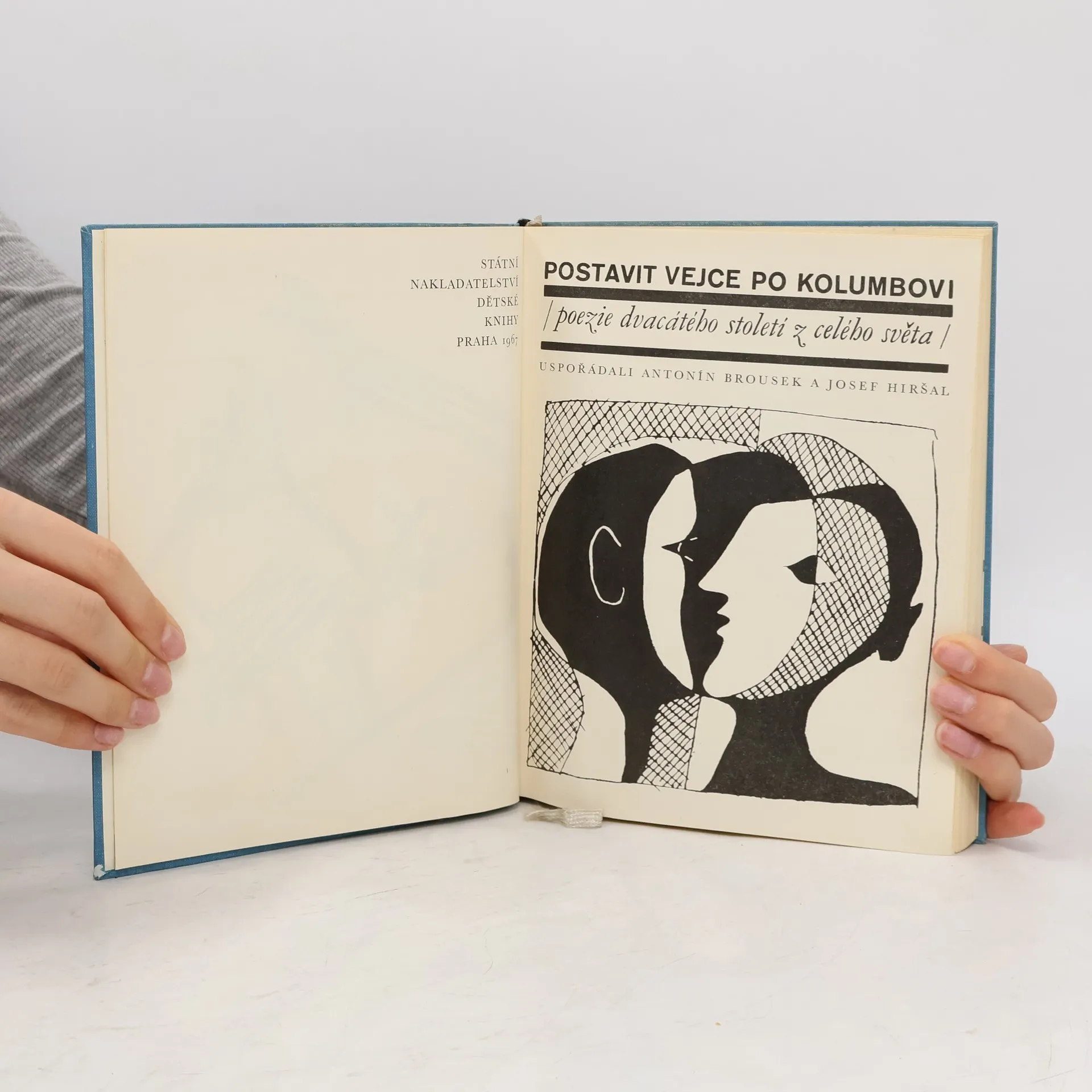 Postavit vejce po Kolumbovi : poezie 20. století z celého světa Antologie moderní poezie, která nechce být „čítankou se zdviženým ukazovákem“. Zahrnuje básníky španělské, brazilské, francouzské, německé, švýcarské, polské, československé, severoamerické, japonské, sovětské, anglické, švédské, kubánské, irské, jugoslávské, belgické, italské, turecké, rakouské a rumunské, představující nejrozličnějsí školy a směry. Sbírku doplňují reprodukce z děl významných moderních malířů. Uspořádali a úvod napsali Antonín Brousek a Josef Hiršal; výtvarný doprovod vybral Libor Fára. Na titulním listu použito kresby Pabla Picassa, na obálce a předsádkách kreseb Hanse Arpa a Paula Kleea. 1. vydání