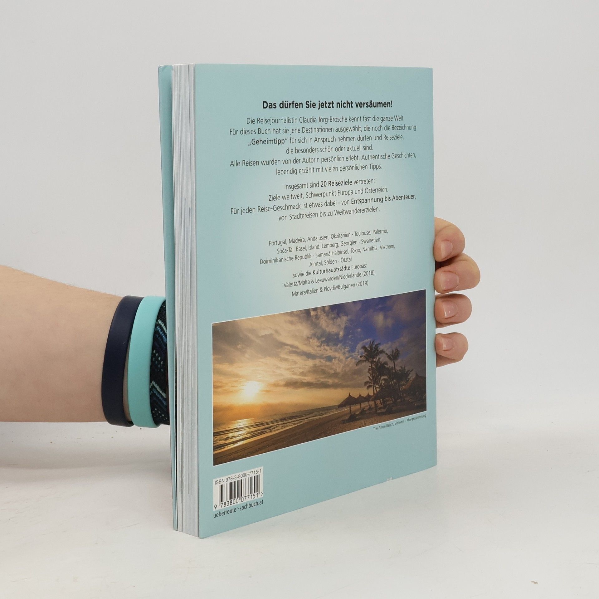 Das dürfen Sie jetzt nicht versäumen! Die Reisejournalistin Claudia Jörg-Brosche kennt fast die ganze Welt. Für dieses Buch hat sie jene Destinationen ausgewählt, die noch die Bezeichnung „Geheimtipp“ für sich in Anspruch nehmen dürfen und Reiseziele, die besonders schön oder aktuell sind. Alle Reisen wurden von der Autorin persönlich erlebt. Authentische Geschichten, lebendig erzählt mit vielen persönlichen Tipps. Insgesamt sind 20 Reiseziele vertreten: Ziele weltweit, Schwerpunkt Europa und Österreich. Für jeden Reise-Geschmack ist etwas dabei - von Entspannung bis Abenteuer, von Städtereisen bis zu Weitwandererzielen. Portugal, Madeira, Andalusien, Okzitanien - Toulouse, Palermo, Soca-Tal, Basel, Island, Lemberg, Georgien - Swanetien, Dominikanische Republik - Samaná Halbinsel, Tokio, Namibia, Vietnam, Almtal, Sölden – Ötztal sowie die Kulturhauptstädte Europas: Valetta/Malta & Leeuwarden/Niederlande (2018), Matera/Italien & Plovdiv/Bulgarien (2019)