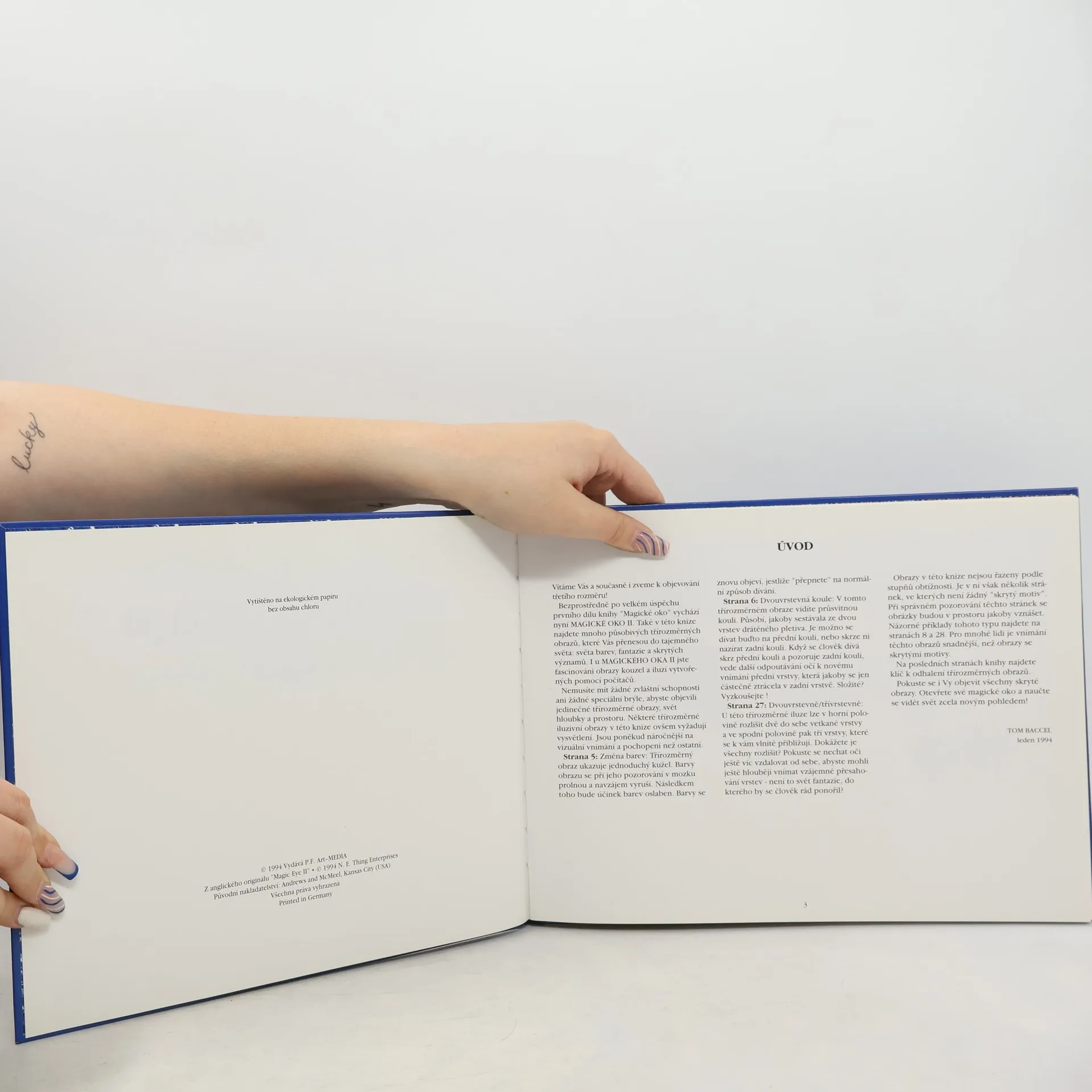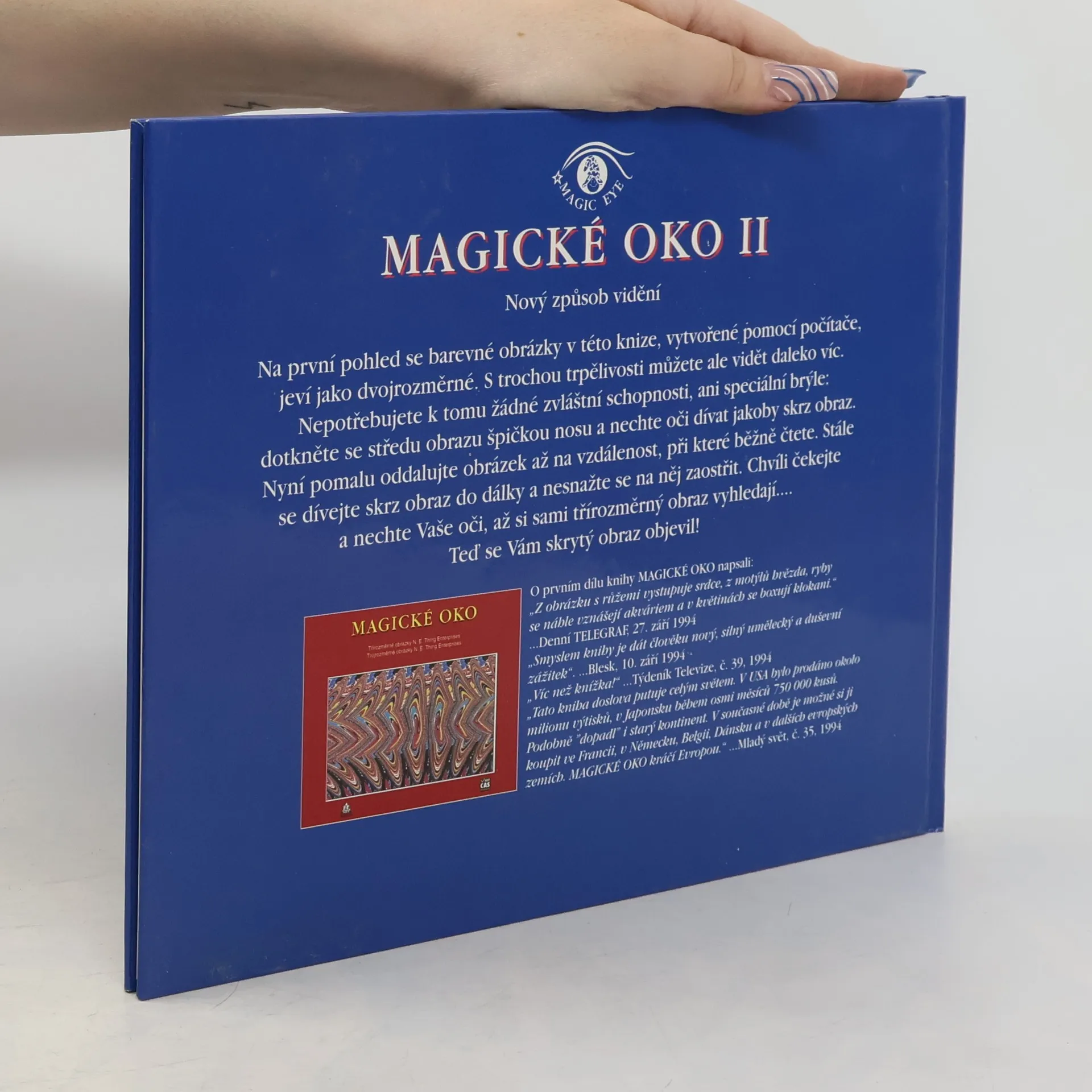 Dívejte se novýma očima. Při listování touto knihou uvidíte nejdříve dekorativní obrazy, které se skládají z čar, barev a vzorů. S trochou trpělivosti však můžete i vy brzy uvidět mnohem víc... Nepotřebujete k tomu ani zvláštní schopnosti, ani speciální brýle. Podržte pouze knihu tak, abyste se jí dotýkali špičkou nosu. Uvolněte oči, dívejte se přímo před sebe, jako byste se dívali skrz knihu. Potom oddálíte knihu na vzdálenost obvyklou při čtení. Nesnažte se dívat na obrázek, stále se dívejte skrz knihu. Po chvíli se před Vašima očima začíná objevovat kouzelný třírozměrný obraz... Úspěch této knihy v USA, Japonsku, Koreji a nyní i v Evropě svědčí o velikém zájmu o fascinující obrazy iluzí a kouzel