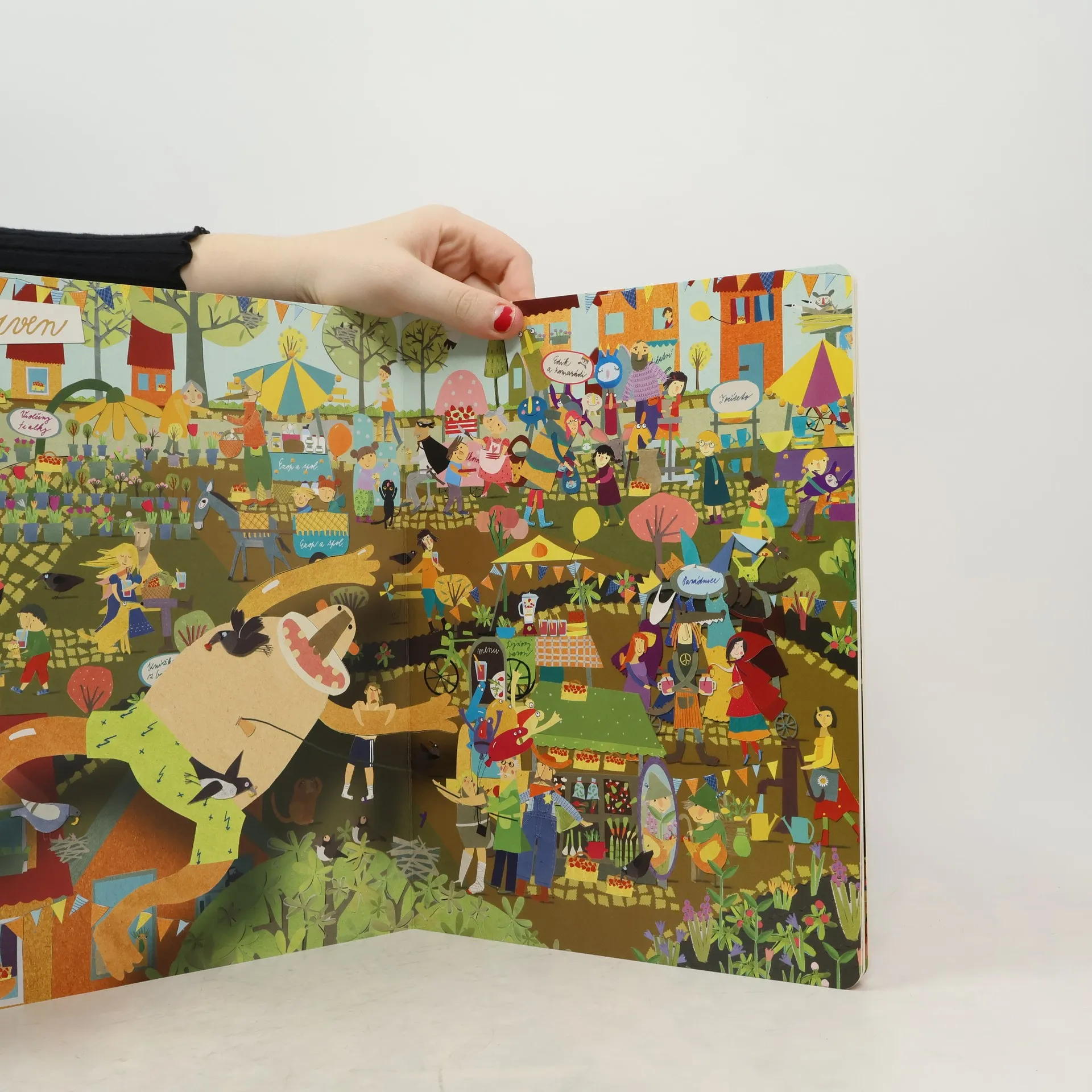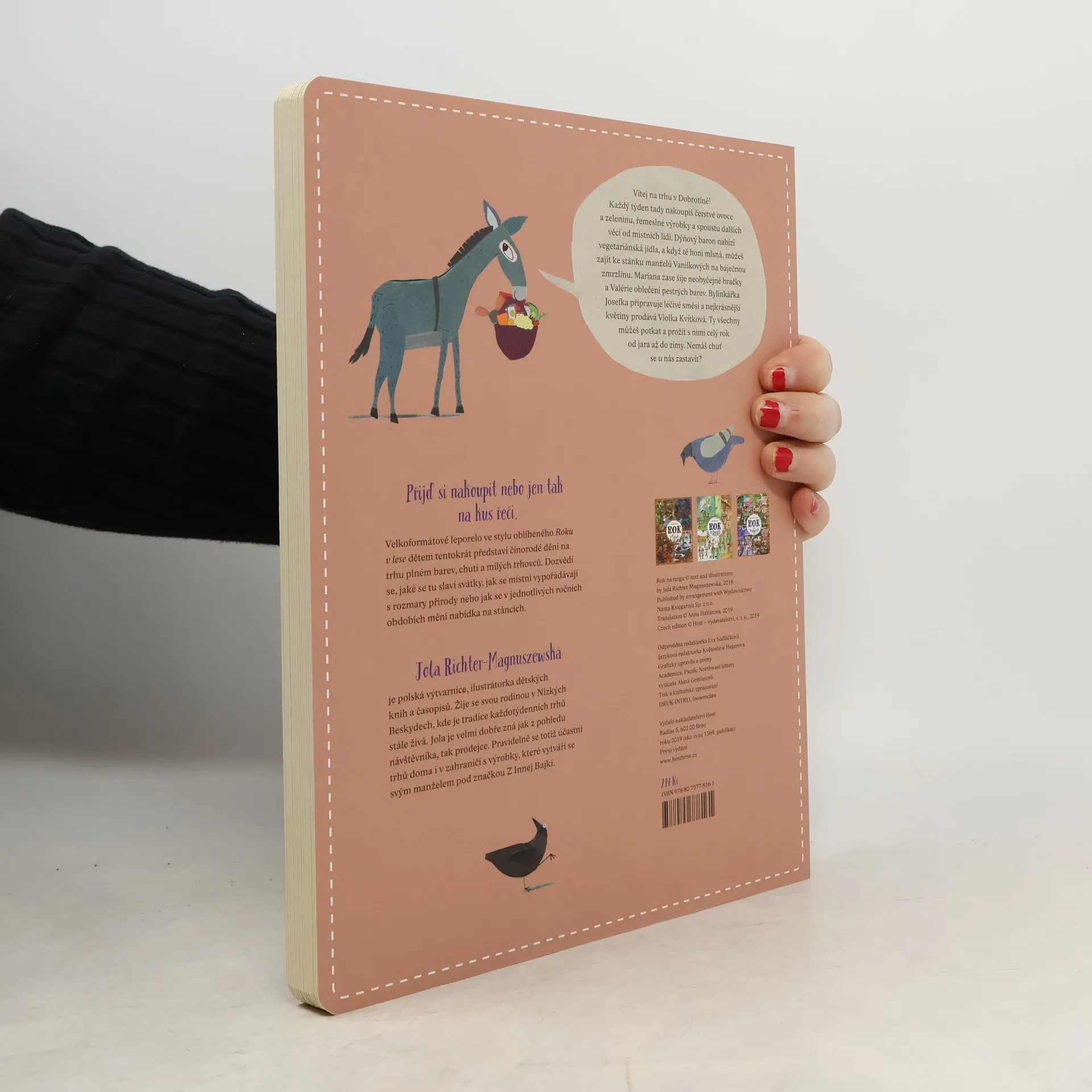 Velkoformátové leporelo ve stylu oblíbeného Roku v lese dětem tentokrát představí barvitý život prodejců na trhu a jejich zákazníků. Zjistí, jak místní slaví svátky, jak se vypořádávají s rozmary přírody nebo jak se mění nabídka na stáncích v jednotlivých ročních obdobích. Vítejte na trhu v Dobrotíně! Každý týden tady můžete nakoupit zdravou zeleninu, řemeslné výrobky a další věci, které s láskou vypěstovali nebo vyrobili místní lidé. Dýňový baron nabízí vegetariánská jídla. Když vás honí mlsná, můžete si zajít ke stánku manželů Vanilkových. Mariana zase šije neobyčejné hračky a Anežka oblečení. Bylinkářka Boženka připravuje léčivé směsi a nejkrásnější květiny najdete u Violky. Nemáte chuť se u nás zastavit?