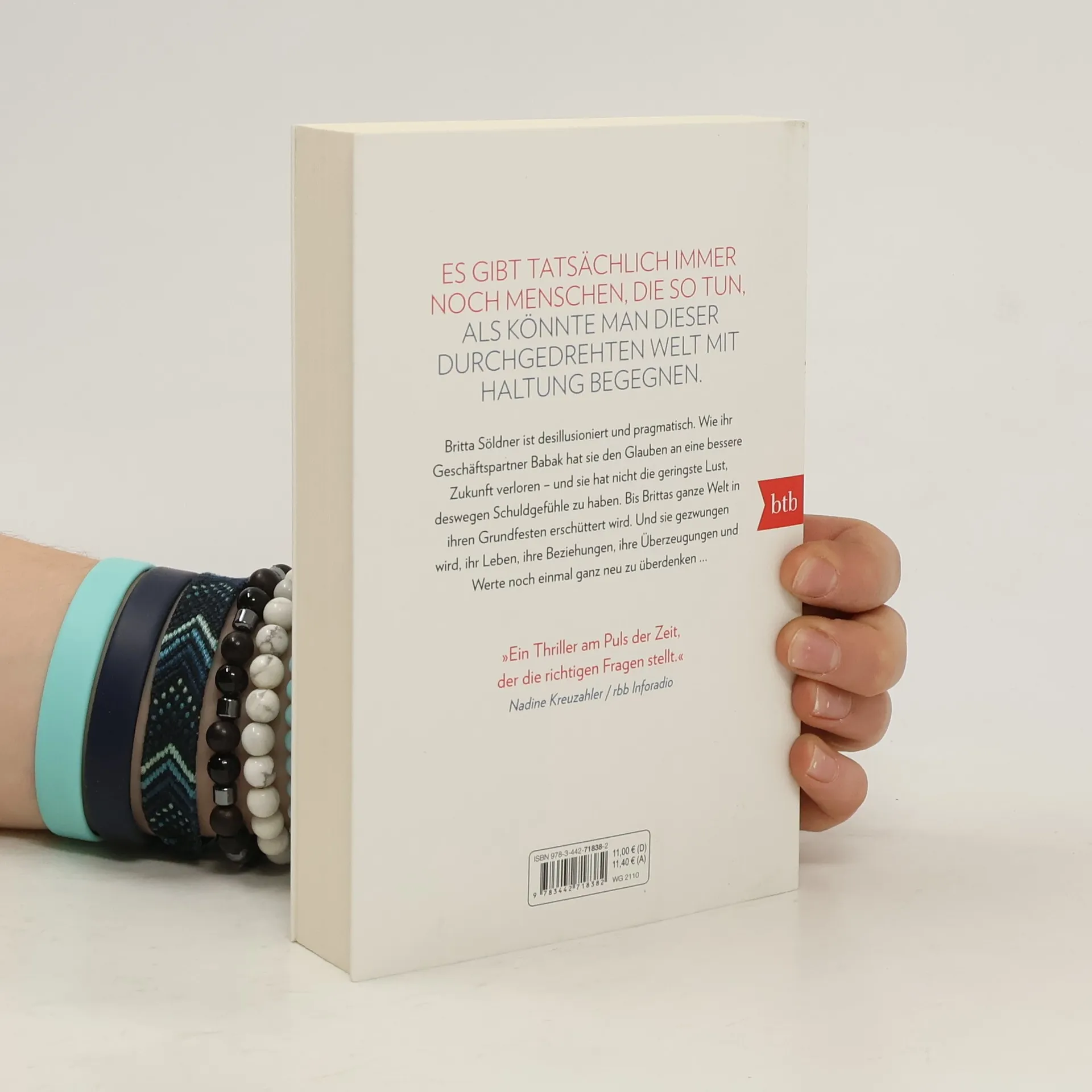Britta Söldner ist desillusioniert und pragmatisch. Sie sieht die Dinge glasklar und hat den Zynismus der Politik genauso durchschaut wie das kleinbürgerliche Gutmenschentum, das die Welt keinen Deut besser macht. Wie ihr Geschäftspartner Babak hat sie den Glauben an eine bessere Zukunft verloren – und sie hat nicht die geringste Lust, deswegen Schuldgefühle zu haben. Bis Brittas ganze Welt in ihren Grundfesten erschüttert wird. Und sie gezwungen ist, ihr Leben, ihre Beziehungen, ihre Überzeugungen und Werte noch einmal ganz neu zu überdenken.