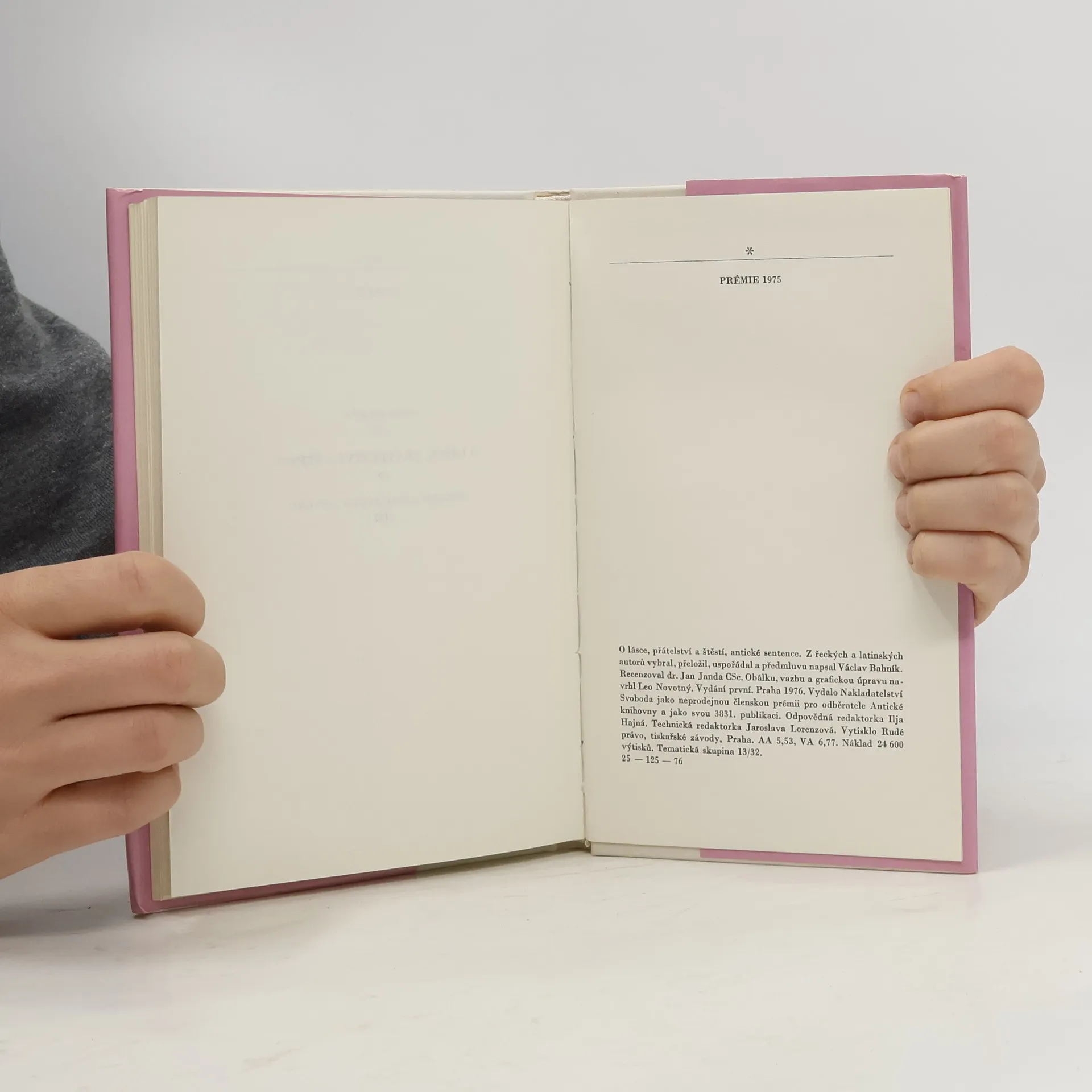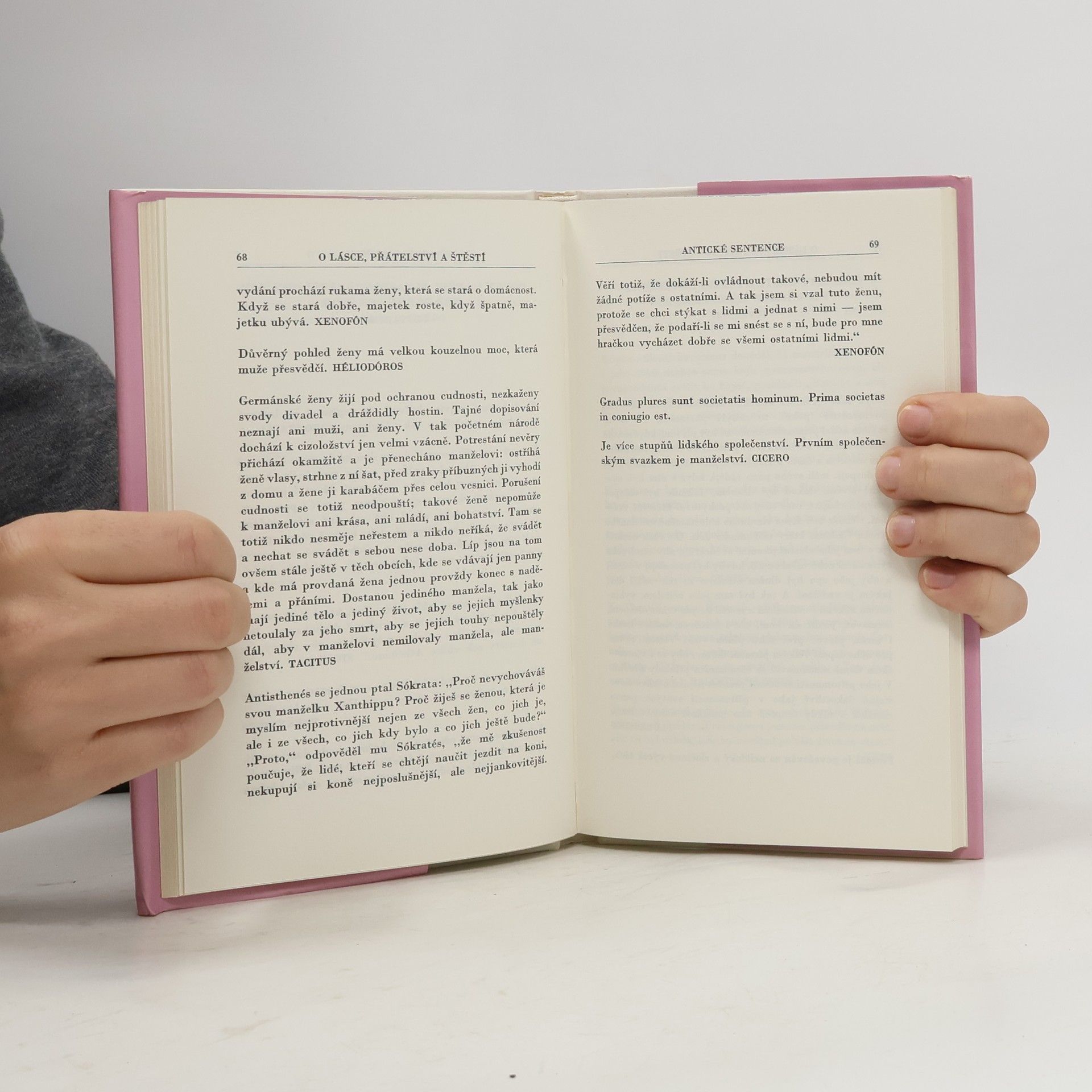 Antické sentence. Předmluva: Již staří Římané dělali to a ono - to bývalo zaklínadlo, které někdy pomáhalo omlouvat jednání, jehož správností si člověk nebyl jist, jindy varovalo před domýšlivou hrdostí na originalitu současné doby, jindy upozorňovalo na hodnoty všelidské a všečasové. Vybrali jsme pro vás z bohaté pokladnice antické literatury hrst příkladů, jak již staří Římané (a před nimi staří Řekové) dovedli vidět světlo a stín vzdělání, dobré i špatné vlastnosti člověka a různé aspekty vztahů mezi lidmi a formulovali mnohé pocity stejně jako lidé dvacátého (jednadvacátého) století. ... Přestože žijeme ve světě úplně jiném, některé myšlenky nás udivý tím, že byly formulovány tak, že mají platnost dodnes, i když se dnešní čtenář nemůže do písmene se vším ztotožnit, vše přejímat jako vidění světe. Václav Bahník Je to kniha plná citátů a přísloví.
