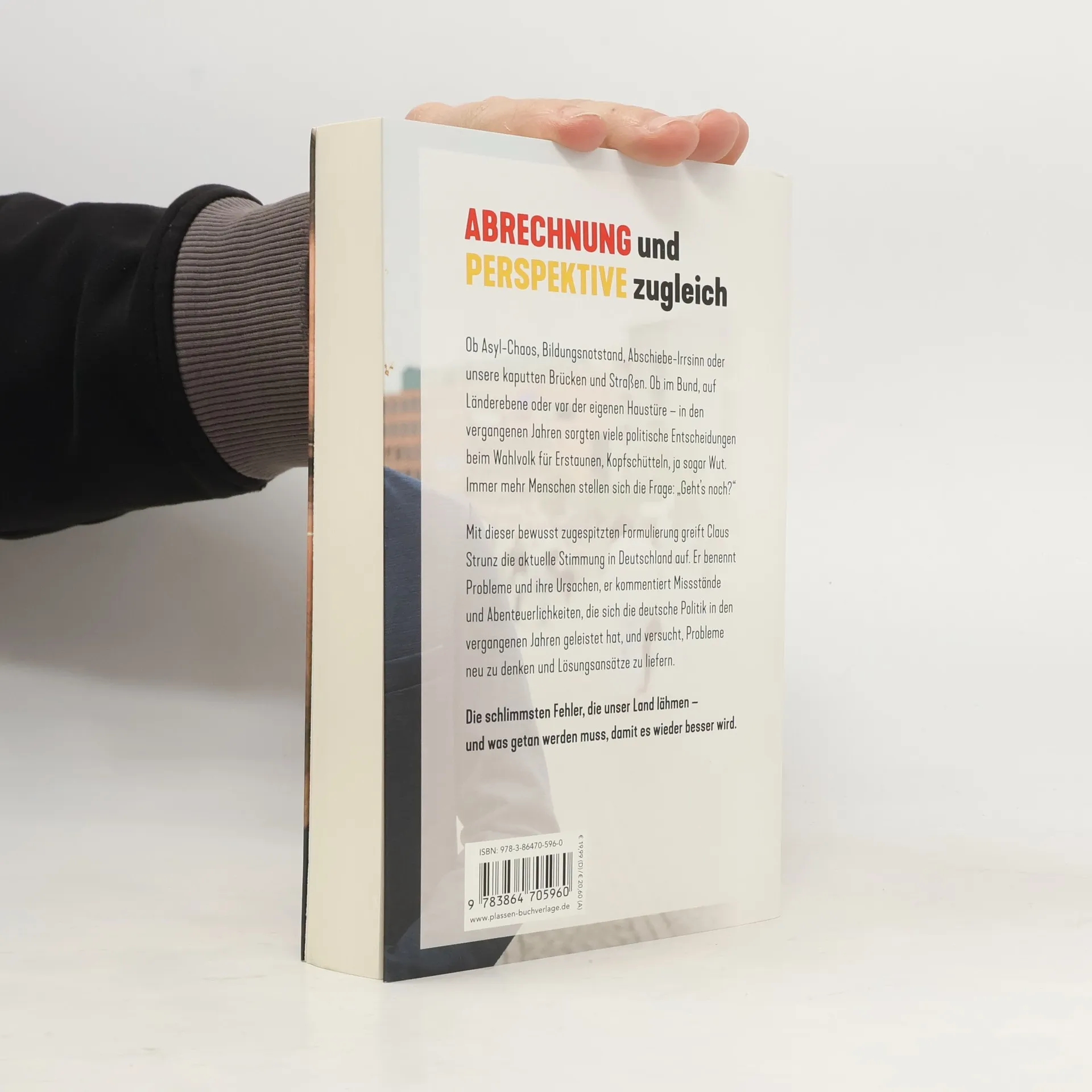 Abrechnung und Perspektive zugleich Ob Asyl-Chaos, Bildungsnotstand, Abschiebe-Irrsinn oder unsere kaputten Brücken und Straßen. Ob im Bund, auf Länderebene oder vor der eigenen Haustüre – in den vergangenen Jahren sorgten viele politische Entscheidungen beim Wahlvolk für Erstaunen, Kopfschütteln, ja sogar Wut. Immer mehr Menschen stellen sich die Frage: „Geht’s noch?“ Mit dieser bewusst zugespitzten Formulierung greift Claus Strunz die aktuelle Stimmung in Deutschland auf. Er benennt Probleme und ihre Ursachen, er kommentiert Missstände und Abenteuerlichkeiten, die sich die deutsche Politik in den vergangenen Jahren geleistet hat, und versucht, Probleme neu zu denken und Lösungsansätze zu liefern. Die schlimmsten Fehler, die unser Land lähmen – und was getan werden muss, damit es wieder besser wird.