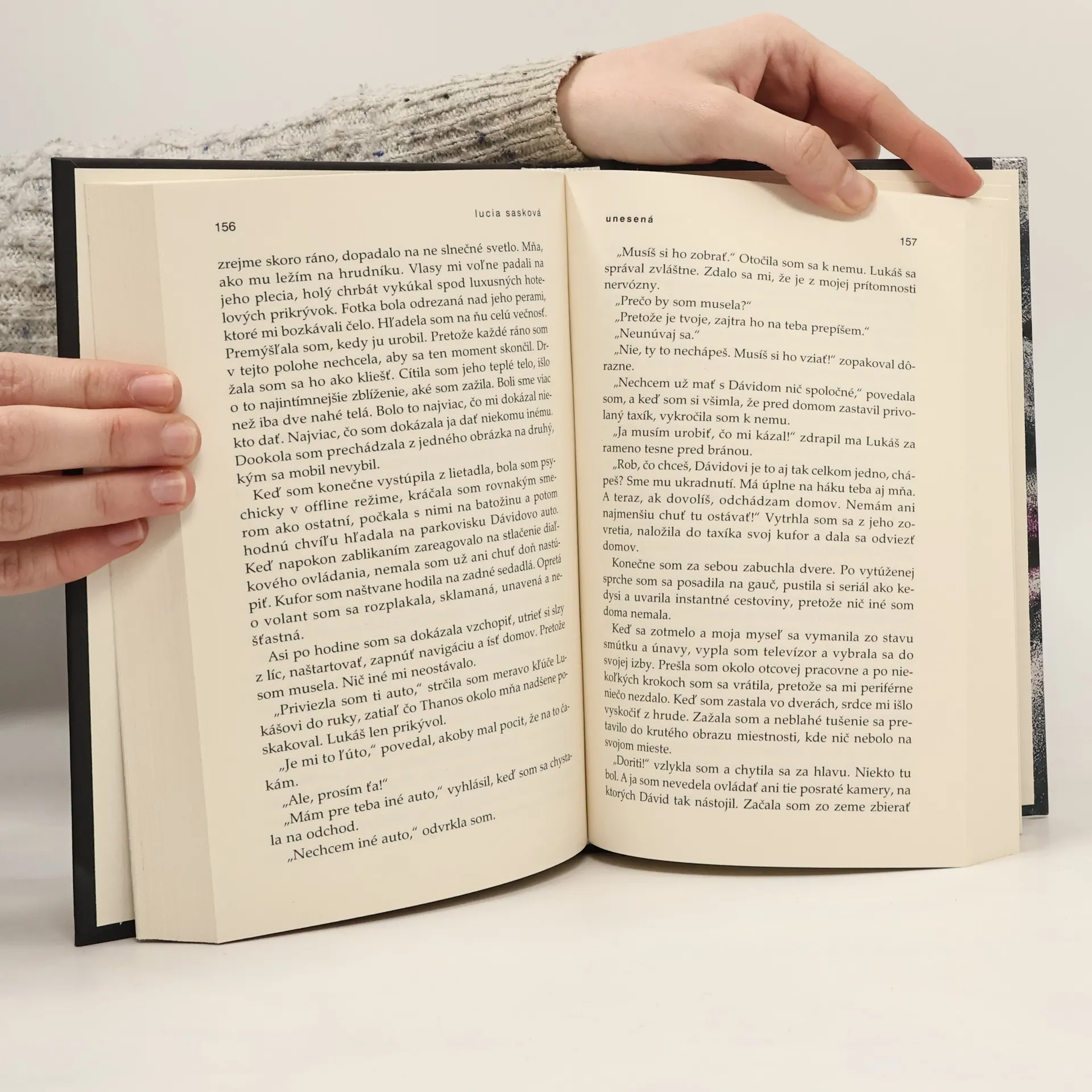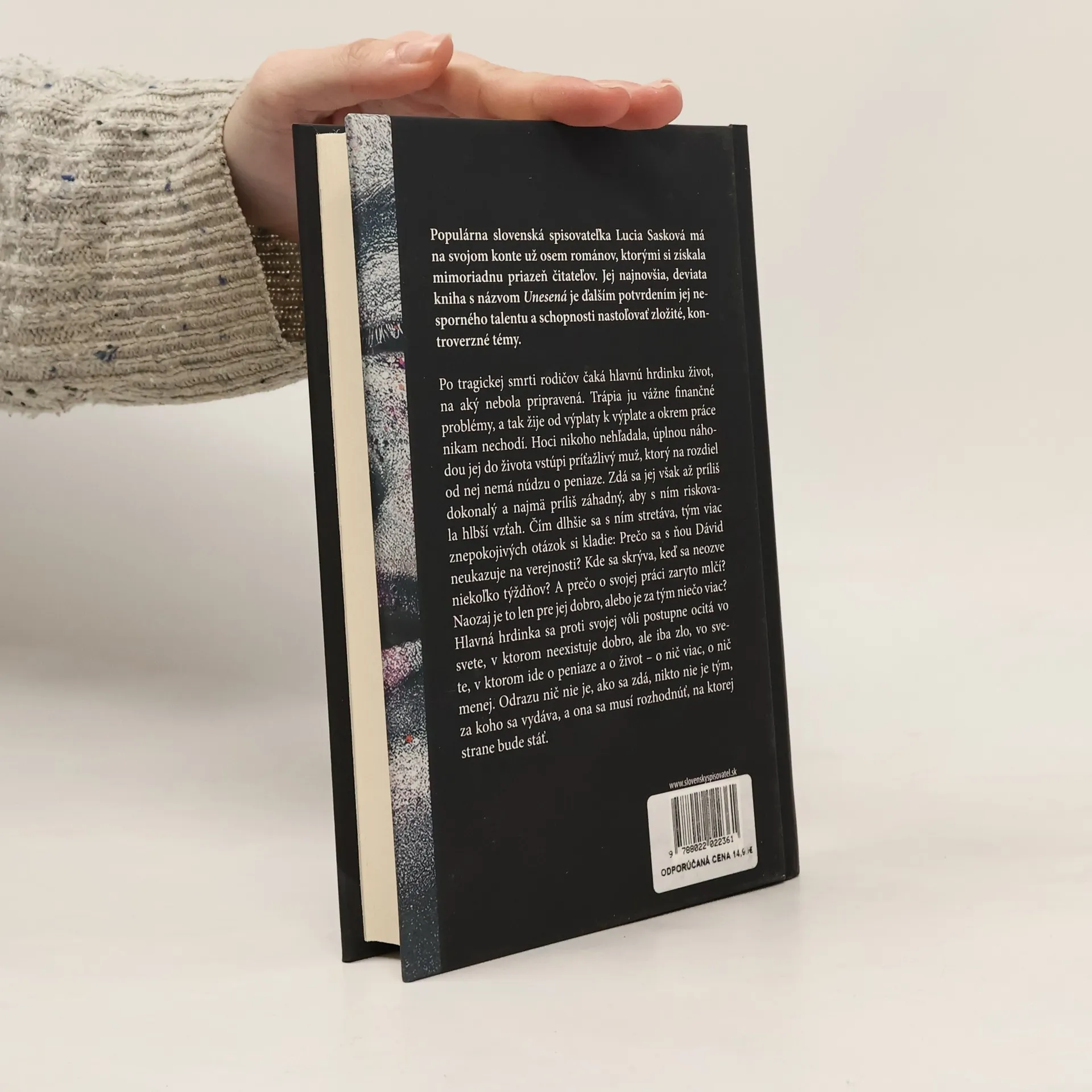 Populárna slovenská spisovateľka Lucia Sasková má na svojom konte už osem románov, ktorými si získala mimoriadnu priazeň čitateľov. Jej najnovšia, deviata kniha s názvom Unesená je ďalším potvrdením jej nesporného talentu a schopnosti nastoľovať zložité, kontroverzné témy. Po tragickej smrti rodičov čaká hlavnú hrdinku život, na aký nebola pripravená. Trápia ju vážne finančné problémy, a tak žije od výplaty k výplate a okrem práce nikam nechodí. Hoci nikoho nehľadala, úplnou náhodou jej do života vstúpi príťažlivý muž, ktorý na rozdiel od nej nemá núdzu o peniaze. Zdá sa jej však až príliš dokonalý a najmä príliš záhadný, aby s ním riskovala hlbší vzťah. Čím dlhšie sa s ním stretáva, tým viac znepokojivých otázok si kladie: Prečo sa s ňou Dávid neukazuje na verejnosti? Kde sa skrýva, keď sa neozýva niekoľko týždňov? A prečo o svojej práci zaryto mlčí? Naozaj je to len pre jej dobro, alebo je z tým niečo viac? Hlavná hrdinka sa proti svojej vôli postupne ocitá vo svete, v ktorom ide o peniaze a o život – o nič viac, o nič menej. Odrazu nič nie je, ako sa zdá, nikto nie je tým, za koho sa vydáva, a ona sa musí rozhodnúť, na ktorej strane bude stáť.