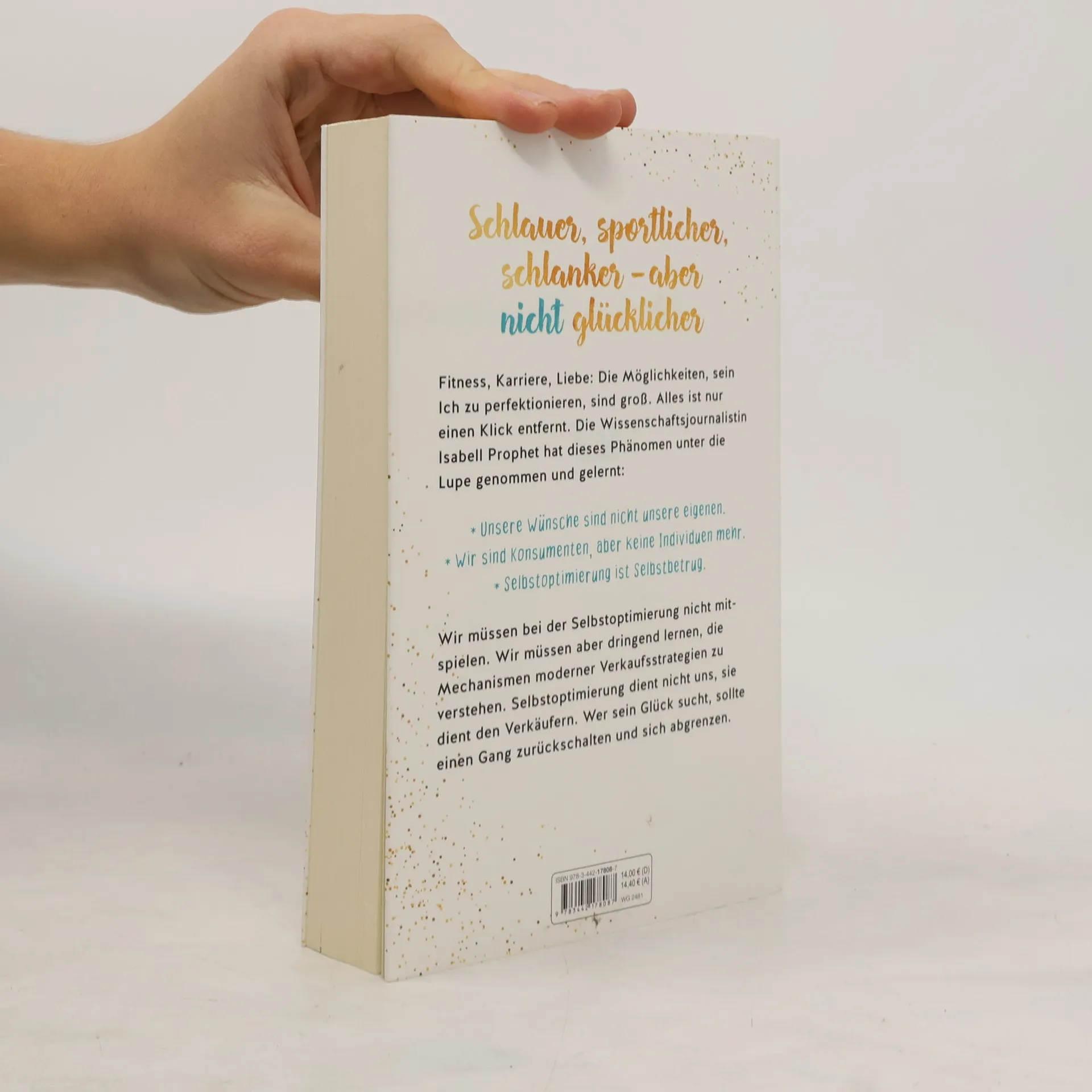 Von Schwarmblödheit, Big Data und dem Menschen als Projekt Fitness, Fremdsprachen, Karriere, Liebe und Dating. Die Möglichkeiten, sein Ich zu perfektionieren sind heute unglaublich groß, und das Beste: Alles ist ganz leicht zu erreichen, nur einen Klick entfernt! Jeder kann es spielend leicht schaffen, im Feierabend Norwegisch zu lernen, seinen Traumpartner zu parshippen, 15-Minuten-Transzendenz in der Meditationsapp zu finden und mit YouTube-Tutorials gelenkig wie ein Yogi zu werden. Selbstoptimierung ist so einfach wie nie zuvor, wir sind süchtig danach. Längst ist eine Branche daraus geworden und sie bietet das perfekte Ich zum Kauf an. Der Druck von allen Seiten steigt, wir selbst jedoch fordern am meisten von uns. Dabei ist das Besserwerden eine Illusion, denn der durchoptimierte Mensch ist nicht glücklicher als vorher. Wie groß der Wahn der Ich-Konsumenten geworden ist, zeigt uns Isabell Prophet mit Klarsicht und der nötigen Schärfe. Wir sind der Selbstoptimierung verfallen – und es gefällt uns auch noch. Doch wer sein Glück sucht, sollte einen Gang zurückschalten und sich abgrenzen.