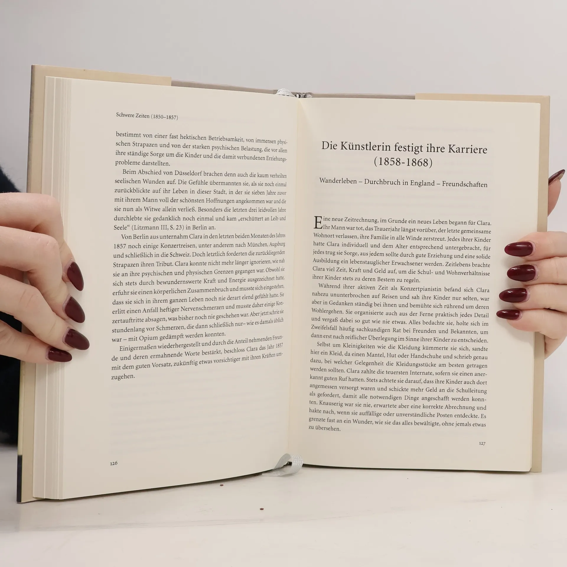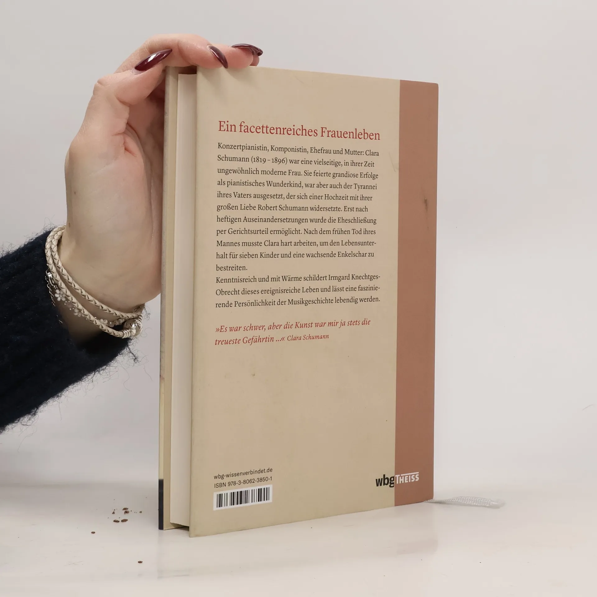 Clara Schumann (1819-1896) war Konzertpianistin, Ehefrau und Mutter. Ihren Mann, den romantischen Komponisten und Musikschriftsteller Robert Schumann, überlebte sie um 40 Jahre. Er war die Liebe ihres Lebens, erkrankte jedoch früh an einem schweren Nervenleiden. Grandiose Erfolge und schwere Rückschläge begleiteten den Weg vom Wunderkind zur Künstlerlegende. Irmgard Knechtges-Obrecht schildert Clara als eigenständige Künstlerin und faszinierende Persönlichkeit, die hart arbeitet, um den Lebensunterhalt für acht Kinder und eine wachsende Enkelschar zu bestreiten. Sie erhellt das Verhältnis zum tyrannischen Vater ebenso wie die enge Beziehung zu Brahms, die noch immer Rätsel aufgibt. Erst jüngst veröffentlichte Briefe und Tagebücher widerlegen Vorurteile und Klischees. Bisher ungedruckte Fotografien zeigen ein für die damalige Zeit ganz und gar ungewöhnliches Frauenleben im Bild.