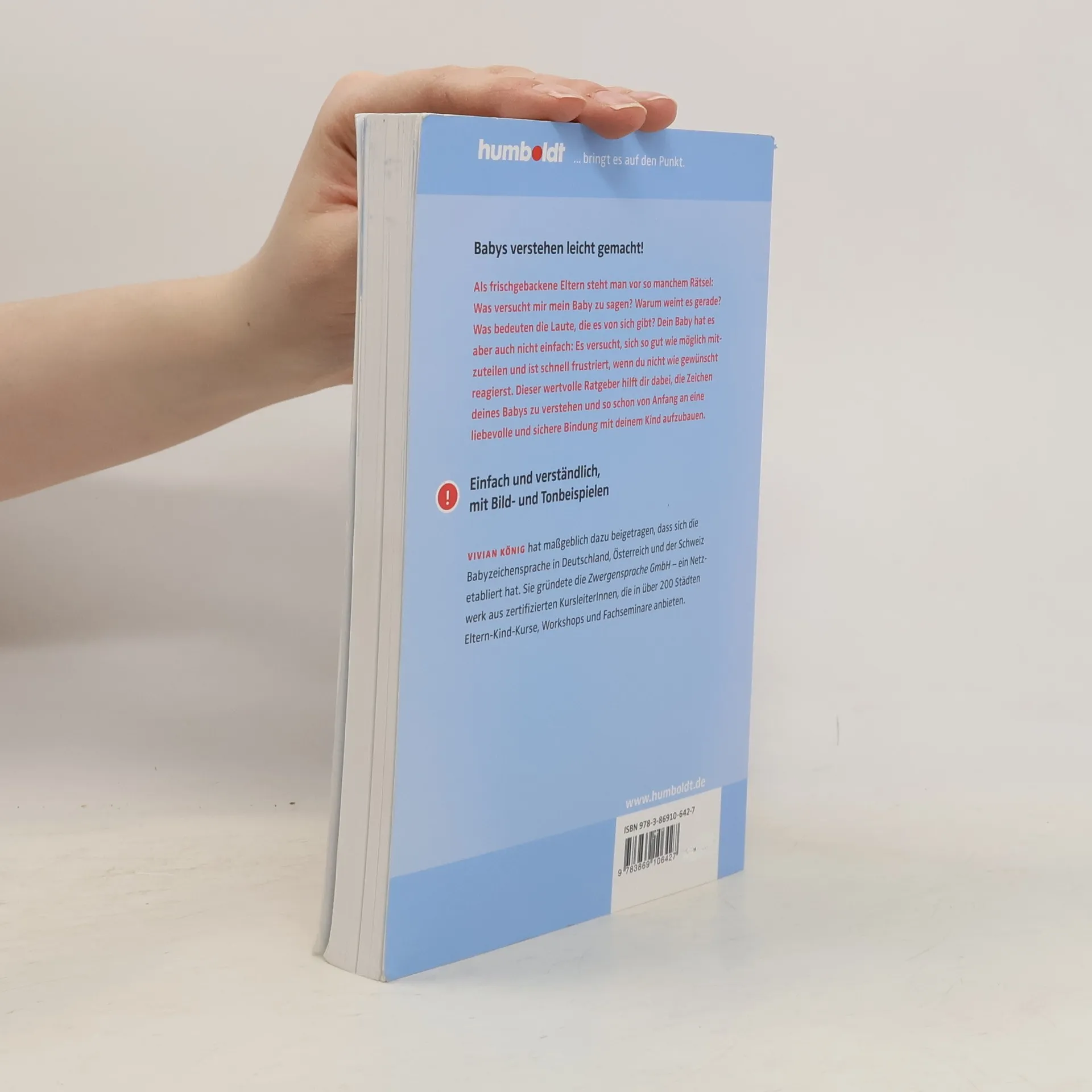 • Baby-Signale richtig deuten: Körpersprache, Laute und Verhalten verstehen und sicher darauf reagieren • Einfach und verständlich, mit Bild- und Tonbeispielen Als frischgebackene Eltern steht man vor so manchem Rätsel: Was versucht mir mein Baby zu sagen? Warum weint es gerade? Was bedeuten die Laute, die es von sich gibt? Das Baby hat es aber auch nicht einfach: Es versucht, sich so gut wie möglich mitzuteilen und ist schnell frustriert, wenn seine Eltern nicht wie gewünscht reagieren. Dieser wertvolle Ratgeber hilft dabei, die Babyzeichen zu verstehen und so schon von Anfang an eine liebevolle und sichere Bindung zum Kind aufzubauen. Anhand von vielen Beispielen und Bildern zeigt er die wichtigsten Signale und erklärt, was Gestik, Mimik und Laute zu bedeuten haben und wie man am besten darauf reagiert. Zusätzlich gibt es wertvolle Tipps und Informationen: Wie beruhige ich mein Baby? Wie wecke ich den Forschergeist meines Kindes? Wie gelingt spielerisches Sprechenlernen? Aus dem Inhalt: Babysignale verstehen lernen Das Baby weint – was nun? Das Baby muss beruhigt werden – nur wie? Wie dein Baby lernt Kommunikation mithilfe von Babyzeichen Die Eroberung der Welt der Wörter In wertschätzender Verbindung sein von Anfang an