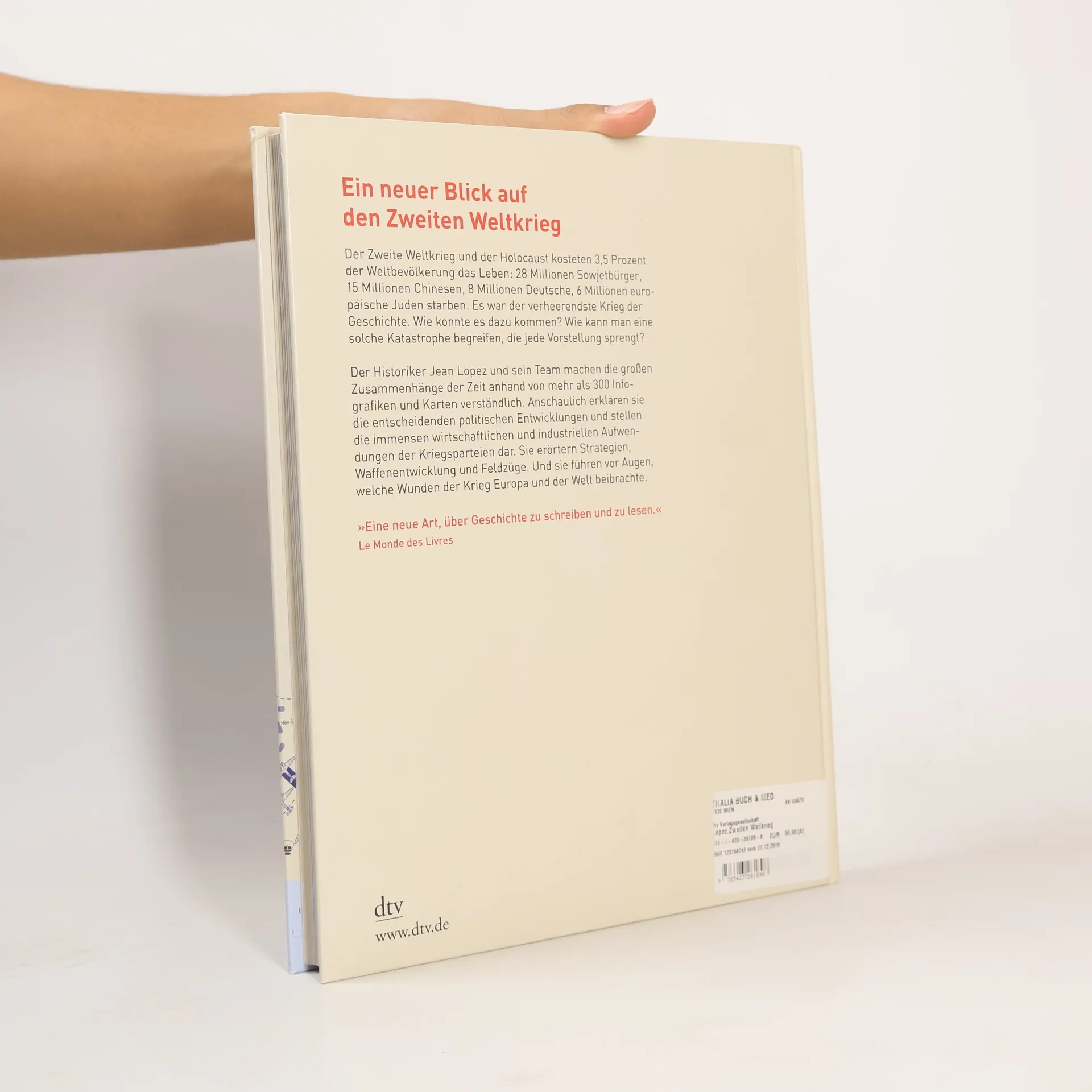 Ein neuer Blick auf den Zweiten Weltkrieg Der Zweite Weltkrieg und der Holocaust kosteten 3,5 Prozent der Weltbevölkerung das Leben: 28 Millionen Sowjetbürger, 15 Millionen Chinesen, 8 Millionen Deutsche, 6 Millionen europäische Juden starben. Es war der verheerendste Krieg der Geschichte. Wie konnte es dazu kommen? Wie kann man eine solche Katastrophe begreifen, die jede Vorstellung sprengt? Der Historiker Jean Lopez und sein Team machen die großen Zusammenhänge der Zeit anhand von mehr als 300 Infografiken und Karten verständlich. Anschaulich erklären sie die entscheidenden politischen Entwicklungen und stellen die immensen wirtschaftlichen und industriellen Aufwendungen der Kriegsparteien dar. Sie erörtern Strategien, Waffenentwicklung und Feldzüge. Und sie führen vor Augen, welche Wunden der Krieg Europa und der Welt beibrachte. - Großformat - Durchgehend vierfarbig gestaltet