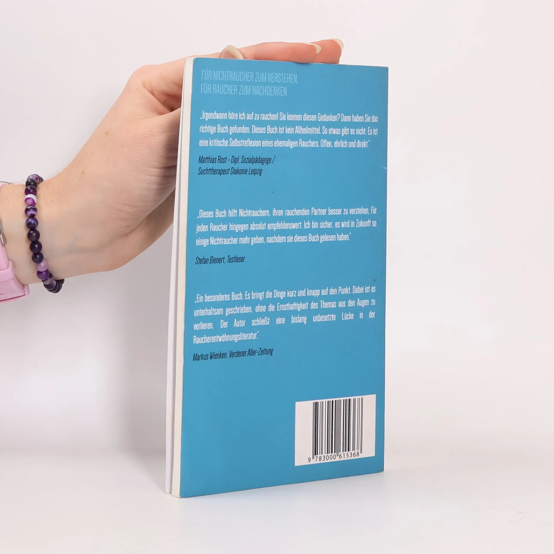 Für Nichtraucher zum Verstehen, für Raucher zum Nachdenken „Irgendwann höre ich auf zu rauchen! Sie kennen diesen Gedanken? Dann haben Sie das richtige Buch gefunden. Dieses Buch ist kein Allheilmittel. So etwas gibt es nicht. Es ist eine kritische Selbstreflexion eines ehemaligen Rauchers. Offen, ehrlich und direkt.“ Matthias Rost Dipl. Sozialpädagoge /Suchttherapeut, Diakonie Leipzig „Dieses Buch hilft Nichtrauchern, ihren rauchenden Partner besser zu verstehen. Für jeden Raucher hingegen absolut empfehlenswert. Ich bin sicher, es wird in Zukunft so einige Nichtraucher mehr geben, nachdem sie dieses Buch gelesen haben." Stefan Bienert., Testleser „Ein besonderes Buch. Es bringt die Dinge kurz und knapp auf den Punkt. Dabei ist es unterhaltsam geschrieben, ohne die Ernsthaftigkeit des Themas aus den Augen zu verlieren. Der Autor schließt eine bislang unbesetzte Lücke in der Raucherentwöhnungsliteratur.“ Markus Wienken, Verdener Aller-Zeitung