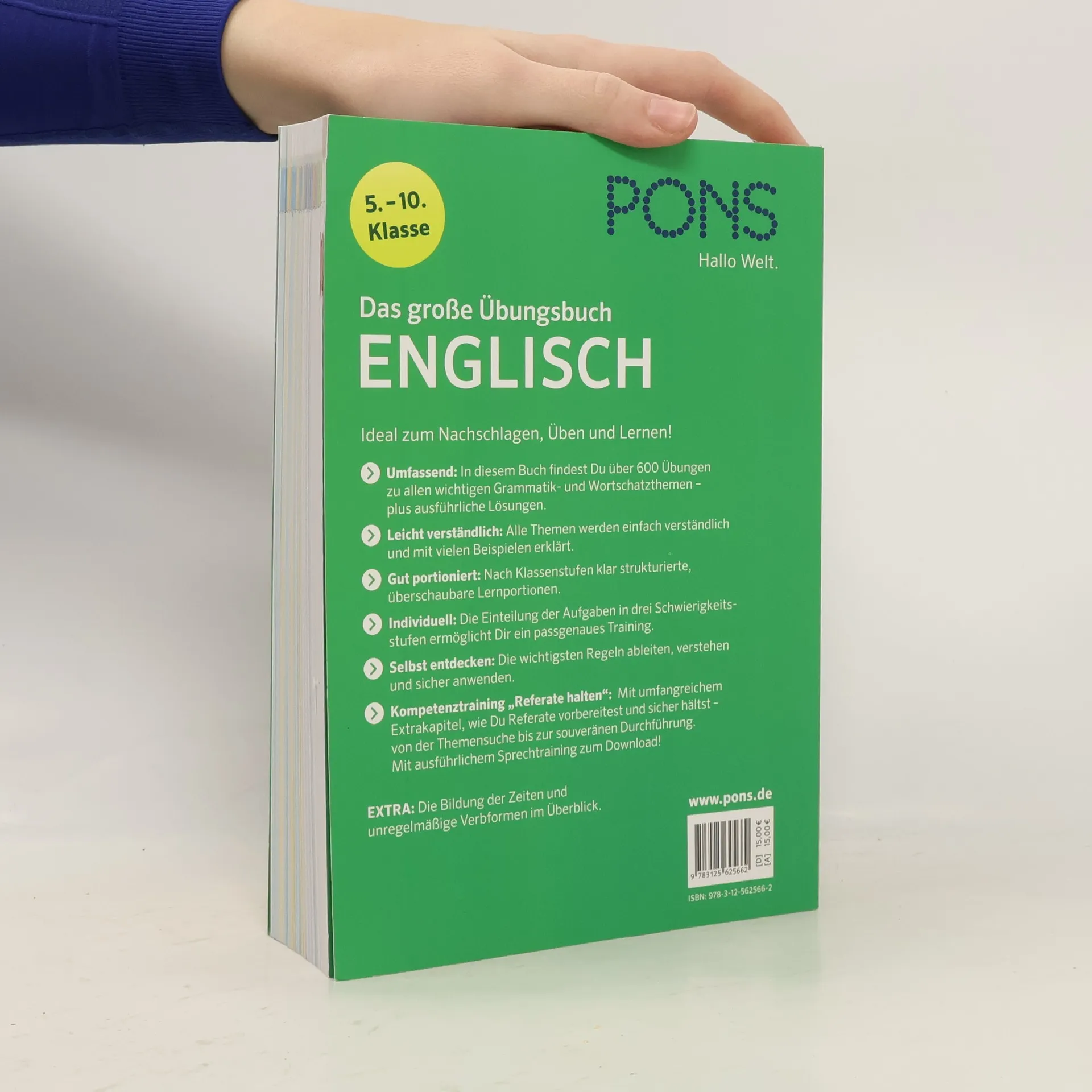 Ideal zum Nachschlagen, Üben und Lernen! Alle wichtigen Grammatik- und Wortschatzthemen für den Englischunterricht. Umfassend: In diesem Buch findest Du über 600 Übungen zu allen wichtigen Grammatik- und Wortschatzthemen – plus ausführliche Lösungen. Leicht verständlich: Alle Themen werden einfach verständlich und mit vielen Beispielen erklärt. Gut portioniert: Nach Klassenstufen klar strukturierte, überschaubare Lernportionen. Individuell: Die Einteilung der Aufgaben in drei Schwierigkeitsstufen ermöglicht Dir ein passgenaues Training. Selbst entdecken: Die wichtigsten Regeln ableiten, verstehen und sicher anwenden. Kompetenztraining „Referate halten“: Mit umfangreichem Extrakapitel, wie Du Referate vorbereitest und sicher hältst – von der Themensuche bis zur souveränen Durchführung. Mit ausführlichem Sprechtraining zum Download! EXTRA : Die Bildung der Zeiten und unregelmäßige Verbformen im Überblick.