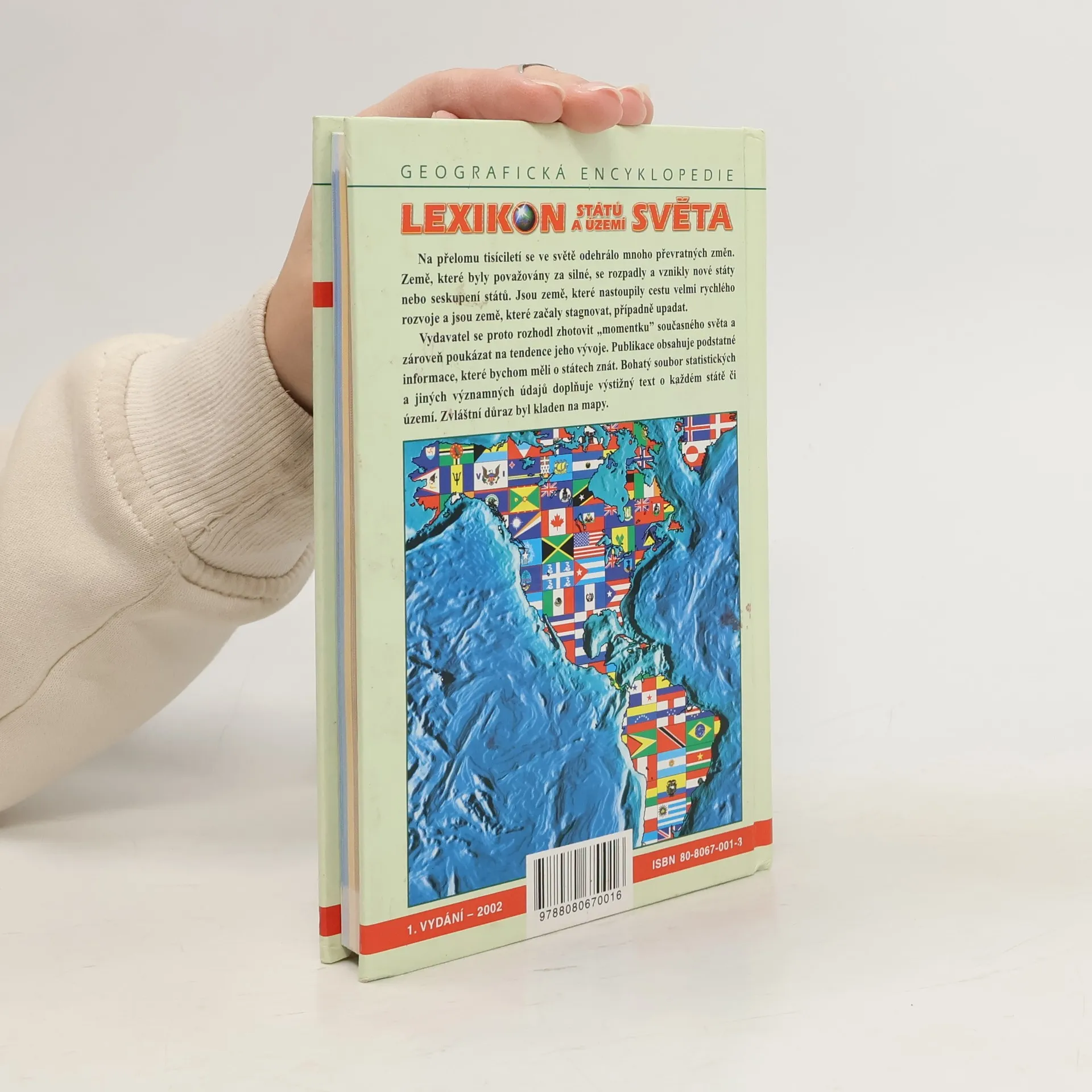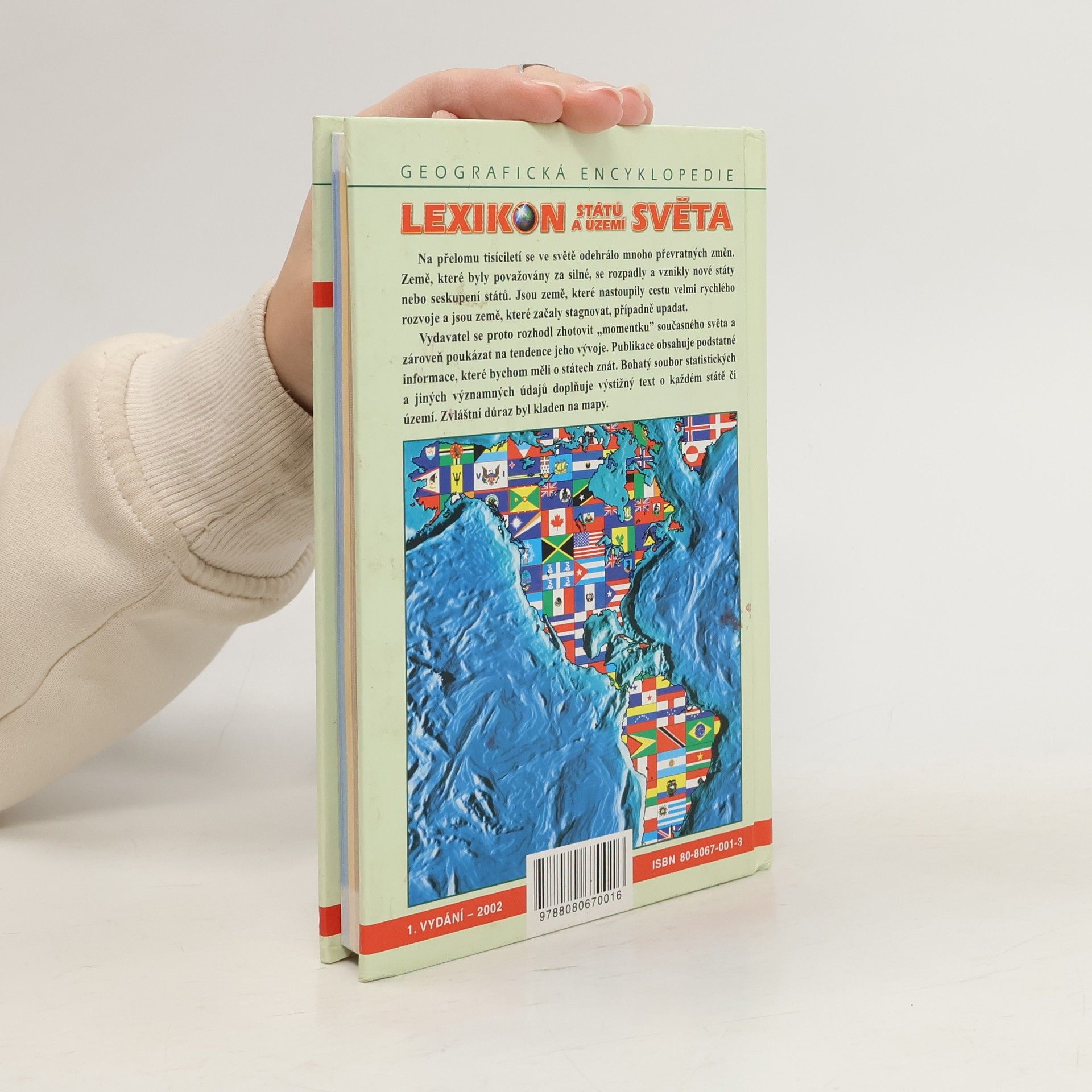 Velice přehledně a zároveň důkladně je tímto způsobem charakterizována celá Země. Text začíná všeobecným přehledem s připojením mapy světa a pak následuje popis kontinentů v pořadí: Evropa, Asie, Afrika, Severní a Střední Amerika, Jižní Amerika, Austrálie a Oceánie a nakonec Antarktida. Vždy je připojen celkový mapový záběr světadílu a přehledný textový popis jednotlivých zemí. Listy knihy jsou barevně odlišeny - každému světadílu přísluší určitá barva, takže hledání v lexikonu se tím usnadní. Orientaci ještě zlepšuje na závěr připojený abecední rejstřík názvů států a území. Kniha končí seznamem použité literatury.