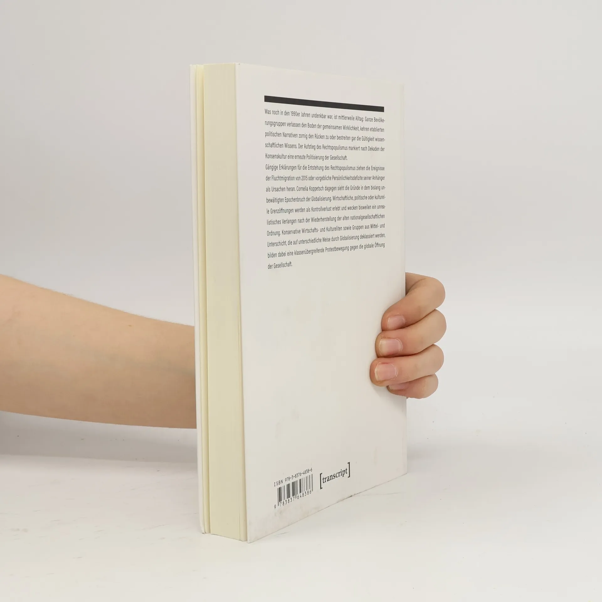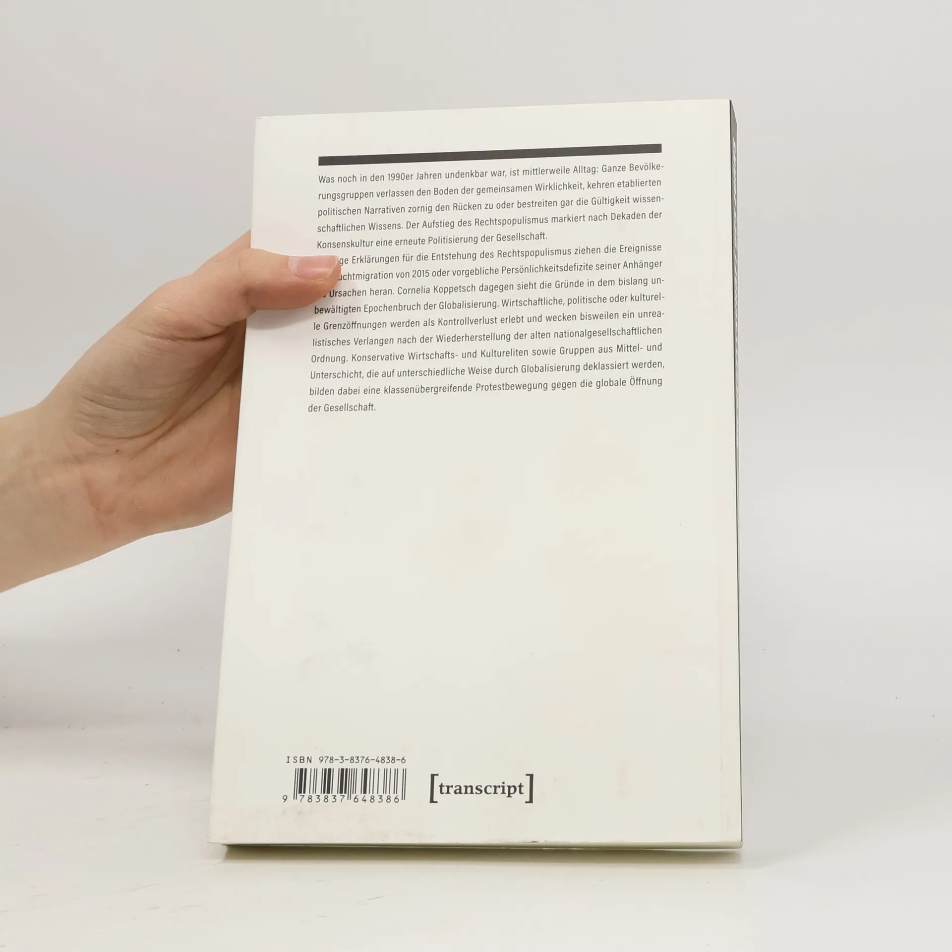 Was noch in den 1990er Jahren undenkbar war, ist mittlerweile Alltag: Ganze Bevölkerungsgruppen verlassen den Boden der gemeinsamen Wirklichkeit, kehren etablierten politischen Narrativen zornig den Rücken oder bestreiten gar die Gültigkeit wissenschaftlichen Wissens. Der Aufstieg des Rechtspopulismus markiert nach Dekaden der Konsenskultur eine erneute Politisierung der Gesellschaft. Gängige Erklärungen für die Entstehung des Rechtspopulismus ziehen die Ereignisse der Fluchtmigration von 2015 oder vorgebliche Persönlichkeitsdefizite seiner Anhänger als Ursachen heran. Cornelia Koppetsch dagegen sieht die Gründe in dem bislang unbewältigten Epochenbruch der Globalisierung. Wirtschaftliche, politische oder kulturelle Grenzöffnungen werden als Kontrollverlust erlebt und wecken bisweilen ein unrealistisches Verlangen nach der Wiederherstellung der alten nationalgesellschaftlichen Ordnung. Konservative Wirtschafts- und Kultureliten sowie Gruppen aus Mittel- und Unterschicht, die auf unterschiedliche Weise durch Globalisierung deklassiert werden, bilden dabei eine klassenübergreifende Protestbewegung gegen die globale Öffnung der Gesellschaft.