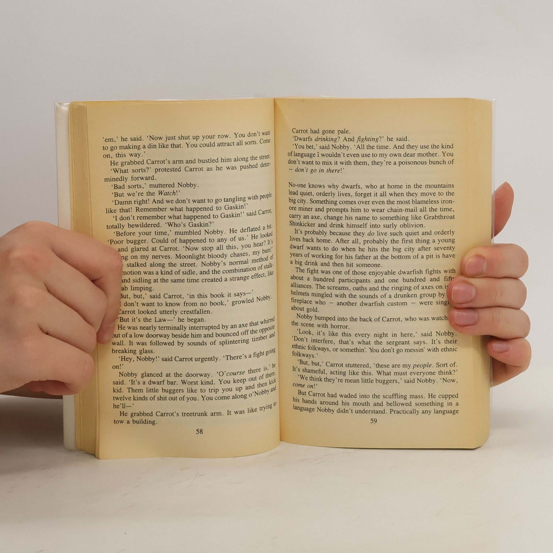 Some night-time prowler is turning the citizens of Ankh-Morpork, greatest city of the fantasy Discworld, into something resembling small charcoal biscuits. And that's a real problem for Captain Vimes of the City Watch, who must tramp the mean streets of the city searching for a seventy-foot-long fire-breathing dragon which, he believes, can help him with their enquiries. In a city thrown into turmoil by magic, charcoal biscuits, secret societies and mad lady dragon breeders ("Just tell him 'sit' if he'sothering you"), he's just looking for the facts