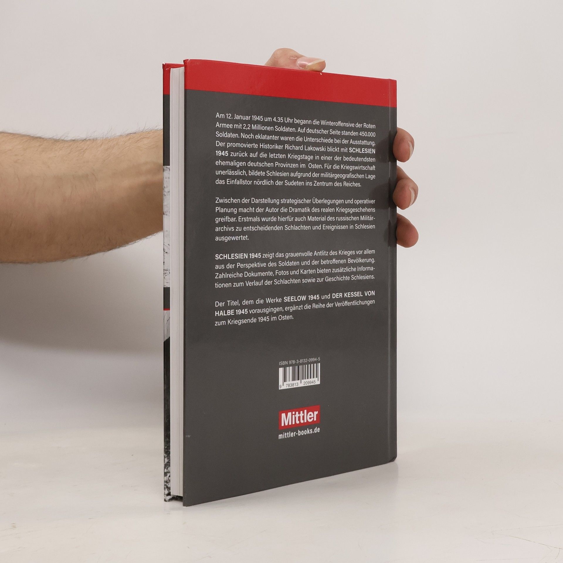 Am 12. Januar 1945 um 4.35 Uhr begann die Winteroffensive der Roten Armee mit 2,2 Millionen Soldaten. Auf deutscher Seite standen 450.000 Soldaten. Noch eklatanter waren die Unterschiede bei der Ausstattung. Der promovierte Historiker Richard Lakowski blickt mit SCHLESIEN 1945 zurück auf die letzten Kriegstage in einer der bedeutendsten ehemaligen deutschen Provinzen im Osten. Für die Kriegswirtschaft unerlässlich, bildete Schlesien aufgrund der militärgeografischen Lage das Einfallstor nördlich der Sudeten ins Zentrum des Reiches. Zwischen der Darstellung strategischer Überlegungen und operativer Planung macht der Autor die Dramatik des realen Kriegsgeschehens greifbar. Erstmals wurde hierfür auch Material des russischen Militärarchivs zu entscheidenden Schlachten und Ereignissen in Schlesien ausgewertet. SCHLESIEN 1945 zeigt das grauenvolle Antlitz des Krieges vor allem aus der Perspektive des Soldaten und der betroffenen Bevölkerung. Zahlreiche Dokumente, Fotos und Karten bieten zusätzliche Informationen zum Verlauf der Schlachten sowie zur Geschichte Schlesiens. Der Titel, dem die Werke SEELOW 1945 und DER KESSEL VON HALBE 1945 vorausgingen, ergänzt die Reihe der Veröffentlichungen zum Kriegsende 1945 im Osten.