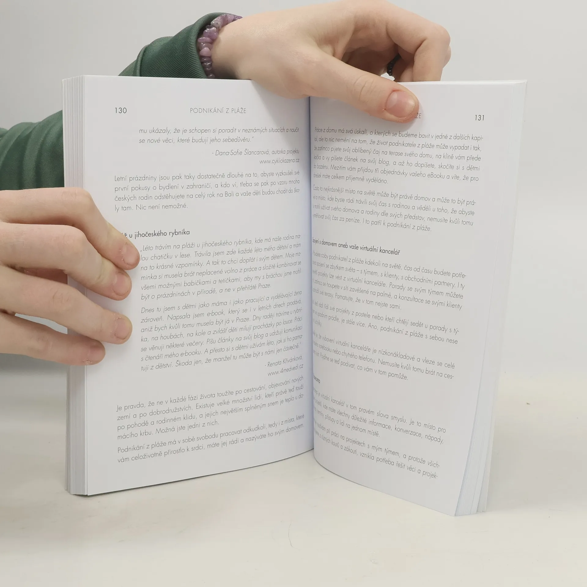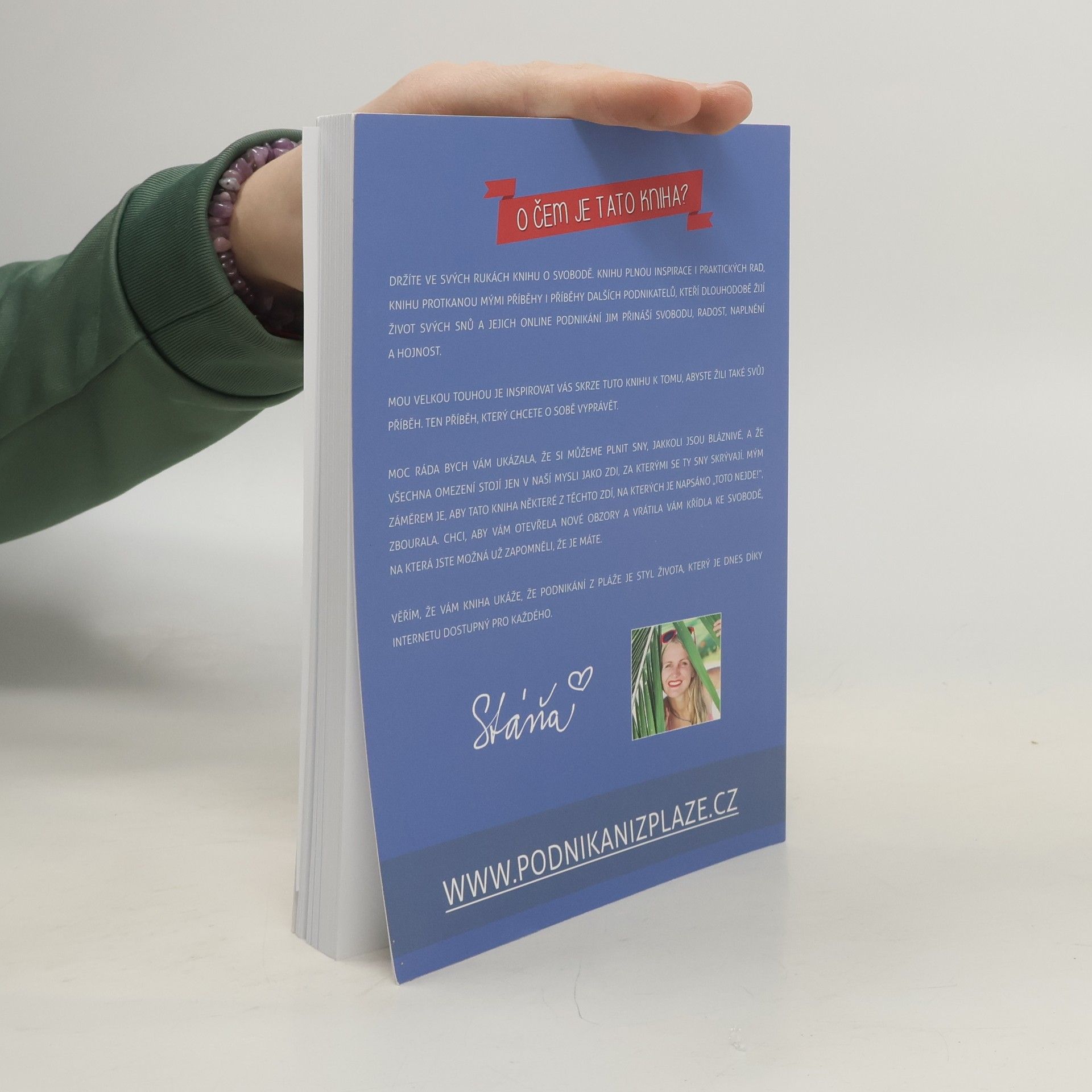 Nové, aktualizované a rozšířené vydání z roku 2020. Autorka o své knize píše: Je to pár let, co jsem žila na okraji zaprášeného sídliště v Havířově. V srdci jsem měla veliké sny o tom, jak procestuji svět, navštívím Himaláje, prožiju zimy na Bali a ukážu svým dětem krásy života. Realita byla ale dost jiná. Dvě maličké děti, krachující stavební firma i manželství a v peněžence pár korun. Bylo mi 26 let a měla jsem pocit, že jsem odsouzena k životu, který absolutně nemá smysl. Jaký má totiž smysl život, ve kterém není místo pro lásku, svobodu a splněné sny? Jaký smysl má žít život, ve kterém má člověk pořád strach, jak vyjde s penězi další měsíc? Jaký smysl má ukazovat dětem život, ve kterém já nejsem šťastná? Budou jednou šťastné ony? Rozhodla jsem se to změnit. O náročné proměně mého života, mých krocích do neznáma, vypořádávání se se strachem, stejně jako o tom, jak jsem díky tomu došla až ke životu, který žiju dnes, je právě moje kniha Podnikání z pláže.
