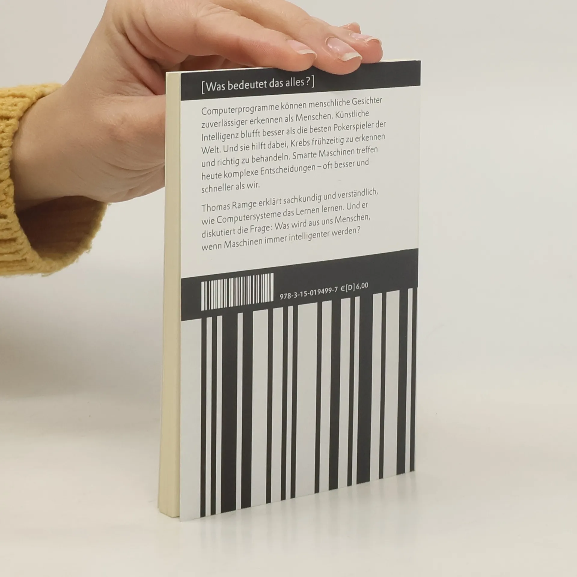 Computerprogramme können menschliche Gesichter zuverlässiger erkennen als Menschen. Sie schlagen uns im Brettspiel Go, das strategisches Denken und Intuition erfordert, und sie bluffen besser als die besten Pokerspieler der Welt. Maschinen treffen komplexe Entscheidungen – oft besser und schneller als wir. Thomas Ramge erklärt sachkundig und verständlich, wie Maschinen dabei sind, das Lernen zu lernen und diskutiert die Frage: Was wird aus uns Menschen, wenn smarte Maschinen immer intelligenter werden?