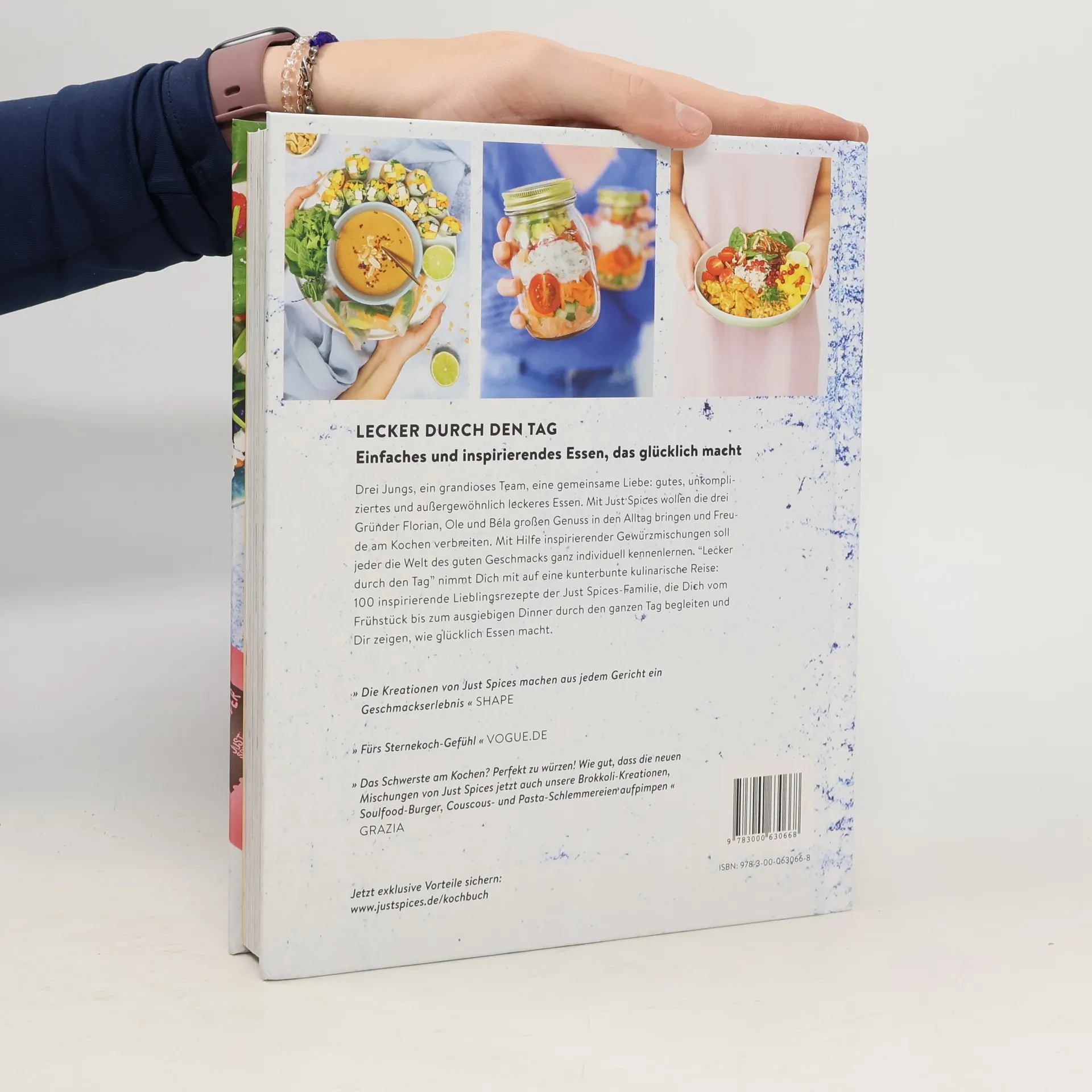 3 Jungs, ein grandioses Team, eine gemeinsame Liebe: Gutes, unkompliziertes und außergewöhnlich leckeres Essen. Mit Just Spices wollen die drei Gründer Florian, Ole und Béla großen Genuss in den Alltag bringen und Freude am Kochen verbreiten. Mit Hilfe inspirierender Gewürzmischungen soll jeder die Welt des guten Geschmacks ganz individuell kennenlernen. ‘Lecker durch den ganzen Tag’ nimmt Dich mit auf eine kunterbunte kulinarische Reise: 100 inspirierende Lieblingsrezepte der Just Spices Familie, die Dich vom Frühstück bis zum ausgiebigen Dinner durch den ganzen Tag begleiten und Dir zeigen, wie Essen glücklich macht.