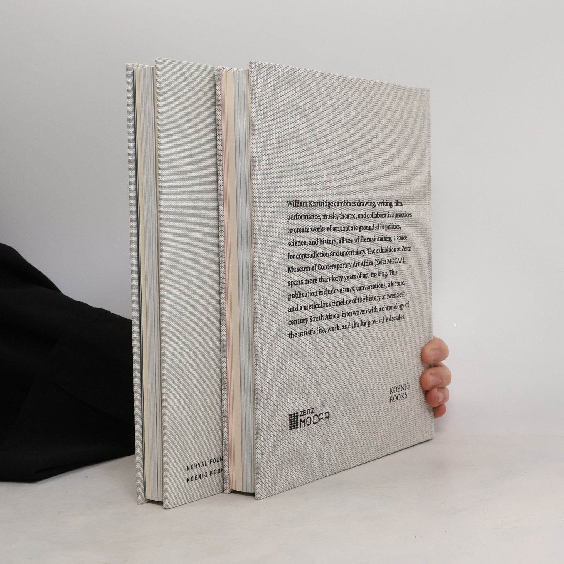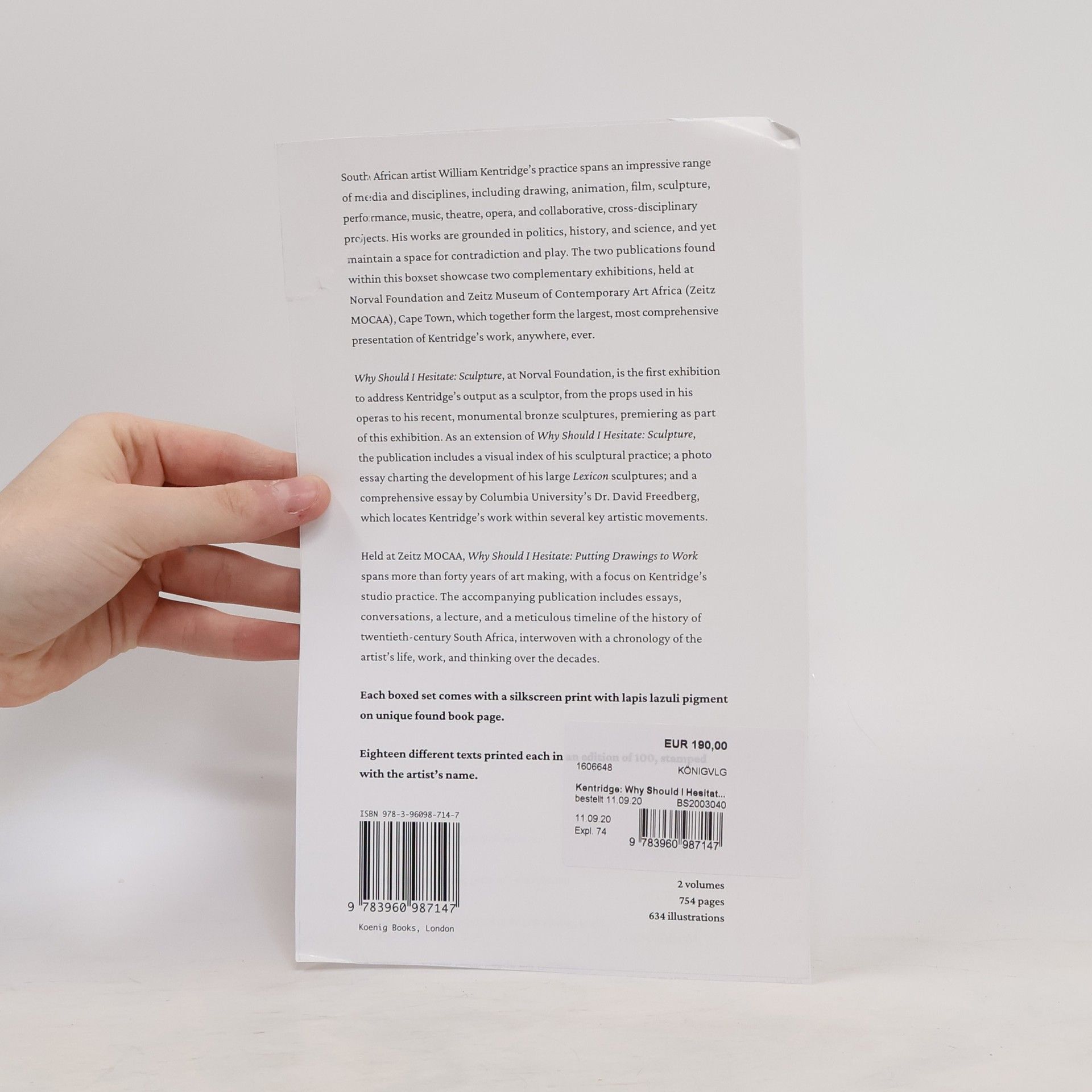 South African artist William Kentridge's practice spans an impressive range of medias and disciplines, including drawing, animation, film, sculpture, performance, music, theatre, opera, and collaborative, cross-disciplinary projects. His works are grounded in politics, history, and science, and yet maintain a space for contradiction and play. The two publications found within this boxset showcase two complimentary exhibitions, which together form the largest, most comprehensive presentation of Kentridge's work, anywhere, ever. The first volume includes essays, conversations, a lecture, and a meticulous timeline of the history of twentieth-century South Africa, interwoven with a chronology of the artist's life, work, and thinking over the decades. The second volume includes a visual index of William Kentridge's sculptural practice; a photo essay charting the development of his large Lexicon sculptures; and a comprehensive essay by Columbia University's Dr. David Freedberg, which locates Kentridge's work within several key artistic movements. Enclosed in every publication is one unique silkscreen print with Lapislazuli on found book page. In total 18 different motives exist, which are each stamped by William Kentridge