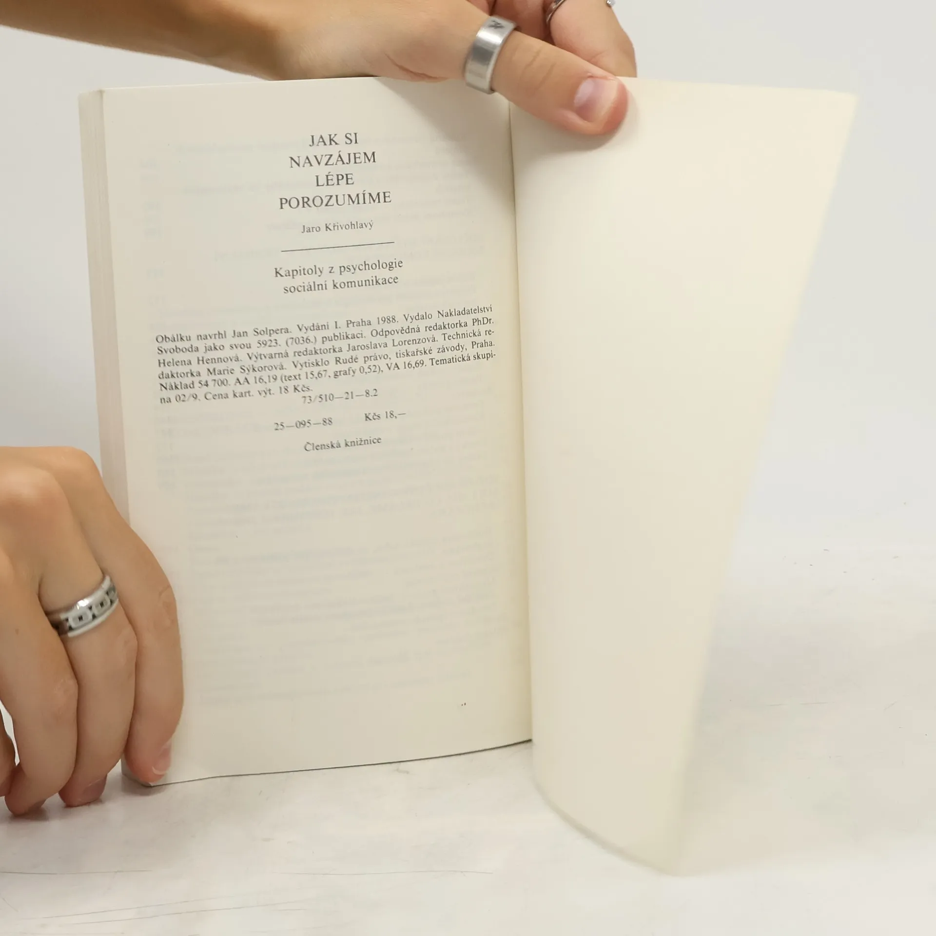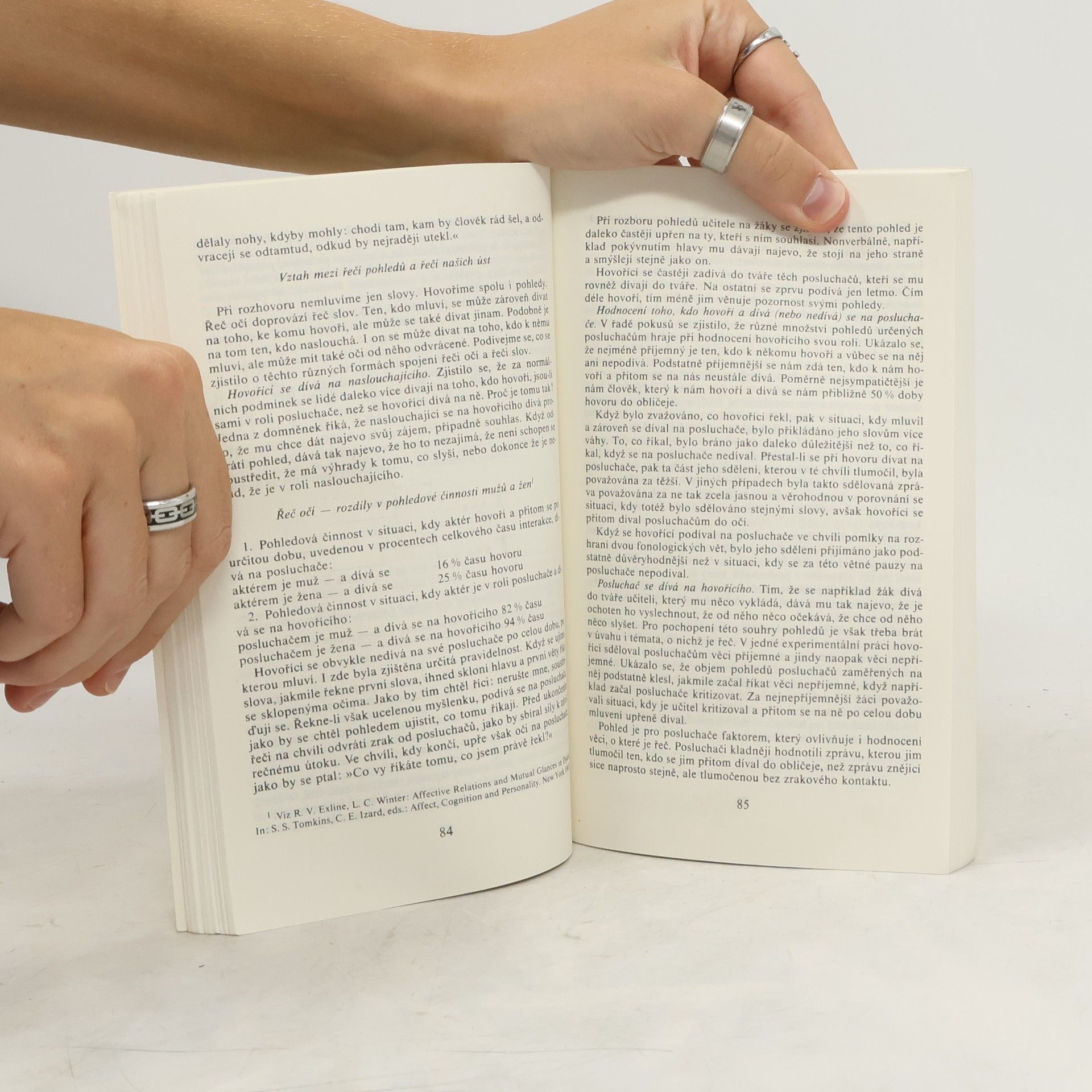 Tato publikace pojednává o tom, co se děje v situacích, kdy se jeden člověk setkává s druhým — když se setkají poprvé i když se setkávají častěji. Jejím předmětem je sociální styk člověka s člověkem a zvláště pak jeho komunikační stránka, tj. to, jak si spolu navzájem slovně i beze slov sdělujeme mnohé — informace, postoje, emoce, svá sebepojetí atp. Důraz je zde položen na mimoslovní způsoby sdělování, tj. na to, co si »říkáme« pohledy, výrazem obličeje, přiblížením či odstupem, pohledy, gesty i »tónem« hlasu. Umění naslouchat je při tom záměrně věnováno podstatně více pozornosti než umění mluvit. Mluvit se učíme odmalička. Kdy a kde se však učíme »vyčíst« z pohledu to, co ten, s nímž jsme se setkali, nám chce vlastně říci, co se v něm děje?