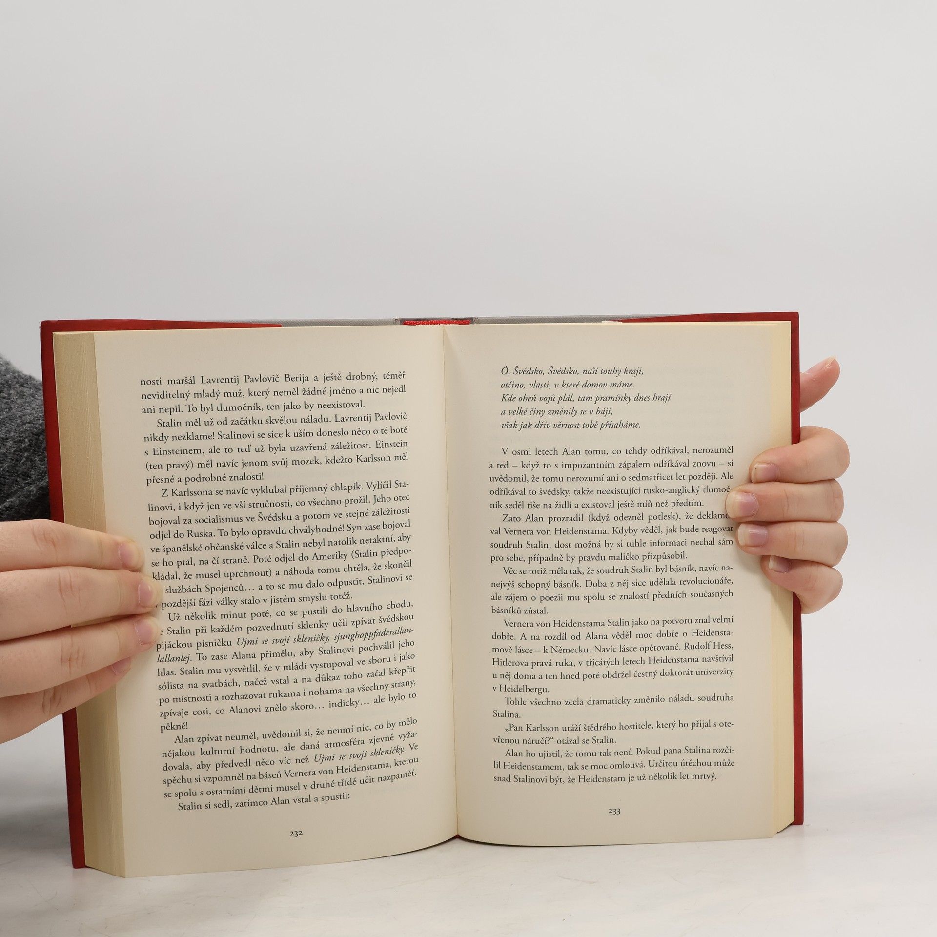 V den, kdy se mají v přítomnosti různých hodnostářů slavit jeho sté narozeniny, vyleze Alan Karlsson z okna domova důchodců, a jak praví název knihy, zmizí. Zatímco je po něm vyhlášeno pátrání, dostane se jako slepý k houslím ke kufru plnému peněz, takže ho začnou honit jak zloději, kterým ho „ukradl“, tak policisté. On se ovšem se svými pronásledovateli postupně spřátelí, takže vše dopadne úplně jinak, než čtenář očekává. Druhá dějová rovina mapuje Alanovy předešlé osudy, a tudíž i celé dějiny Švédska, Evropy a světa v průběhu dvacátého století. Jakkoli je totiž Alan člověk veskrze apolitický, během svého úctyhodně dlouhého života se setkal snad se všemi významnými politiky – od Harryho Trumana, přes Mao Ce-tunga, Churchilla, Stalina, de Gaulla až po Kim Ir-sena – a navíc bezděčně ovlivnil významné historické události (např. sestrojení atomové bomby). Jak patrno, má přímo cimrmanovské rysy. Stoletý stařík, který vylezl z okna a zmizel je kniha duchaplná, inteligentní a také velmi vtipná a zábavná. Švédsky vyšla poprvé na podzim 2009 a skoro okamžitě se stala čtenářským hitem.