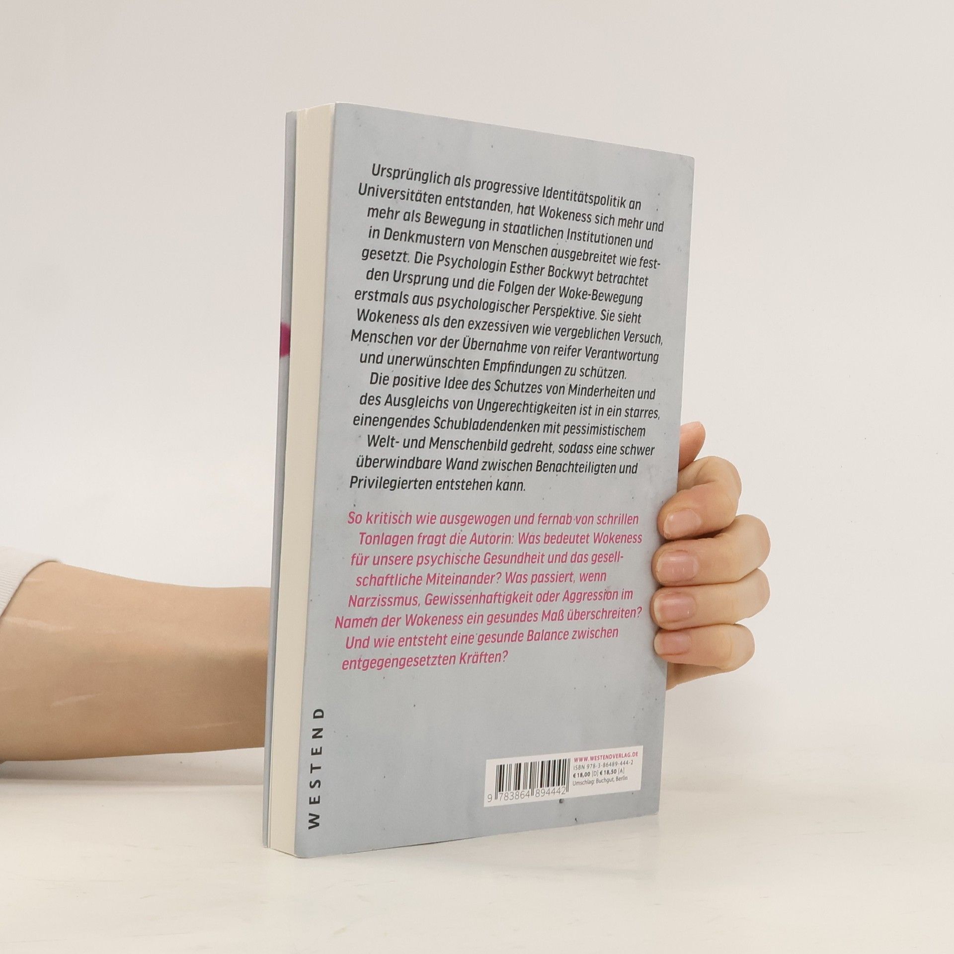 Was als linke Identitätspolitik einst progressiv gedacht war, hat längst die Schwelle zu einer militanten Ideologie überschritten, analysiert die Psychologin Esther Bockwyt. Auf Basis einer pauschalen Einteilung von Menschen in Opfergruppen und Privilegierte wird abgeleitet, wer was wann sagen oder tun darf. So kritisch wie ausgewogen und vor allem fernab der schrillen Tonlagen des Feuilletons erfasst Bockwyt das Thema Wokeness erstmals aus psychologischer Perspektive und fragt: Wie ist eine „woke Psyche“ verfasst, wenn Narzissmus, Gewissenhaftigkeit oder Aggression ein gesundes Maß überschreiten? Wie entsteht im Zusammenspiel mit Gruppendynamiken überhöhte Meinungskontrolle, die zur Cancel Culture, also dem Boykott von Personen, Gruppen oder Kultur, führen kann?