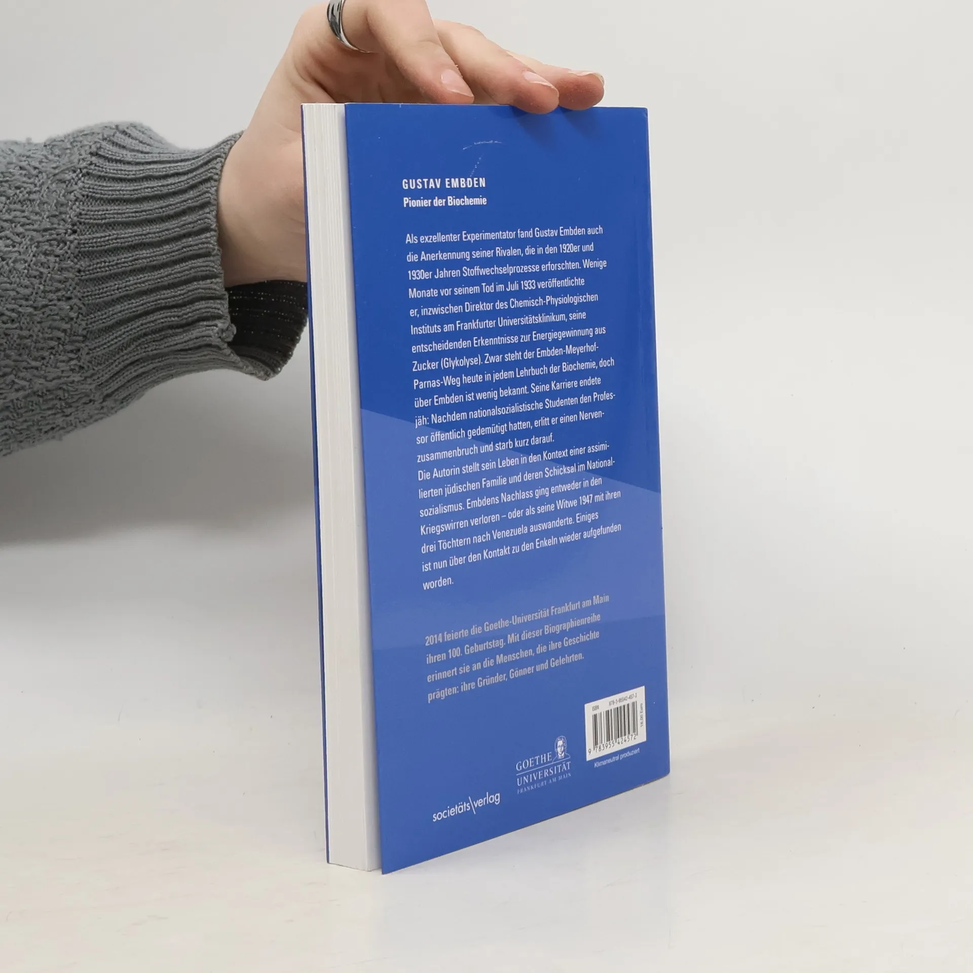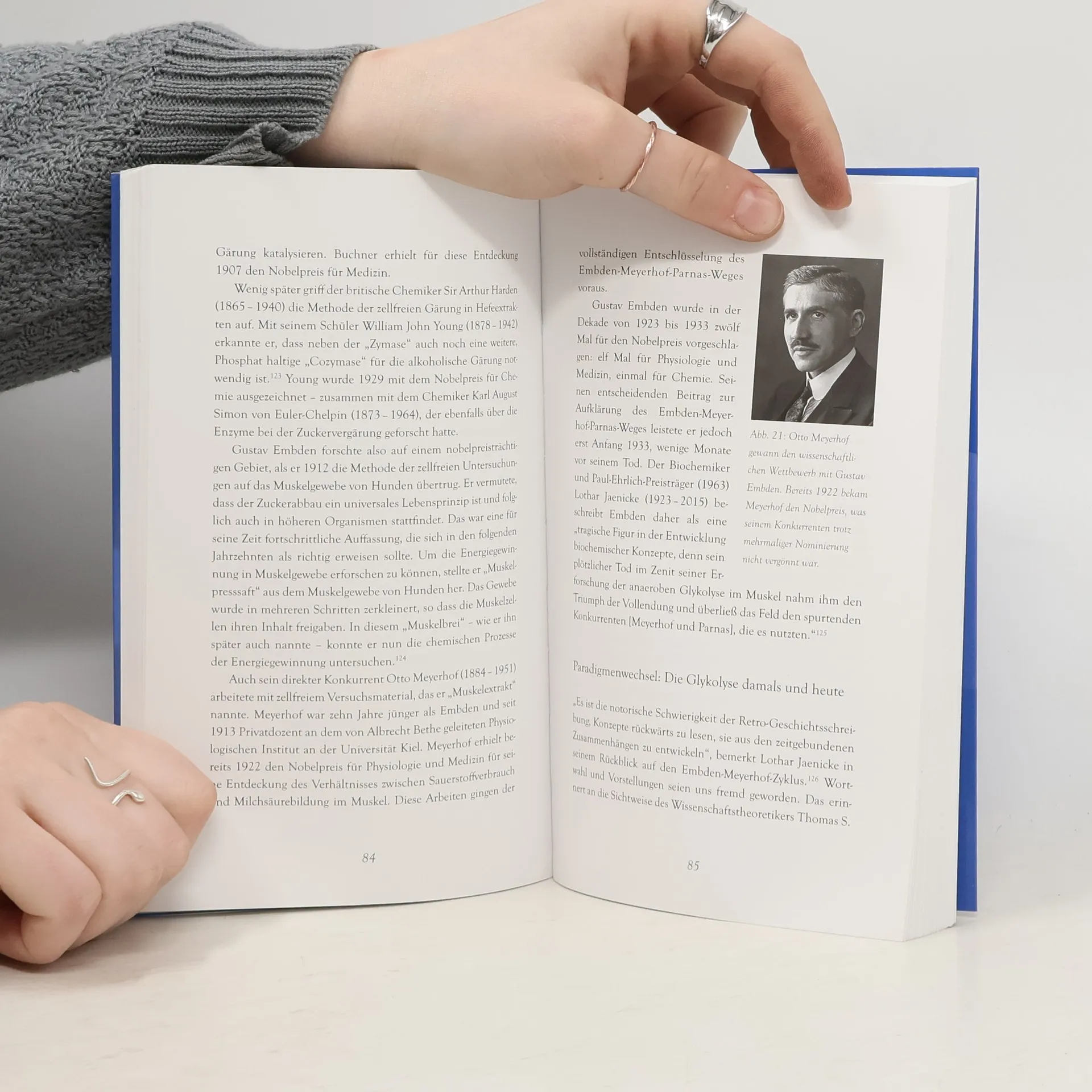 Wenige Monate vor seinem Tod im Juli 1933 veröffentlichte Gustav Embden seine entscheidenden Erkenntnisse über den ersten Stoffwechselweg, der vollständig entschlüsselt wurde. Der Embden-Meyerhof-Parnas-Weg steht heute in jedem Lehrbuch der Biochemie, doch über den Namensgeber ist wenig bekannt. Nachdem ihn nationalsozialistische Studenten öffentlich gedemütigt hatten, erlitt er einen Nervenzusammenbruch und starb kurz darauf in einer Nervenheilanstalt. Embdens Nachlass ging entweder in den Kriegswirren verloren oder als die Witwe 1947 mit ihren drei Töchter nach Venezuela auswanderte. Der Autorin ist es jedoch gelungen, die Enkel Gustav Embdens ausfindig zu machen und sie über ihre Erinnerungen zu befragen.
