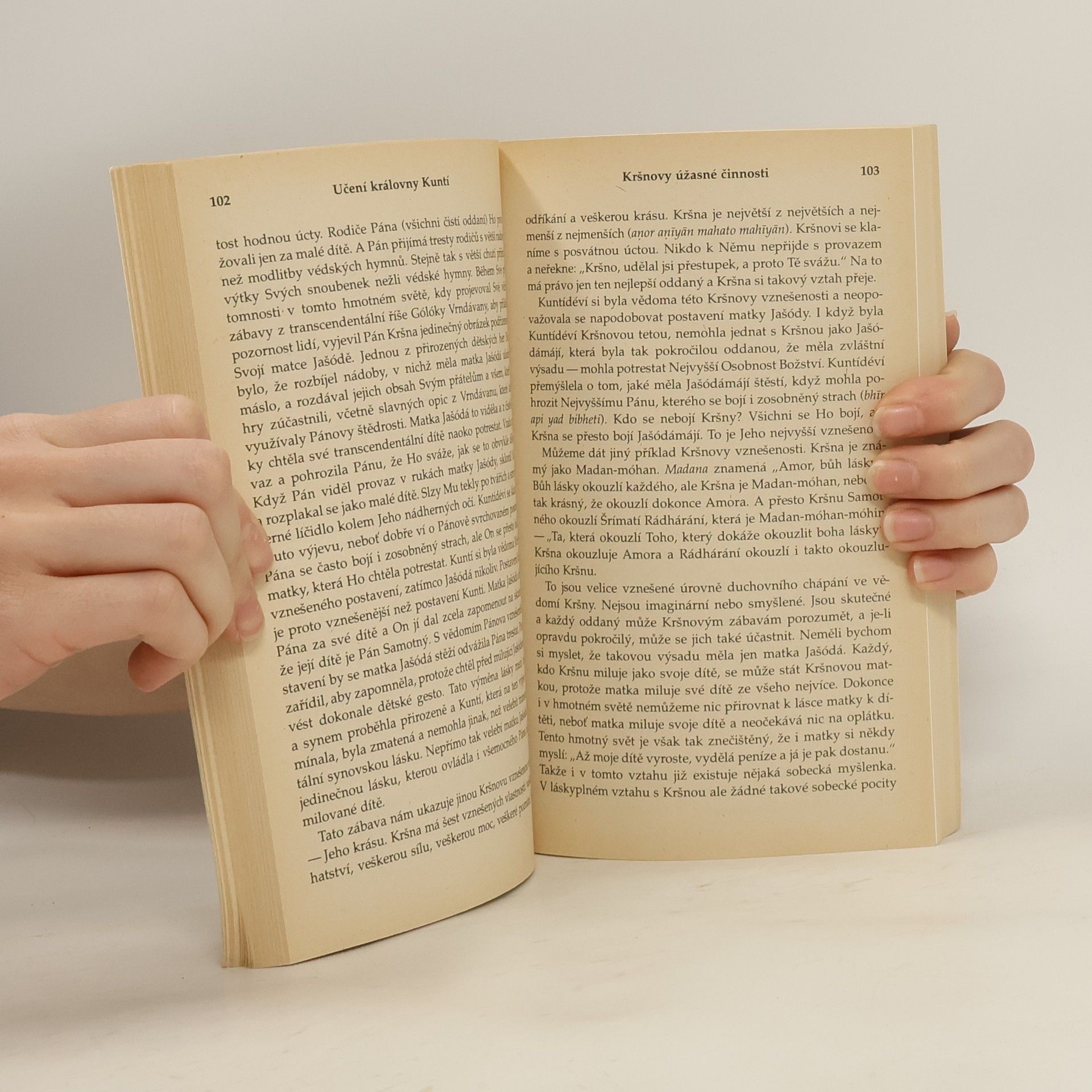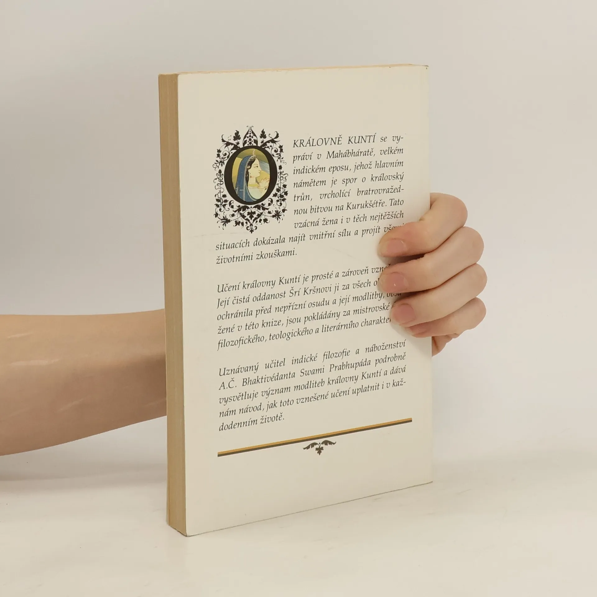 Na cestě ke Kršnovi. O KRÁLOVNĚ KUNTÍ se vypráví v Mahábháratě, velkém indickém eposu, jehož hlavním námětem je spor o královský trůn, vrcholící bratrovražednou bitvou na Kurukšétře. Tato vzácná žena i v těch nejtěžších situacích dokázala najít vnitřní sílu a projít všemi životními zkouškami. Učení královny Kuntí je prosté a zároveň vznešené. Její čistá oddanost Šrí Kršnovi ji za všech okolností ochránila před nepřízní osudu a její modlitby, obsažené v této knize, jsou pokládány za mistrovské dílo filozofického, teologického a literárního charakteru. Uznávaný učitel indické filozofie a náboženství A. Č. Bhaktivédanta Swami Prabhupáda podrobně vysvětluje význam modliteb královny Kuntí a dává nám návod, jak toto vznešené učení uplatnit i v každodenním životě.