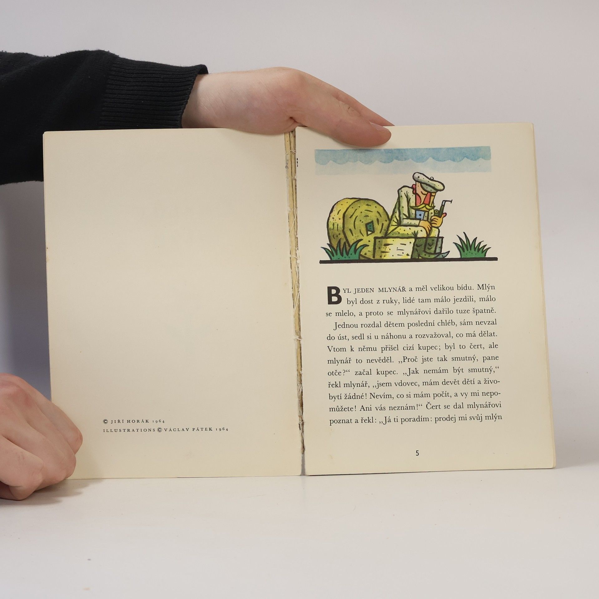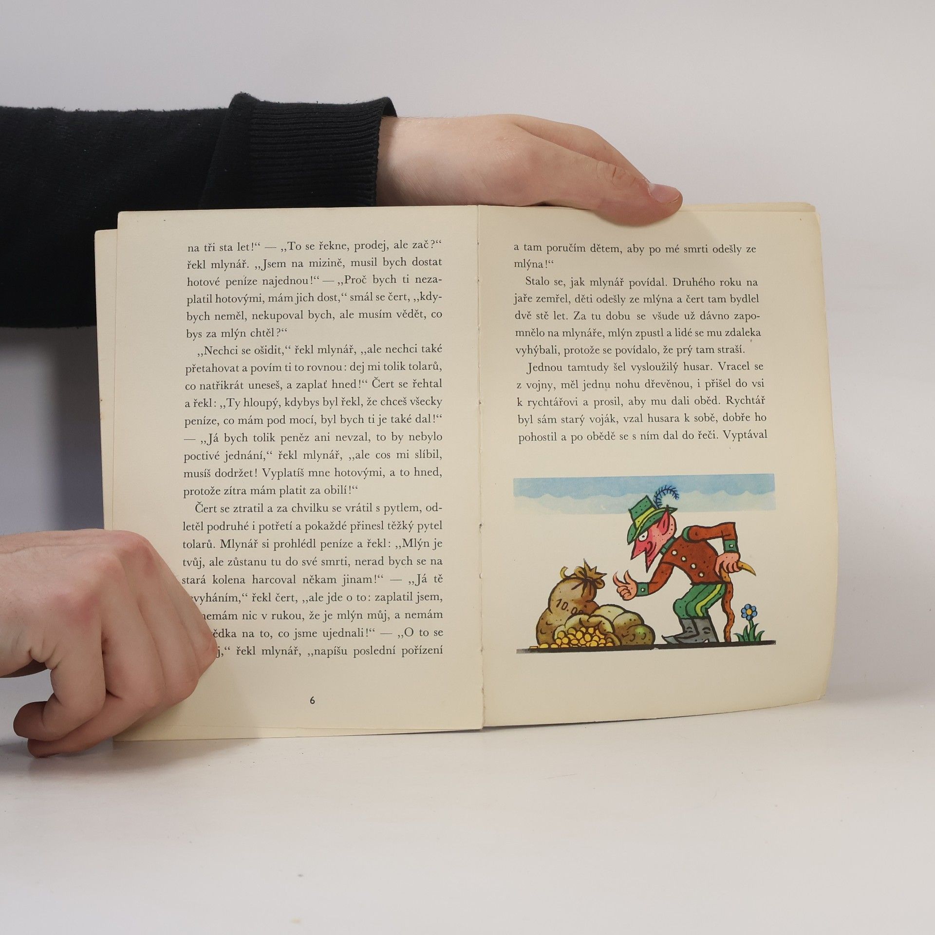 Dvě pestře ilustrované pohádky, první o husarovi, který přemohl čerta a stal se majitelem jeho mlýna, druhá o ševci, jenž v pekle za kus masa získal divotvorný ubrus, kohouta a hole