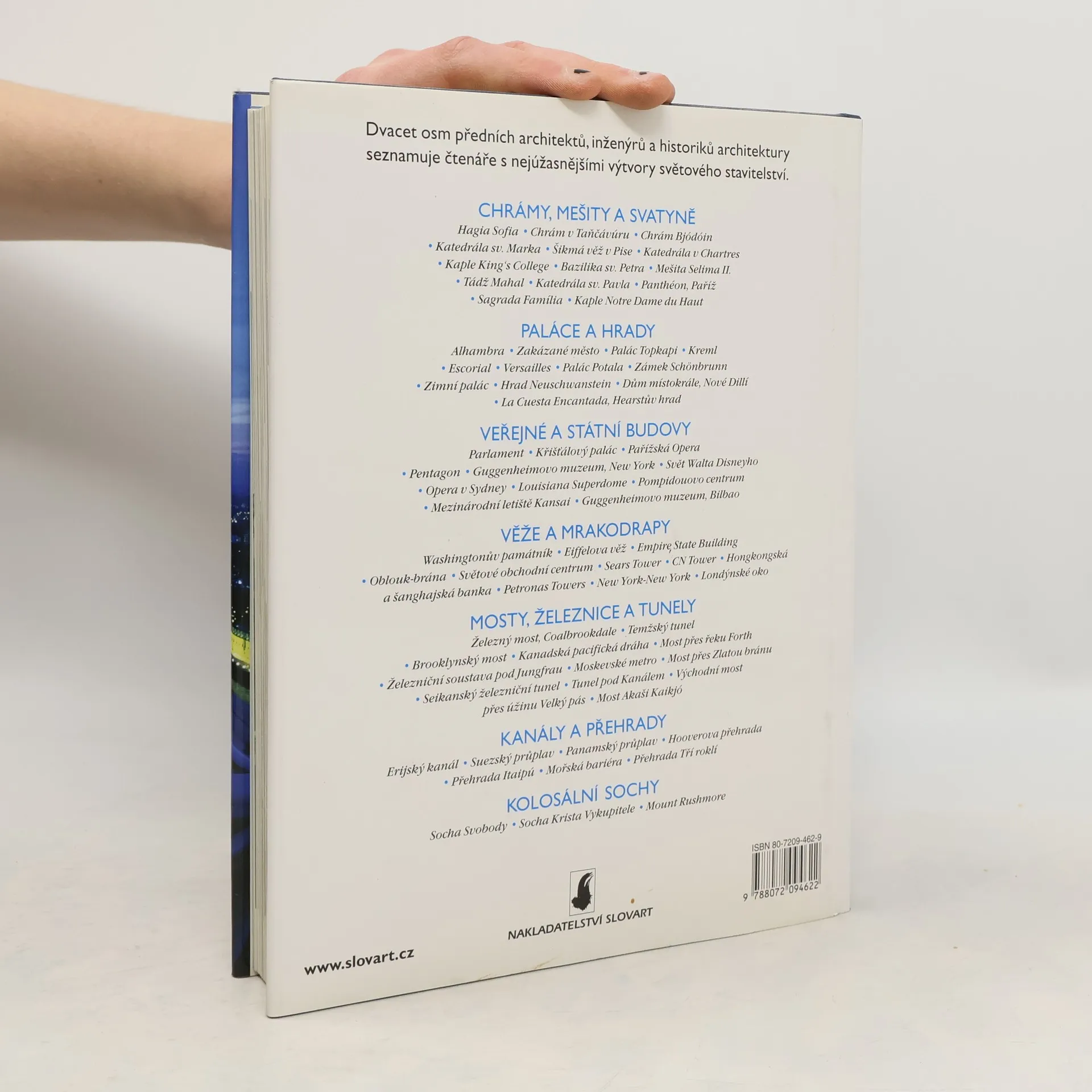 Dvacet osm předních světových architektů, inženýrů a historiků seznamuje čtenáře s nejúžasnějšími výtvory světového stavitelství (chrámy, mešity a svatyně, paláce a hrady, veřejné a státní budovy, věže a mrakodrapy, mosty, železnice a tunely, kanály a přehrady, kolosální sochy).
