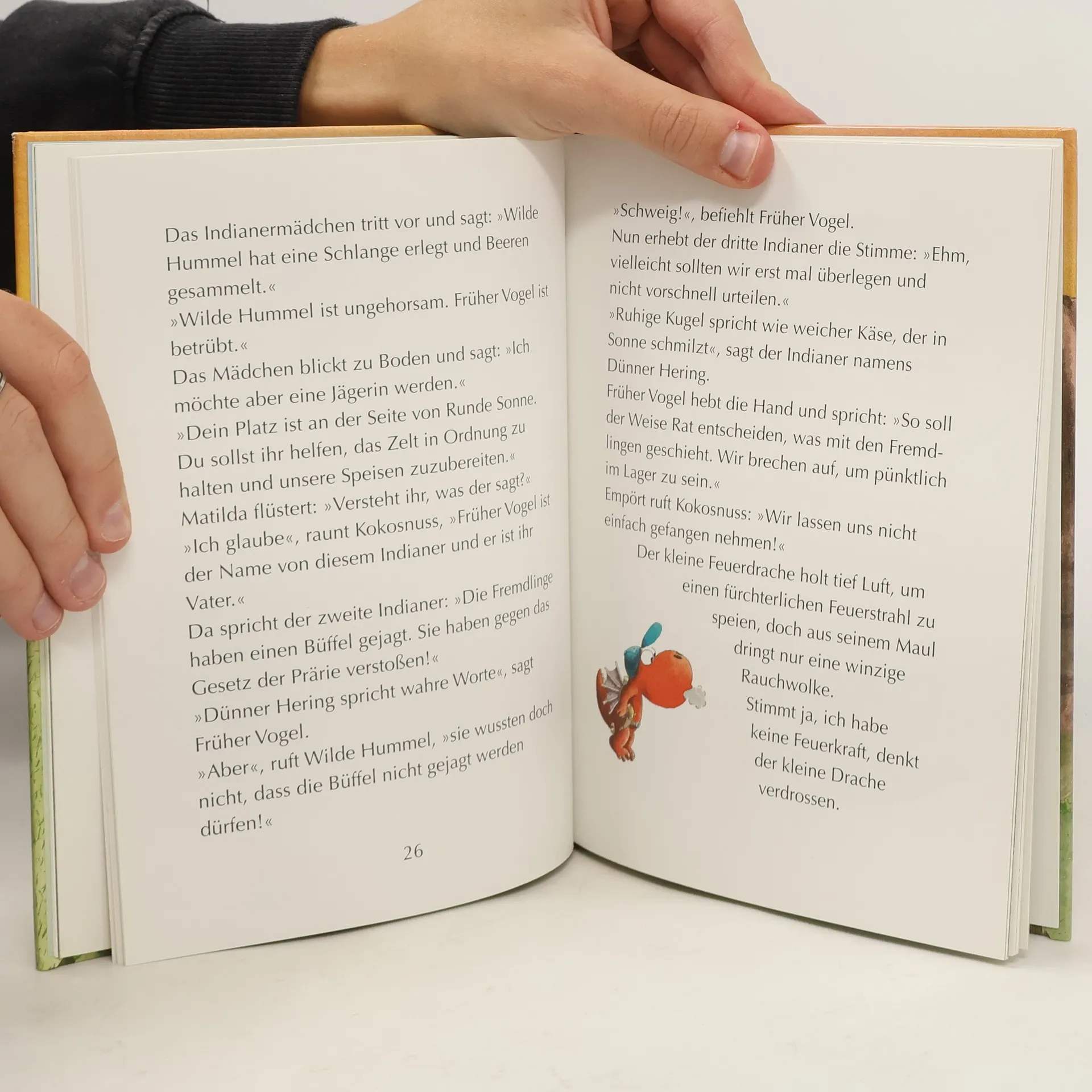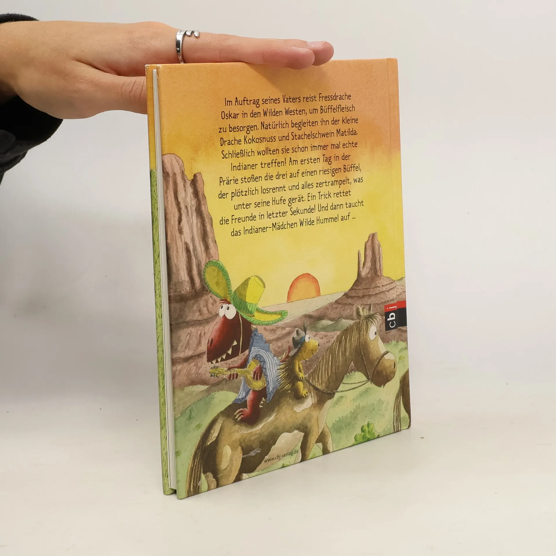 Der kleine Drache Kokosnuss im Wilden Westen Fressdrache Oskar soll für seinen Vater Büffelfleisch besorgen und bittet den Drachen Kokosnuss und das Stachelschwein Matilda, ihn in den Wilden Westen zu begleiten. In der Prärie stoßen die drei tatsächlich auf eine riesige Büffelherde. Als die riesigen Tiere plötzlich losrennen und alles zertrampeln, was unter ihre Hufe gerät, rettet das Indianer-Mädchen »Wilde Hummel« die drei »Greenhorns« in letzter Sekunde. Aber da taucht schon die nächste Gefahr auf: drei finster dreinblickende Indianer, die alle an den Marterpfahl binden, die Indianerland betreten … Doch das sind nicht die einzigen Abenteuer, die Kokosnuss und seine Freunde bestehen müssen. Die Geschichten über die aufregenden Abenteuer, die der kleine Drache Kokosnuss mit seinen Freunden erlebt, sind inzwischen wahre Kinderbuchklassiker. Ingo Siegner schreibt über Freundschaft und Mut und fügt liebenswert-originelle Illustrationen hinzu. Die »Dein-Spiegel-Bestseller«-Reihe eignet sich perfekt zum Vor- und Selberlesen. Ausstattung: Mit fbg. Illustrationen