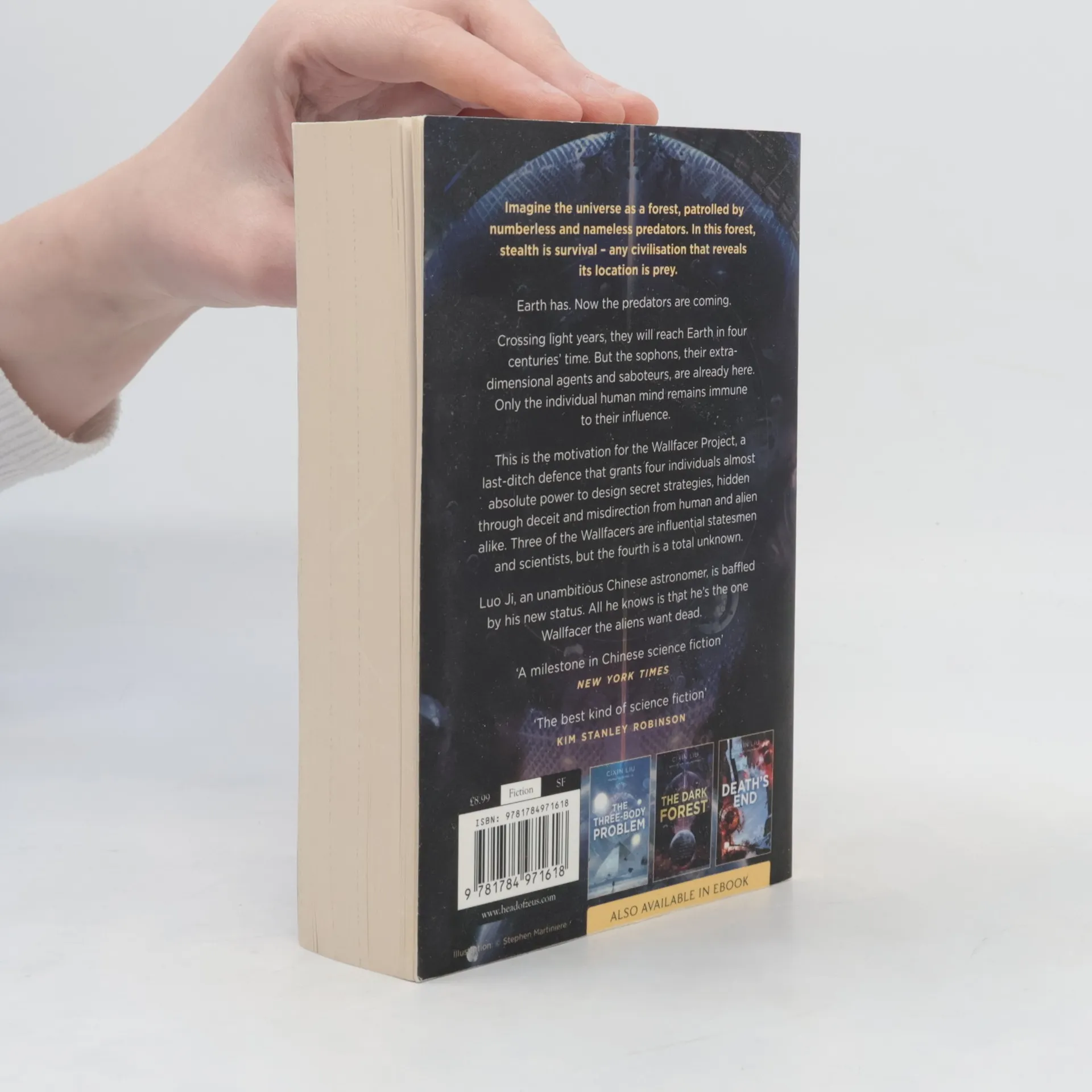 Imagine the universe as a forest, patrolled by numberless and nameless predators. In this forest, stealth is survival – any civilisation that reveals its location is prey. Earth has. Now the predators are coming. Crossing light years, they will reach Earth in four centuries' time. But the sophons, their extra-dimensional agents and saboteurs, are already here. Only the individual human mind remains immune to their influence. This is the motivation for the Wallfacer Project, a last-ditch defence that grants four individuals almost absolute power to design secret strategies, hidden through deceit and misdirection from human and alien alike. Three of the Wallfacers are influential statesmen and scientists, but the fourth is a total unknown. Luo Ji, an unambitious Chinese astronomer, is baffled by his new status. All he knows is that he's the one Wallfacer that Trisolaris wants dead.