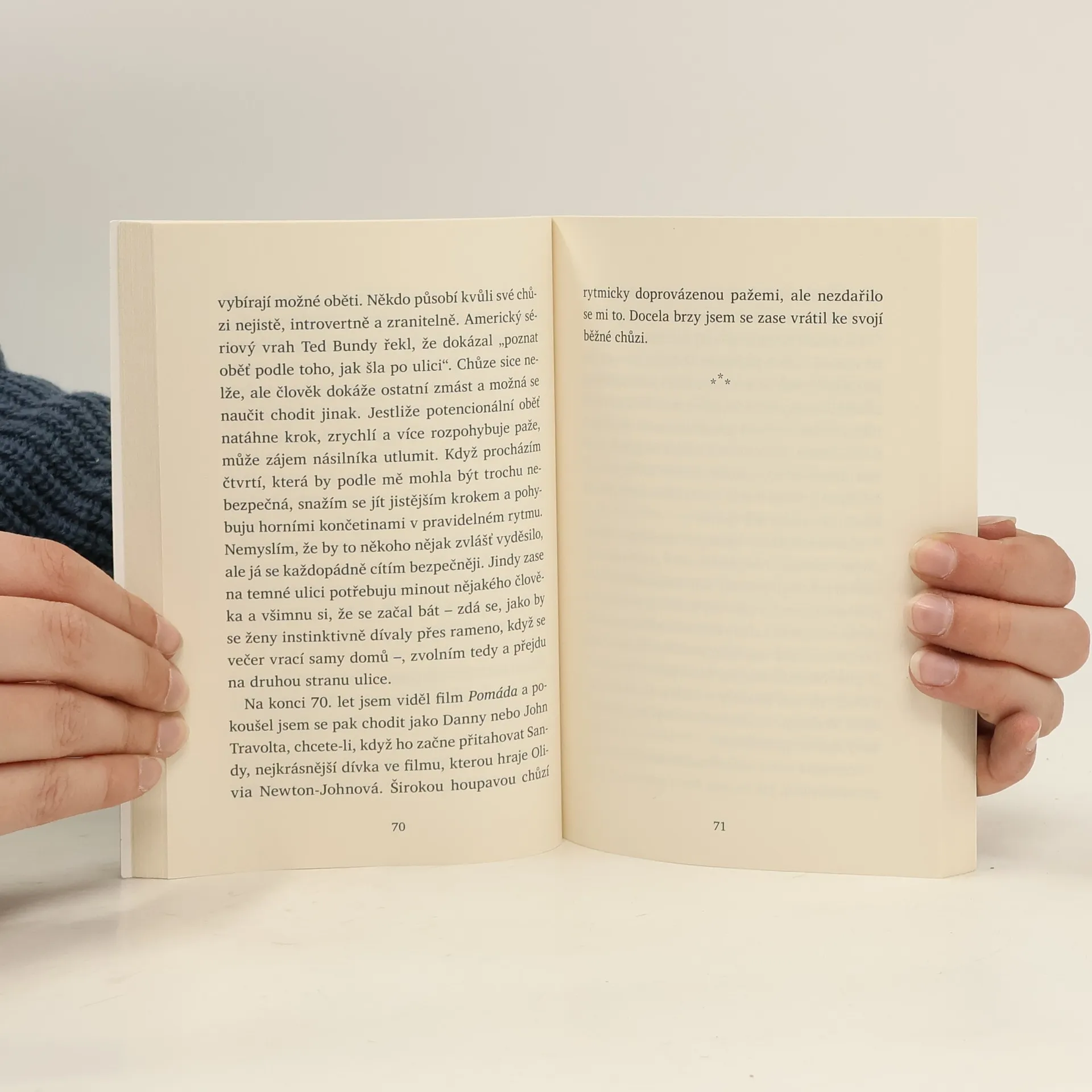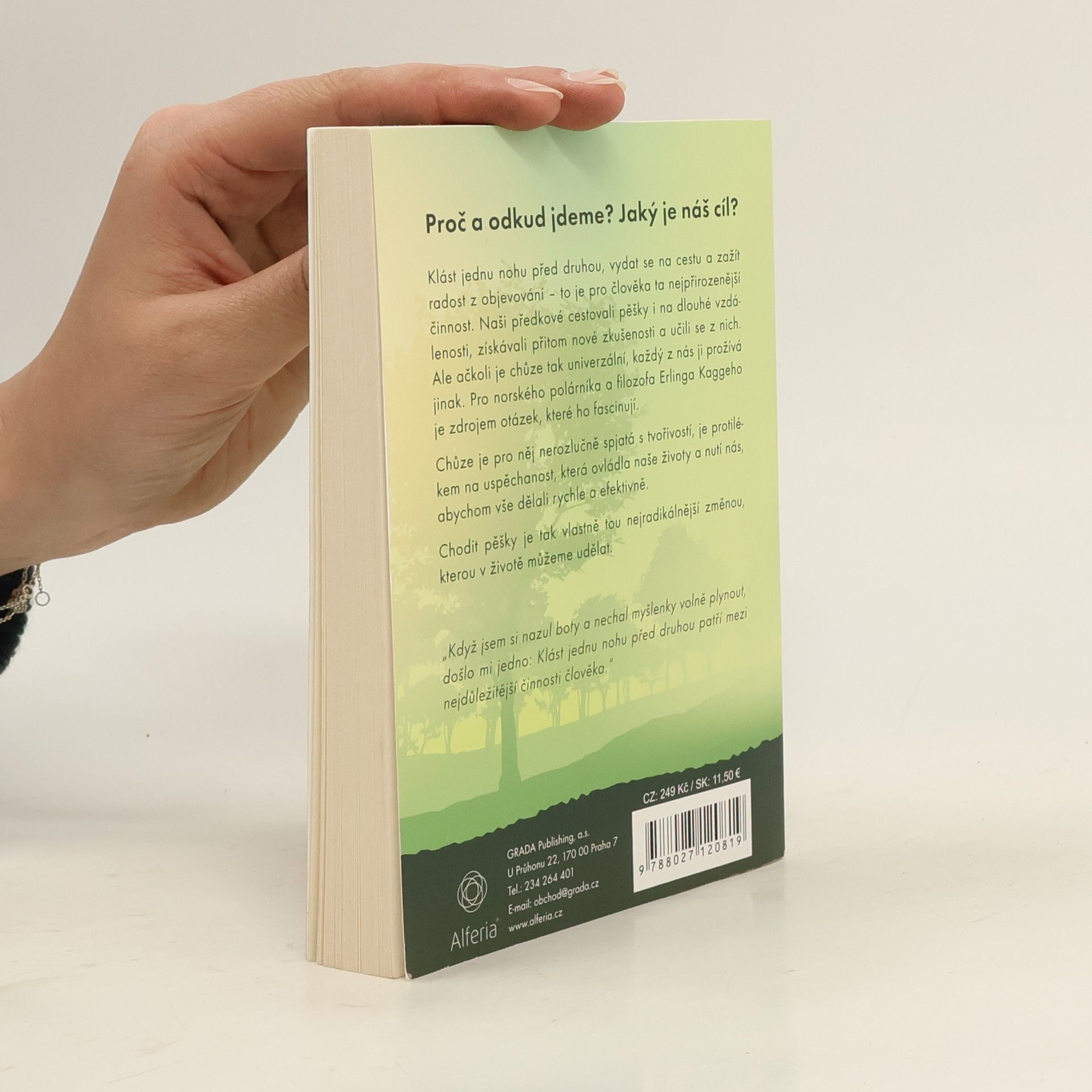 Klást jednu nohu před druhou, vydat se na cestu a zažít radost z objevování – to je pro člověka ta nejpřirozenější činnost. Naši předkové cestovali pěšky i na dlouhé vzdálenosti, získávali přitom nové zkušenosti a učili se z nich. Ale ačkoli je chůze tak univerzální, každý z nás ji prožívá jinak. Pro norského polárníka a filozofa Erlinga Kaggeho je zdrojem otázek, které ho fascinují. Chůze je pro něj nerozlučně spjatá s tvořivostí, je protilékem na uspěchanost, která ovládla naše životy a nutí nás, abychom vše dělali rychle a efektivně. Chodit pěšky je tak vlastně tou nejradikálnější změnou, kterou v životě můžeme udělat. Když jsem si nazul boty a nechal myšlenky volně plynout, došlo mi jedno: Klást jednu nohu před druhou patří mezi nejdůležitější činnosti člověka.